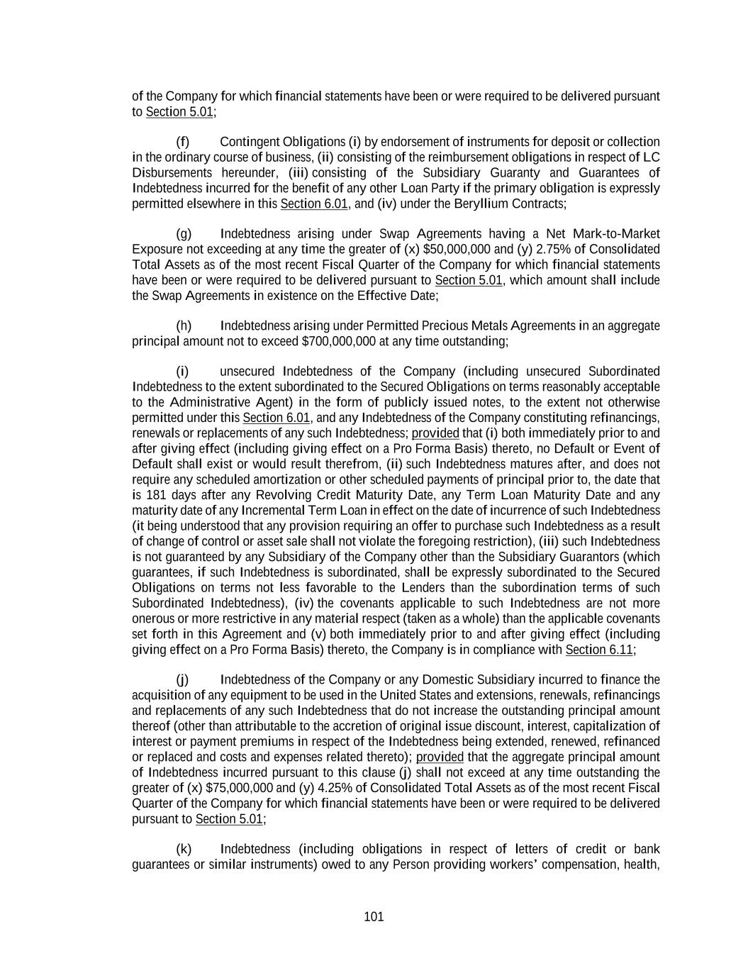 101 of the Company for which financial statements have been or were required to be delivered pursuant to Section 5.01; (f) Contingent Obligations (i) by endorsement of instruments for deposit or collection in the ordinary course of business, (ii) consisting of the reimbursement obligations in respect of LC Disbursements hereunder, (iii) consisting of the Subsidiary Guaranty and Guarantees of Indebtedness incurred for the benefit of any other Loan Party if the primary obligation is expressly permitted elsewhere in this Section 6.01, and (iv) under the Beryllium Contracts; (g) Indebtedness arising under Swap Agreements having a Net Mark-to-Market Exposure not exceeding at any time the greater of (x) $50,000,000 and (y) 2.75% of Consolidated Total Assets as of the most recent Fiscal Quarter of the Company for which financial statements have been or were required to be delivered pursuant to Section 5.01, which amount shall include the Swap Agreements in existence on the Effective Date; (h) Indebtedness arising under Permitted Precious Metals Agreements in an aggregate principal amount not to exceed $700,000,000 at any time outstanding; (i) unsecured Indebtedness of the Company (including unsecured Subordinated Indebtedness to the extent subordinated to the Secured Obligations on terms reasonably acceptable to the Administrative Agent) in the form of publicly issued notes, to the extent not otherwise permitted under this Section 6.01, and any Indebtedness of the Company constituting refinancings, renewals or replacements of any such Indebtedness; provided that (i) both immediately prior to and after giving effect (including giving effect on a Pro Forma Basis) thereto, no Default or Event of Default shall exist or would result therefrom, (ii) such Indebtedness matures after, and does not require any scheduled amortization or other scheduled payments of principal prior to, the date that is 181 days after any Revolving Credit Maturity Date, any Term Loan Maturity Date and any maturity date of any Incremental Term Loan in effect on the date of incurrence of such Indebtedness (it being understood that any provision requiring an offer to purchase such Indebtedness as a result of change of control or asset sale shall not violate the foregoing restriction), (iii) such Indebtedness is not guaranteed by any Subsidiary of the Company other than the Subsidiary Guarantors (which guarantees, if such Indebtedness is subordinated, shall be expressly subordinated to the Secured Obligations on terms not less favorable to the Lenders than the subordination terms of such Subordinated Indebtedness), (iv) the covenants applicable to such Indebtedness are not more onerous or more restrictive in any material respect (taken as a whole) than the applicable covenants set forth in this Agreement and (v) both immediately prior to and after giving effect (including giving effect on a Pro Forma Basis) thereto, the Company is in compliance with Section 6.11; (j) Indebtedness of the Company or any Domestic Subsidiary incurred to finance the acquisition of any equipment to be used in the United States and extensions, renewals, refinancings and replacements of any such Indebtedness that do not increase the outstanding principal amount thereof (other than attributable to the accretion of original issue discount, interest, capitalization of interest or payment premiums in respect of the Indebtedness being extended, renewed, refinanced or replaced and costs and expenses related thereto); provided that the aggregate principal amount of Indebtedness incurred pursuant to this clause (j) shall not exceed at any time outstanding the greater of (x) $75,000,000 and (y) 4.25% of Consolidated Total Assets as of the most recent Fiscal Quarter of the Company for which financial statements have been or were required to be delivered pursuant to Section 5.01; (k) Indebtedness (including obligations in respect of letters of credit or bank guarantees or similar instruments) owed to any Person providing workers’ compensation, health,