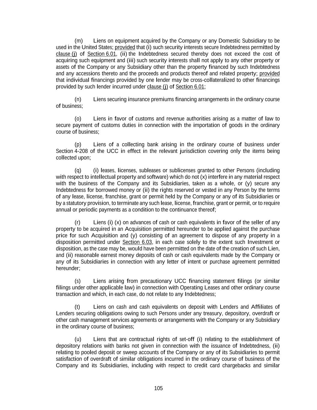 105 (m) Liens on equipment acquired by the Company or any Domestic Subsidiary to be used in the United States; provided that (i) such security interests secure Indebtedness permitted by clause (j) of Section 6.01, (ii) the Indebtedness secured thereby does not exceed the cost of acquiring such equipment and (iii) such security interests shall not apply to any other property or assets of the Company or any Subsidiary other than the property financed by such Indebtedness and any accessions thereto and the proceeds and products thereof and related property; provided that individual financings provided by one lender may be cross-collateralized to other financings provided by such lender incurred under clause (j) of Section 6.01; (n) Liens securing insurance premiums financing arrangements in the ordinary course of business; (o) Liens in favor of customs and revenue authorities arising as a matter of law to secure payment of customs duties in connection with the importation of goods in the ordinary course of business; (p) Liens of a collecting bank arising in the ordinary course of business under Section 4-208 of the UCC in effect in the relevant jurisdiction covering only the items being collected upon; (q) (i) leases, licenses, subleases or sublicenses granted to other Persons (including with respect to intellectual property and software) which do not (x) interfere in any material respect with the business of the Company and its Subsidiaries, taken as a whole, or (y) secure any Indebtedness for borrowed money or (ii) the rights reserved or vested in any Person by the terms of any lease, license, franchise, grant or permit held by the Company or any of its Subsidiaries or by a statutory provision, to terminate any such lease, license, franchise, grant or permit, or to require annual or periodic payments as a condition to the continuance thereof; (r) Liens (i) (x) on advances of cash or cash equivalents in favor of the seller of any property to be acquired in an Acquisition permitted hereunder to be applied against the purchase price for such Acquisition and (y) consisting of an agreement to dispose of any property in a disposition permitted under Section 6.03, in each case solely to the extent such Investment or disposition, as the case may be, would have been permitted on the date of the creation of such Lien, and (ii) reasonable earnest money deposits of cash or cash equivalents made by the Company or any of its Subsidiaries in connection with any letter of intent or purchase agreement permitted hereunder; (s) Liens arising from precautionary UCC financing statement filings (or similar filings under other applicable law) in connection with Operating Leases and other ordinary course transaction and which, in each case, do not relate to any Indebtedness; (t) Liens on cash and cash equivalents on deposit with Lenders and Affiliates of Lenders securing obligations owing to such Persons under any treasury, depository, overdraft or other cash management services agreements or arrangements with the Company or any Subsidiary in the ordinary course of business; (u) Liens that are contractual rights of set-off (i) relating to the establishment of depository relations with banks not given in connection with the issuance of Indebtedness, (ii) relating to pooled deposit or sweep accounts of the Company or any of its Subsidiaries to permit satisfaction of overdraft of similar obligations incurred in the ordinary course of business of the Company and its Subsidiaries, including with respect to credit card chargebacks and similar