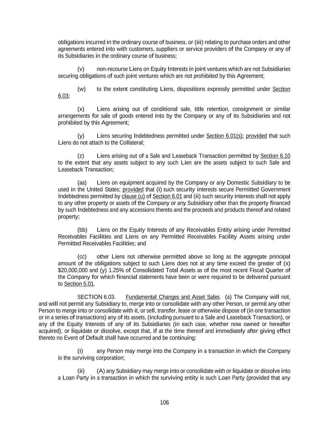 106 obligations incurred in the ordinary course of business, or (iii) relating to purchase orders and other agreements entered into with customers, suppliers or service providers of the Company or any of its Subsidiaries in the ordinary course of business; (v) non-recourse Liens on Equity Interests in joint ventures which are not Subsidiaries securing obligations of such joint ventures which are not prohibited by this Agreement; (w) to the extent constituting Liens, dispositions expressly permitted under Section 6.03; (x) Liens arising out of conditional sale, title retention, consignment or similar arrangements for sale of goods entered into by the Company or any of its Subsidiaries and not prohibited by this Agreement; (y) Liens securing Indebtedness permitted under Section 6.01(s); provided that such Liens do not attach to the Collateral; (z) Liens arising out of a Sale and Leaseback Transaction permitted by Section 6.10 to the extent that any assets subject to any such Lien are the assets subject to such Sale and Leaseback Transaction; (aa) Liens on equipment acquired by the Company or any Domestic Subsidiary to be used in the United States; provided that (i) such security interests secure Permitted Government Indebtedness permitted by clause (u) of Section 6.01 and (ii) such security interests shall not apply to any other property or assets of the Company or any Subsidiary other than the property financed by such Indebtedness and any accessions thereto and the proceeds and products thereof and related property; (bb) Liens on the Equity Interests of any Receivables Entity arising under Permitted Receivables Facilities and Liens on any Permitted Receivables Facility Assets arising under Permitted Receivables Facilities; and (cc) other Liens not otherwise permitted above so long as the aggregate principal amount of the obligations subject to such Liens does not at any time exceed the greater of (x) $20,000,000 and (y) 1.25% of Consolidated Total Assets as of the most recent Fiscal Quarter of the Company for which financial statements have been or were required to be delivered pursuant to Section 5.01. SECTION 6.03. Fundamental Changes and Asset Sales. (a) The Company will not, and will not permit any Subsidiary to, merge into or consolidate with any other Person, or permit any other Person to merge into or consolidate with it, or sell, transfer, lease or otherwise dispose of (in one transaction or in a series of transactions) any of its assets, (including pursuant to a Sale and Leaseback Transaction), or any of the Equity Interests of any of its Subsidiaries (in each case, whether now owned or hereafter acquired), or liquidate or dissolve, except that, if at the time thereof and immediately after giving effect thereto no Event of Default shall have occurred and be continuing: (i) any Person may merge into the Company in a transaction in which the Company is the surviving corporation; (ii) (A) any Subsidiary may merge into or consolidate with or liquidate or dissolve into a Loan Party in a transaction in which the surviving entity is such Loan Party (provided that any