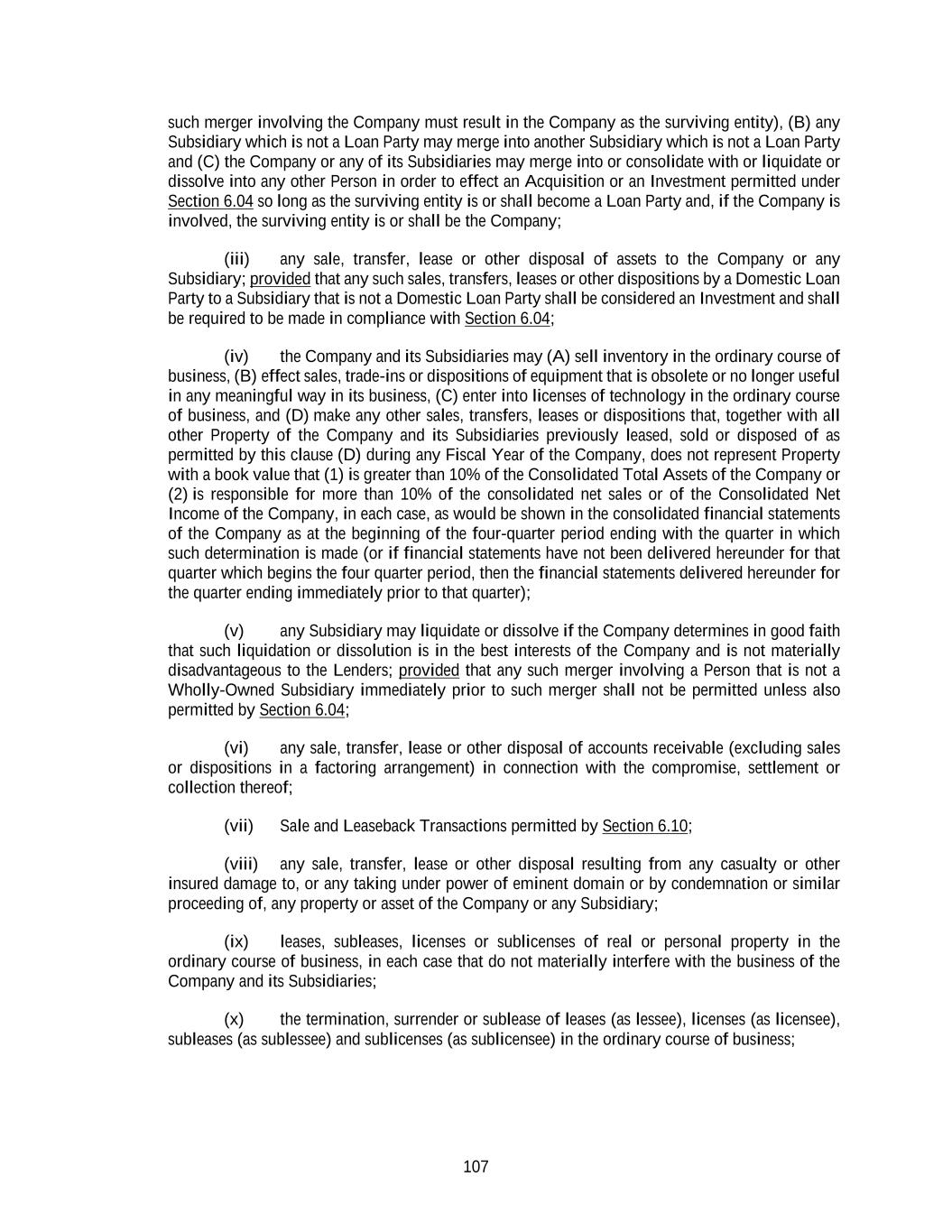 107 such merger involving the Company must result in the Company as the surviving entity), (B) any Subsidiary which is not a Loan Party may merge into another Subsidiary which is not a Loan Party and (C) the Company or any of its Subsidiaries may merge into or consolidate with or liquidate or dissolve into any other Person in order to effect an Acquisition or an Investment permitted under Section 6.04 so long as the surviving entity is or shall become a Loan Party and, if the Company is involved, the surviving entity is or shall be the Company; (iii) any sale, transfer, lease or other disposal of assets to the Company or any Subsidiary; provided that any such sales, transfers, leases or other dispositions by a Domestic Loan Party to a Subsidiary that is not a Domestic Loan Party shall be considered an Investment and shall be required to be made in compliance with Section 6.04; (iv) the Company and its Subsidiaries may (A) sell inventory in the ordinary course of business, (B) effect sales, trade-ins or dispositions of equipment that is obsolete or no longer useful in any meaningful way in its business, (C) enter into licenses of technology in the ordinary course of business, and (D) make any other sales, transfers, leases or dispositions that, together with all other Property of the Company and its Subsidiaries previously leased, sold or disposed of as permitted by this clause (D) during any Fiscal Year of the Company, does not represent Property with a book value that (1) is greater than 10% of the Consolidated Total Assets of the Company or (2) is responsible for more than 10% of the consolidated net sales or of the Consolidated Net Income of the Company, in each case, as would be shown in the consolidated financial statements of the Company as at the beginning of the four-quarter period ending with the quarter in which such determination is made (or if financial statements have not been delivered hereunder for that quarter which begins the four quarter period, then the financial statements delivered hereunder for the quarter ending immediately prior to that quarter); (v) any Subsidiary may liquidate or dissolve if the Company determines in good faith that such liquidation or dissolution is in the best interests of the Company and is not materially disadvantageous to the Lenders; provided that any such merger involving a Person that is not a Wholly-Owned Subsidiary immediately prior to such merger shall not be permitted unless also permitted by Section 6.04; (vi) any sale, transfer, lease or other disposal of accounts receivable (excluding sales or dispositions in a factoring arrangement) in connection with the compromise, settlement or collection thereof; (vii) Sale and Leaseback Transactions permitted by Section 6.10; (viii) any sale, transfer, lease or other disposal resulting from any casualty or other insured damage to, or any taking under power of eminent domain or by condemnation or similar proceeding of, any property or asset of the Company or any Subsidiary; (ix) leases, subleases, licenses or sublicenses of real or personal property in the ordinary course of business, in each case that do not materially interfere with the business of the Company and its Subsidiaries; (x) the termination, surrender or sublease of leases (as lessee), licenses (as licensee), subleases (as sublessee) and sublicenses (as sublicensee) in the ordinary course of business;