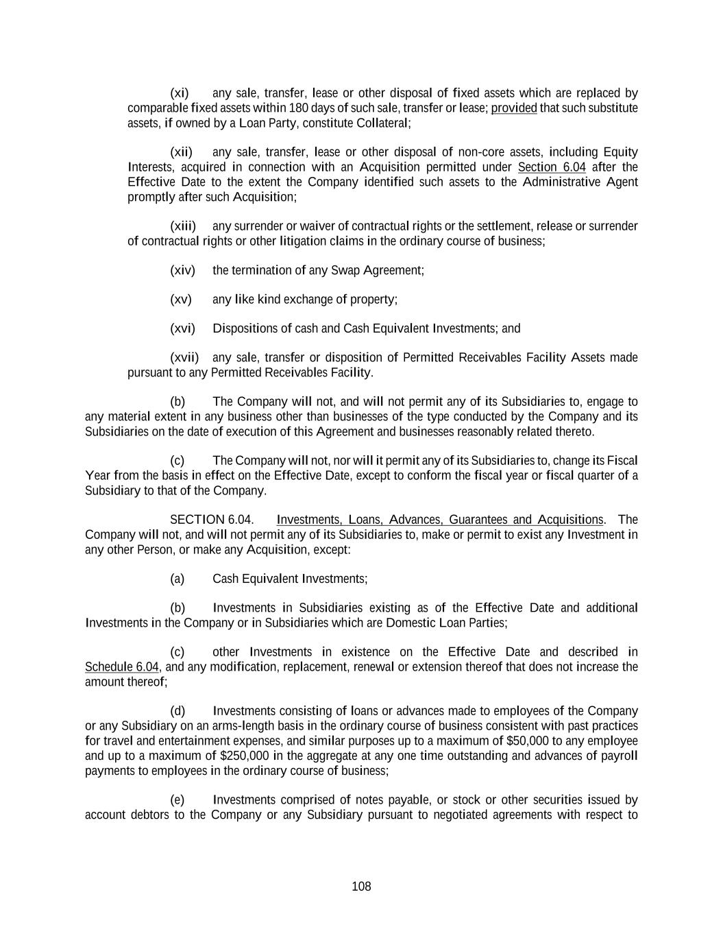 108 (xi) any sale, transfer, lease or other disposal of fixed assets which are replaced by comparable fixed assets within 180 days of such sale, transfer or lease; provided that such substitute assets, if owned by a Loan Party, constitute Collateral; (xii) any sale, transfer, lease or other disposal of non-core assets, including Equity Interests, acquired in connection with an Acquisition permitted under Section 6.04 after the Effective Date to the extent the Company identified such assets to the Administrative Agent promptly after such Acquisition; (xiii) any surrender or waiver of contractual rights or the settlement, release or surrender of contractual rights or other litigation claims in the ordinary course of business; (xiv) the termination of any Swap Agreement; (xv) any like kind exchange of property; (xvi) Dispositions of cash and Cash Equivalent Investments; and (xvii) any sale, transfer or disposition of Permitted Receivables Facility Assets made pursuant to any Permitted Receivables Facility. (b) The Company will not, and will not permit any of its Subsidiaries to, engage to any material extent in any business other than businesses of the type conducted by the Company and its Subsidiaries on the date of execution of this Agreement and businesses reasonably related thereto. (c) The Company will not, nor will it permit any of its Subsidiaries to, change its Fiscal Year from the basis in effect on the Effective Date, except to conform the fiscal year or fiscal quarter of a Subsidiary to that of the Company. SECTION 6.04. Investments, Loans, Advances, Guarantees and Acquisitions. The Company will not, and will not permit any of its Subsidiaries to, make or permit to exist any Investment in any other Person, or make any Acquisition, except: (a) Cash Equivalent Investments; (b) Investments in Subsidiaries existing as of the Effective Date and additional Investments in the Company or in Subsidiaries which are Domestic Loan Parties; (c) other Investments in existence on the Effective Date and described in Schedule 6.04, and any modification, replacement, renewal or extension thereof that does not increase the amount thereof; (d) Investments consisting of loans or advances made to employees of the Company or any Subsidiary on an arms-length basis in the ordinary course of business consistent with past practices for travel and entertainment expenses, and similar purposes up to a maximum of $50,000 to any employee and up to a maximum of $250,000 in the aggregate at any one time outstanding and advances of payroll payments to employees in the ordinary course of business; (e) Investments comprised of notes payable, or stock or other securities issued by account debtors to the Company or any Subsidiary pursuant to negotiated agreements with respect to