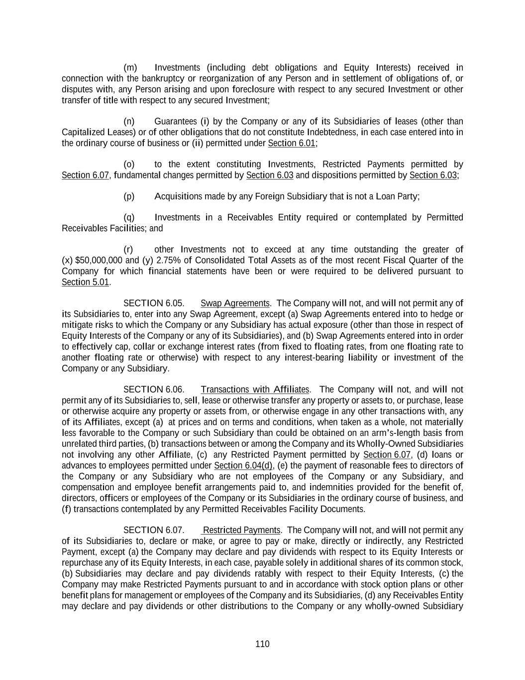 110 (m) Investments (including debt obligations and Equity Interests) received in connection with the bankruptcy or reorganization of any Person and in settlement of obligations of, or disputes with, any Person arising and upon foreclosure with respect to any secured Investment or other transfer of title with respect to any secured Investment; (n) Guarantees (i) by the Company or any of its Subsidiaries of leases (other than Capitalized Leases) or of other obligations that do not constitute Indebtedness, in each case entered into in the ordinary course of business or (ii) permitted under Section 6.01; (o) to the extent constituting Investments, Restricted Payments permitted by Section 6.07, fundamental changes permitted by Section 6.03 and dispositions permitted by Section 6.03; (p) Acquisitions made by any Foreign Subsidiary that is not a Loan Party; (q) Investments in a Receivables Entity required or contemplated by Permitted Receivables Facilities; and (r) other Investments not to exceed at any time outstanding the greater of (x) $50,000,000 and (y) 2.75% of Consolidated Total Assets as of the most recent Fiscal Quarter of the Company for which financial statements have been or were required to be delivered pursuant to Section 5.01. SECTION 6.05. Swap Agreements. The Company will not, and will not permit any of its Subsidiaries to, enter into any Swap Agreement, except (a) Swap Agreements entered into to hedge or mitigate risks to which the Company or any Subsidiary has actual exposure (other than those in respect of Equity Interests of the Company or any of its Subsidiaries), and (b) Swap Agreements entered into in order to effectively cap, collar or exchange interest rates (from fixed to floating rates, from one floating rate to another floating rate or otherwise) with respect to any interest-bearing liability or investment of the Company or any Subsidiary. SECTION 6.06. Transactions with Affiliates. The Company will not, and will not permit any of its Subsidiaries to, sell, lease or otherwise transfer any property or assets to, or purchase, lease or otherwise acquire any property or assets from, or otherwise engage in any other transactions with, any of its Affiliates, except (a) at prices and on terms and conditions, when taken as a whole, not materially less favorable to the Company or such Subsidiary than could be obtained on an arm’s-length basis from unrelated third parties, (b) transactions between or among the Company and its Wholly-Owned Subsidiaries not involving any other Affiliate, (c) any Restricted Payment permitted by Section 6.07, (d) loans or advances to employees permitted under Section 6.04(d), (e) the payment of reasonable fees to directors of the Company or any Subsidiary who are not employees of the Company or any Subsidiary, and compensation and employee benefit arrangements paid to, and indemnities provided for the benefit of, directors, officers or employees of the Company or its Subsidiaries in the ordinary course of business, and (f) transactions contemplated by any Permitted Receivables Facility Documents. SECTION 6.07. Restricted Payments. The Company will not, and will not permit any of its Subsidiaries to, declare or make, or agree to pay or make, directly or indirectly, any Restricted Payment, except (a) the Company may declare and pay dividends with respect to its Equity Interests or repurchase any of its Equity Interests, in each case, payable solely in additional shares of its common stock, (b) Subsidiaries may declare and pay dividends ratably with respect to their Equity Interests, (c) the Company may make Restricted Payments pursuant to and in accordance with stock option plans or other benefit plans for management or employees of the Company and its Subsidiaries, (d) any Receivables Entity may declare and pay dividends or other distributions to the Company or any wholly-owned Subsidiary