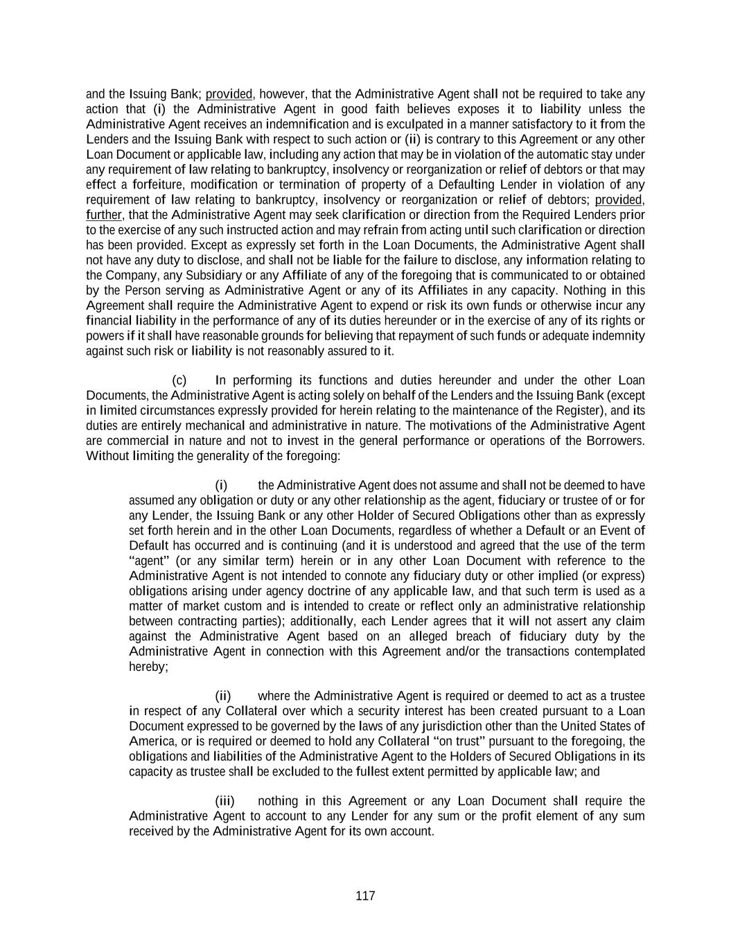 117 and the Issuing Bank; provided, however, that the Administrative Agent shall not be required to take any action that (i) the Administrative Agent in good faith believes exposes it to liability unless the Administrative Agent receives an indemnification and is exculpated in a manner satisfactory to it from the Lenders and the Issuing Bank with respect to such action or (ii) is contrary to this Agreement or any other Loan Document or applicable law, including any action that may be in violation of the automatic stay under any requirement of law relating to bankruptcy, insolvency or reorganization or relief of debtors or that may effect a forfeiture, modification or termination of property of a Defaulting Lender in violation of any requirement of law relating to bankruptcy, insolvency or reorganization or relief of debtors; provided, further, that the Administrative Agent may seek clarification or direction from the Required Lenders prior to the exercise of any such instructed action and may refrain from acting until such clarification or direction has been provided. Except as expressly set forth in the Loan Documents, the Administrative Agent shall not have any duty to disclose, and shall not be liable for the failure to disclose, any information relating to the Company, any Subsidiary or any Affiliate of any of the foregoing that is communicated to or obtained by the Person serving as Administrative Agent or any of its Affiliates in any capacity. Nothing in this Agreement shall require the Administrative Agent to expend or risk its own funds or otherwise incur any financial liability in the performance of any of its duties hereunder or in the exercise of any of its rights or powers if it shall have reasonable grounds for believing that repayment of such funds or adequate indemnity against such risk or liability is not reasonably assured to it. (c) In performing its functions and duties hereunder and under the other Loan Documents, the Administrative Agent is acting solely on behalf of the Lenders and the Issuing Bank (except in limited circumstances expressly provided for herein relating to the maintenance of the Register), and its duties are entirely mechanical and administrative in nature. The motivations of the Administrative Agent are commercial in nature and not to invest in the general performance or operations of the Borrowers. Without limiting the generality of the foregoing: (i) the Administrative Agent does not assume and shall not be deemed to have assumed any obligation or duty or any other relationship as the agent, fiduciary or trustee of or for any Lender, the Issuing Bank or any other Holder of Secured Obligations other than as expressly set forth herein and in the other Loan Documents, regardless of whether a Default or an Event of Default has occurred and is continuing (and it is understood and agreed that the use of the term “agent” (or any similar term) herein or in any other Loan Document with reference to the Administrative Agent is not intended to connote any fiduciary duty or other implied (or express) obligations arising under agency doctrine of any applicable law, and that such term is used as a matter of market custom and is intended to create or reflect only an administrative relationship between contracting parties); additionally, each Lender agrees that it will not assert any claim against the Administrative Agent based on an alleged breach of fiduciary duty by the Administrative Agent in connection with this Agreement and/or the transactions contemplated hereby; (ii) where the Administrative Agent is required or deemed to act as a trustee in respect of any Collateral over which a security interest has been created pursuant to a Loan Document expressed to be governed by the laws of any jurisdiction other than the United States of America, or is required or deemed to hold any Collateral “on trust” pursuant to the foregoing, the obligations and liabilities of the Administrative Agent to the Holders of Secured Obligations in its capacity as trustee shall be excluded to the fullest extent permitted by applicable law; and (iii) nothing in this Agreement or any Loan Document shall require the Administrative Agent to account to any Lender for any sum or the profit element of any sum received by the Administrative Agent for its own account.