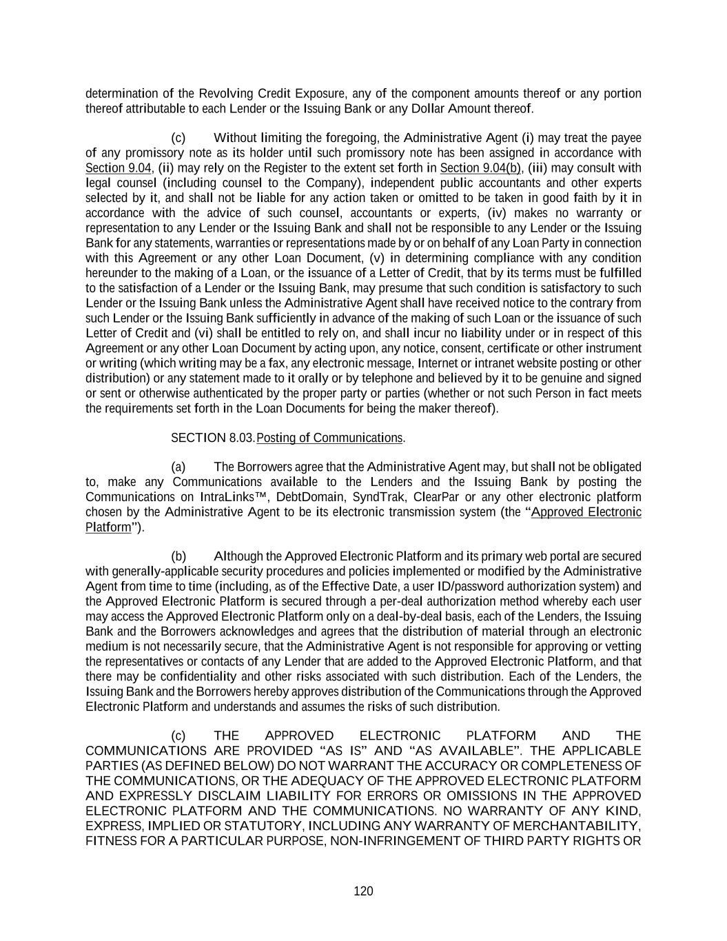 120 determination of the Revolving Credit Exposure, any of the component amounts thereof or any portion thereof attributable to each Lender or the Issuing Bank or any Dollar Amount thereof. (c) Without limiting the foregoing, the Administrative Agent (i) may treat the payee of any promissory note as its holder until such promissory note has been assigned in accordance with Section 9.04, (ii) may rely on the Register to the extent set forth in Section 9.04(b), (iii) may consult with legal counsel (including counsel to the Company), independent public accountants and other experts selected by it, and shall not be liable for any action taken or omitted to be taken in good faith by it in accordance with the advice of such counsel, accountants or experts, (iv) makes no warranty or representation to any Lender or the Issuing Bank and shall not be responsible to any Lender or the Issuing Bank for any statements, warranties or representations made by or on behalf of any Loan Party in connection with this Agreement or any other Loan Document, (v) in determining compliance with any condition hereunder to the making of a Loan, or the issuance of a Letter of Credit, that by its terms must be fulfilled to the satisfaction of a Lender or the Issuing Bank, may presume that such condition is satisfactory to such Lender or the Issuing Bank unless the Administrative Agent shall have received notice to the contrary from such Lender or the Issuing Bank sufficiently in advance of the making of such Loan or the issuance of such Letter of Credit and (vi) shall be entitled to rely on, and shall incur no liability under or in respect of this Agreement or any other Loan Document by acting upon, any notice, consent, certificate or other instrument or writing (which writing may be a fax, any electronic message, Internet or intranet website posting or other distribution) or any statement made to it orally or by telephone and believed by it to be genuine and signed or sent or otherwise authenticated by the proper party or parties (whether or not such Person in fact meets the requirements set forth in the Loan Documents for being the maker thereof). SECTION 8.03. Posting of Communications. (a) The Borrowers agree that the Administrative Agent may, but shall not be obligated to, make any Communications available to the Lenders and the Issuing Bank by posting the Communications on IntraLinks™, DebtDomain, SyndTrak, ClearPar or any other electronic platform chosen by the Administrative Agent to be its electronic transmission system (the “Approved Electronic Platform”). (b) Although the Approved Electronic Platform and its primary web portal are secured with generally-applicable security procedures and policies implemented or modified by the Administrative Agent from time to time (including, as of the Effective Date, a user ID/password authorization system) and the Approved Electronic Platform is secured through a per-deal authorization method whereby each user may access the Approved Electronic Platform only on a deal-by-deal basis, each of the Lenders, the Issuing Bank and the Borrowers acknowledges and agrees that the distribution of material through an electronic medium is not necessarily secure, that the Administrative Agent is not responsible for approving or vetting the representatives or contacts of any Lender that are added to the Approved Electronic Platform, and that there may be confidentiality and other risks associated with such distribution. Each of the Lenders, the Issuing Bank and the Borrowers hereby approves distribution of the Communications through the Approved Electronic Platform and understands and assumes the risks of such distribution. (c) THE APPROVED ELECTRONIC PLATFORM AND THE COMMUNICATIONS ARE PROVIDED “AS IS” AND “AS AVAILABLE”. THE APPLICABLE PARTIES (AS DEFINED BELOW) DO NOT WARRANT THE ACCURACY OR COMPLETENESS OF THE COMMUNICATIONS, OR THE ADEQUACY OF THE APPROVED ELECTRONIC PLATFORM AND EXPRESSLY DISCLAIM LIABILITY FOR ERRORS OR OMISSIONS IN THE APPROVED ELECTRONIC PLATFORM AND THE COMMUNICATIONS. NO WARRANTY OF ANY KIND, EXPRESS, IMPLIED OR STATUTORY, INCLUDING ANY WARRANTY OF MERCHANTABILITY, FITNESS FOR A PARTICULAR PURPOSE, NON-INFRINGEMENT OF THIRD PARTY RIGHTS OR