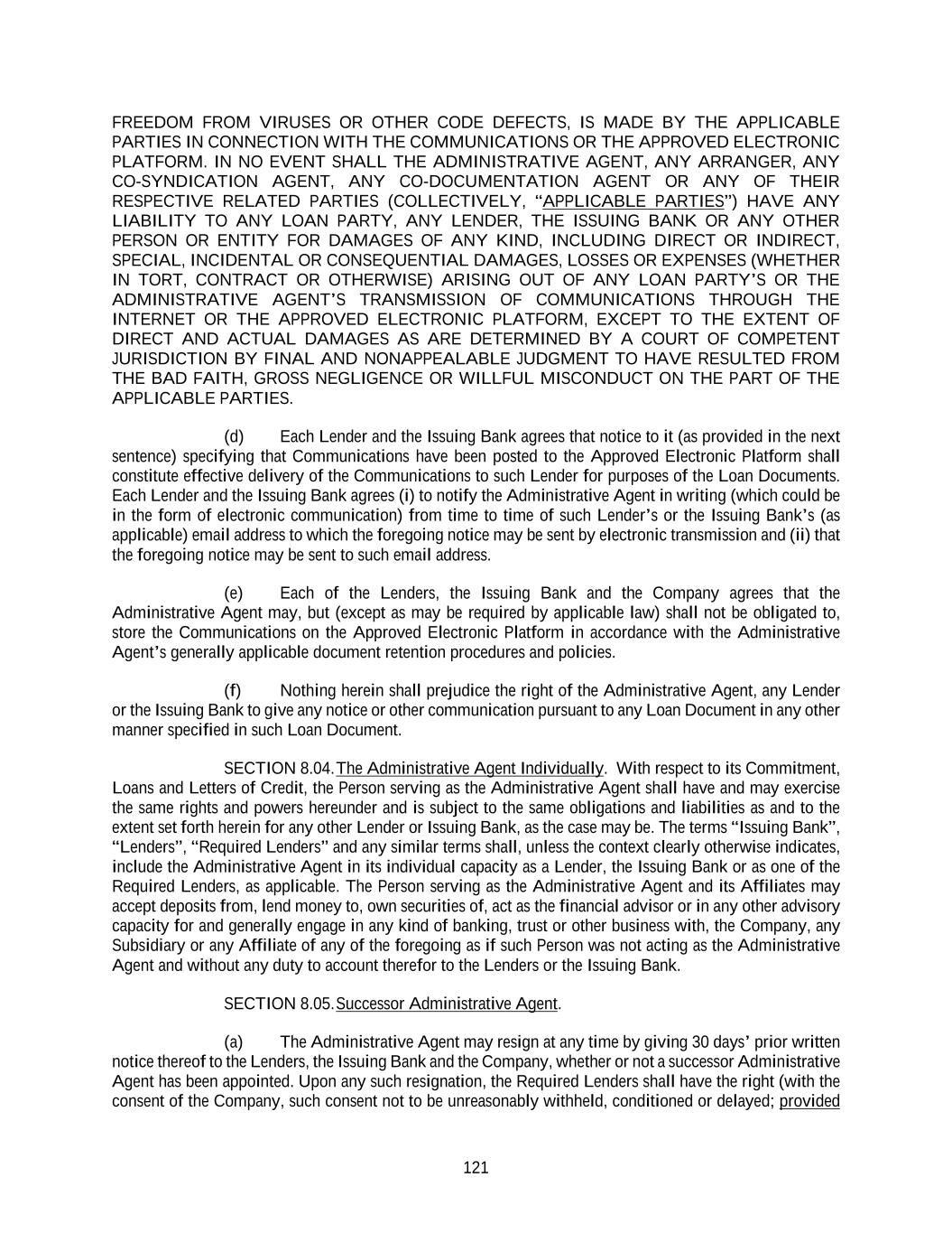 121 FREEDOM FROM VIRUSES OR OTHER CODE DEFECTS, IS MADE BY THE APPLICABLE PARTIES IN CONNECTION WITH THE COMMUNICATIONS OR THE APPROVED ELECTRONIC PLATFORM. IN NO EVENT SHALL THE ADMINISTRATIVE AGENT, ANY ARRANGER, ANY CO-SYNDICATION AGENT, ANY CO-DOCUMENTATION AGENT OR ANY OF THEIR RESPECTIVE RELATED PARTIES (COLLECTIVELY, “APPLICABLE PARTIES”) HAVE ANY LIABILITY TO ANY LOAN PARTY, ANY LENDER, THE ISSUING BANK OR ANY OTHER PERSON OR ENTITY FOR DAMAGES OF ANY KIND, INCLUDING DIRECT OR INDIRECT, SPECIAL, INCIDENTAL OR CONSEQUENTIAL DAMAGES, LOSSES OR EXPENSES (WHETHER IN TORT, CONTRACT OR OTHERWISE) ARISING OUT OF ANY LOAN PARTY’S OR THE ADMINISTRATIVE AGENT’S TRANSMISSION OF COMMUNICATIONS THROUGH THE INTERNET OR THE APPROVED ELECTRONIC PLATFORM, EXCEPT TO THE EXTENT OF DIRECT AND ACTUAL DAMAGES AS ARE DETERMINED BY A COURT OF COMPETENT JURISDICTION BY FINAL AND NONAPPEALABLE JUDGMENT TO HAVE RESULTED FROM THE BAD FAITH, GROSS NEGLIGENCE OR WILLFUL MISCONDUCT ON THE PART OF THE APPLICABLE PARTIES. (d) Each Lender and the Issuing Bank agrees that notice to it (as provided in the next sentence) specifying that Communications have been posted to the Approved Electronic Platform shall constitute effective delivery of the Communications to such Lender for purposes of the Loan Documents. Each Lender and the Issuing Bank agrees (i) to notify the Administrative Agent in writing (which could be in the form of electronic communication) from time to time of such Lender’s or the Issuing Bank’s (as applicable) email address to which the foregoing notice may be sent by electronic transmission and (ii) that the foregoing notice may be sent to such email address. (e) Each of the Lenders, the Issuing Bank and the Company agrees that the Administrative Agent may, but (except as may be required by applicable law) shall not be obligated to, store the Communications on the Approved Electronic Platform in accordance with the Administrative Agent’s generally applicable document retention procedures and policies. (f) Nothing herein shall prejudice the right of the Administrative Agent, any Lender or the Issuing Bank to give any notice or other communication pursuant to any Loan Document in any other manner specified in such Loan Document. SECTION 8.04. The Administrative Agent Individually. With respect to its Commitment, Loans and Letters of Credit, the Person serving as the Administrative Agent shall have and may exercise the same rights and powers hereunder and is subject to the same obligations and liabilities as and to the extent set forth herein for any other Lender or Issuing Bank, as the case may be. The terms “Issuing Bank”, “Lenders”, “Required Lenders” and any similar terms shall, unless the context clearly otherwise indicates, include the Administrative Agent in its individual capacity as a Lender, the Issuing Bank or as one of the Required Lenders, as applicable. The Person serving as the Administrative Agent and its Affiliates may accept deposits from, lend money to, own securities of, act as the financial advisor or in any other advisory capacity for and generally engage in any kind of banking, trust or other business with, the Company, any Subsidiary or any Affiliate of any of the foregoing as if such Person was not acting as the Administrative Agent and without any duty to account therefor to the Lenders or the Issuing Bank. SECTION 8.05. Successor Administrative Agent. (a) The Administrative Agent may resign at any time by giving 30 days’ prior written notice thereof to the Lenders, the Issuing Bank and the Company, whether or not a successor Administrative Agent has been appointed. Upon any such resignation, the Required Lenders shall have the right (with the consent of the Company, such consent not to be unreasonably withheld, conditioned or delayed; provided