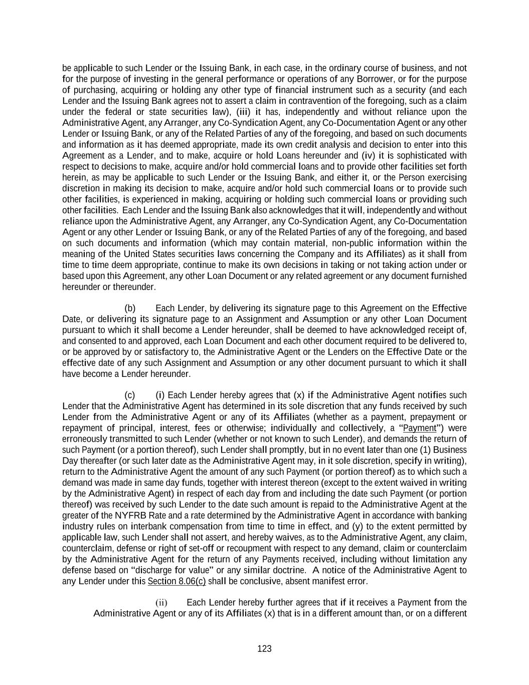 123 be applicable to such Lender or the Issuing Bank, in each case, in the ordinary course of business, and not for the purpose of investing in the general performance or operations of any Borrower, or for the purpose of purchasing, acquiring or holding any other type of financial instrument such as a security (and each Lender and the Issuing Bank agrees not to assert a claim in contravention of the foregoing, such as a claim under the federal or state securities law), (iii) it has, independently and without reliance upon the Administrative Agent, any Arranger, any Co-Syndication Agent, any Co-Documentation Agent or any other Lender or Issuing Bank, or any of the Related Parties of any of the foregoing, and based on such documents and information as it has deemed appropriate, made its own credit analysis and decision to enter into this Agreement as a Lender, and to make, acquire or hold Loans hereunder and (iv) it is sophisticated with respect to decisions to make, acquire and/or hold commercial loans and to provide other facilities set forth herein, as may be applicable to such Lender or the Issuing Bank, and either it, or the Person exercising discretion in making its decision to make, acquire and/or hold such commercial loans or to provide such other facilities, is experienced in making, acquiring or holding such commercial loans or providing such other facilities. Each Lender and the Issuing Bank also acknowledges that it will, independently and without reliance upon the Administrative Agent, any Arranger, any Co-Syndication Agent, any Co-Documentation Agent or any other Lender or Issuing Bank, or any of the Related Parties of any of the foregoing, and based on such documents and information (which may contain material, non-public information within the meaning of the United States securities laws concerning the Company and its Affiliates) as it shall from time to time deem appropriate, continue to make its own decisions in taking or not taking action under or based upon this Agreement, any other Loan Document or any related agreement or any document furnished hereunder or thereunder. (b) Each Lender, by delivering its signature page to this Agreement on the Effective Date, or delivering its signature page to an Assignment and Assumption or any other Loan Document pursuant to which it shall become a Lender hereunder, shall be deemed to have acknowledged receipt of, and consented to and approved, each Loan Document and each other document required to be delivered to, or be approved by or satisfactory to, the Administrative Agent or the Lenders on the Effective Date or the effective date of any such Assignment and Assumption or any other document pursuant to which it shall have become a Lender hereunder. (c) (i) Each Lender hereby agrees that (x) if the Administrative Agent notifies such Lender that the Administrative Agent has determined in its sole discretion that any funds received by such Lender from the Administrative Agent or any of its Affiliates (whether as a payment, prepayment or repayment of principal, interest, fees or otherwise; individually and collectively, a “Payment”) were erroneously transmitted to such Lender (whether or not known to such Lender), and demands the return of such Payment (or a portion thereof), such Lender shall promptly, but in no event later than one (1) Business Day thereafter (or such later date as the Administrative Agent may, in it sole discretion, specify in writing), return to the Administrative Agent the amount of any such Payment (or portion thereof) as to which such a demand was made in same day funds, together with interest thereon (except to the extent waived in writing by the Administrative Agent) in respect of each day from and including the date such Payment (or portion thereof) was received by such Lender to the date such amount is repaid to the Administrative Agent at the greater of the NYFRB Rate and a rate determined by the Administrative Agent in accordance with banking industry rules on interbank compensation from time to time in effect, and (y) to the extent permitted by applicable law, such Lender shall not assert, and hereby waives, as to the Administrative Agent, any claim, counterclaim, defense or right of set-off or recoupment with respect to any demand, claim or counterclaim by the Administrative Agent for the return of any Payments received, including without limitation any defense based on “discharge for value” or any similar doctrine. A notice of the Administrative Agent to any Lender under this Section 8.06(c) shall be conclusive, absent manifest error. Each Lender hereby further agrees that if it receives a Payment from the Administrative Agent or any of its Affiliates (x) that is in a different amount than, or on a different
