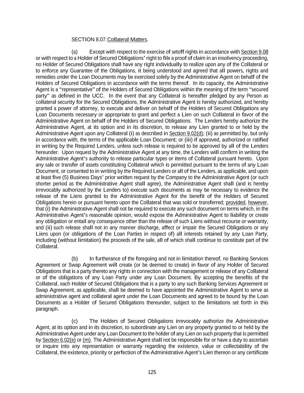 125 SECTION 8.07. Collateral Matters. (a) Except with respect to the exercise of setoff rights in accordance with Section 9.08 or with respect to a Holder of Secured Obligations’ right to file a proof of claim in an insolvency proceeding, no Holder of Secured Obligations shall have any right individually to realize upon any of the Collateral or to enforce any Guarantee of the Obligations, it being understood and agreed that all powers, rights and remedies under the Loan Documents may be exercised solely by the Administrative Agent on behalf of the Holders of Secured Obligations in accordance with the terms thereof. In its capacity, the Administrative Agent is a “representative” of the Holders of Secured Obligations within the meaning of the term “secured party” as defined in the UCC. In the event that any Collateral is hereafter pledged by any Person as collateral security for the Secured Obligations, the Administrative Agent is hereby authorized, and hereby granted a power of attorney, to execute and deliver on behalf of the Holders of Secured Obligations any Loan Documents necessary or appropriate to grant and perfect a Lien on such Collateral in favor of the Administrative Agent on behalf of the Holders of Secured Obligations. The Lenders hereby authorize the Administrative Agent, at its option and in its discretion, to release any Lien granted to or held by the Administrative Agent upon any Collateral (i) as described in Section 9.02(d); (ii) as permitted by, but only in accordance with, the terms of the applicable Loan Document; or (iii) if approved, authorized or ratified in writing by the Required Lenders, unless such release is required to be approved by all of the Lenders hereunder. Upon request by the Administrative Agent at any time, the Lenders will confirm in writing the Administrative Agent’s authority to release particular types or items of Collateral pursuant hereto. Upon any sale or transfer of assets constituting Collateral which is permitted pursuant to the terms of any Loan Document, or consented to in writing by the Required Lenders or all of the Lenders, as applicable, and upon at least five (5) Business Days’ prior written request by the Company to the Administrative Agent (or such shorter period as the Administrative Agent shall agree), the Administrative Agent shall (and is hereby irrevocably authorized by the Lenders to) execute such documents as may be necessary to evidence the release of the Liens granted to the Administrative Agent for the benefit of the Holders of Secured Obligations herein or pursuant hereto upon the Collateral that was sold or transferred; provided, however, that (i) the Administrative Agent shall not be required to execute any such document on terms which, in the Administrative Agent’s reasonable opinion, would expose the Administrative Agent to liability or create any obligation or entail any consequence other than the release of such Liens without recourse or warranty, and (ii) such release shall not in any manner discharge, affect or impair the Secured Obligations or any Liens upon (or obligations of the Loan Parties in respect of) all interests retained by any Loan Party, including (without limitation) the proceeds of the sale, all of which shall continue to constitute part of the Collateral. (b) In furtherance of the foregoing and not in limitation thereof, no Banking Services Agreement or Swap Agreement will create (or be deemed to create) in favor of any Holder of Secured Obligations that is a party thereto any rights in connection with the management or release of any Collateral or of the obligations of any Loan Party under any Loan Document. By accepting the benefits of the Collateral, each Holder of Secured Obligations that is a party to any such Banking Services Agreement or Swap Agreement, as applicable, shall be deemed to have appointed the Administrative Agent to serve as administrative agent and collateral agent under the Loan Documents and agreed to be bound by the Loan Documents as a Holder of Secured Obligations thereunder, subject to the limitations set forth in this paragraph. (c) The Holders of Secured Obligations irrevocably authorize the Administrative Agent, at its option and in its discretion, to subordinate any Lien on any property granted to or held by the Administrative Agent under any Loan Document to the holder of any Lien on such property that is permitted by Section 6.02(e) or (m). The Administrative Agent shall not be responsible for or have a duty to ascertain or inquire into any representation or warranty regarding the existence, value or collectability of the Collateral, the existence, priority or perfection of the Administrative Agent’s Lien thereon or any certificate