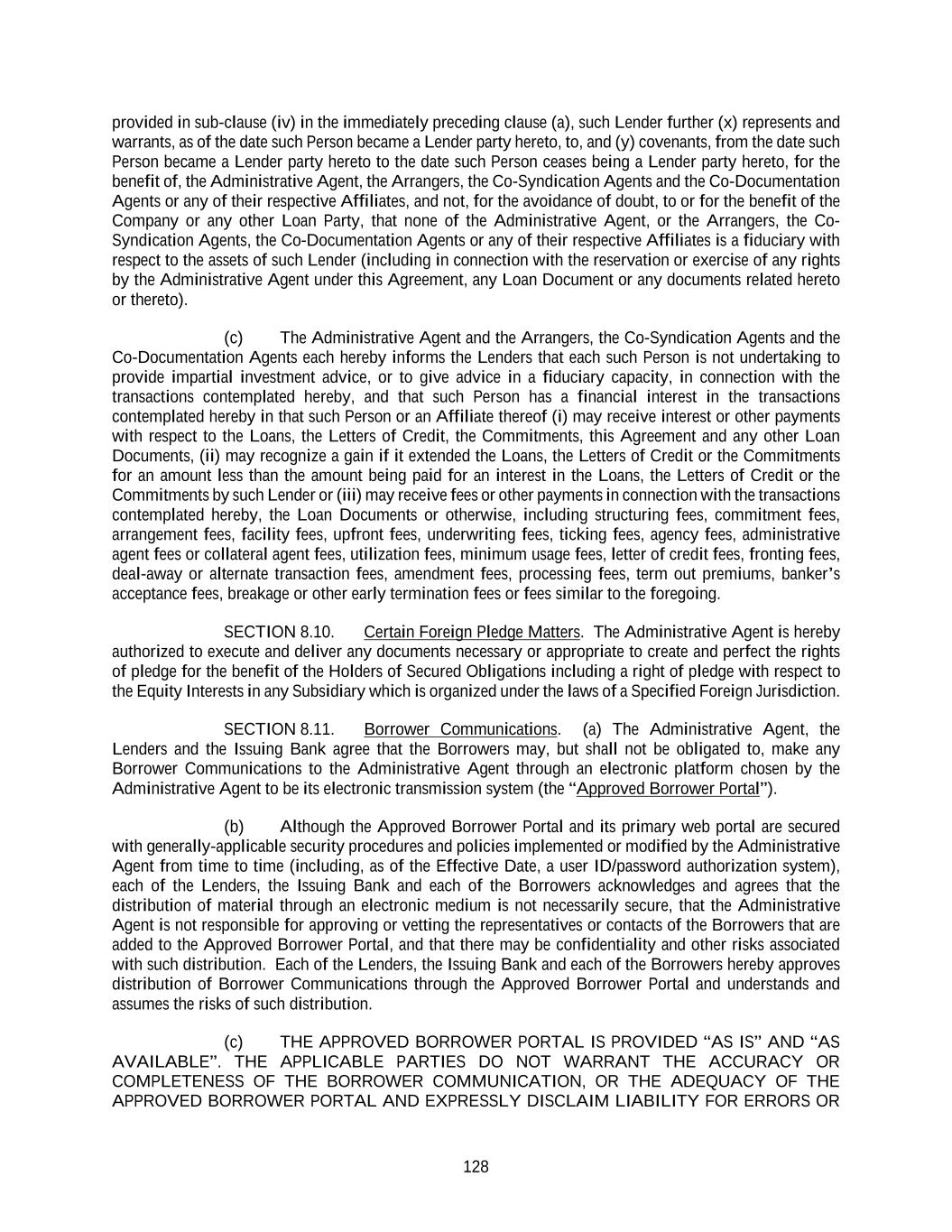 128 provided in sub-clause (iv) in the immediately preceding clause (a), such Lender further (x) represents and warrants, as of the date such Person became a Lender party hereto, to, and (y) covenants, from the date such Person became a Lender party hereto to the date such Person ceases being a Lender party hereto, for the benefit of, the Administrative Agent, the Arrangers, the Co-Syndication Agents and the Co-Documentation Agents or any of their respective Affiliates, and not, for the avoidance of doubt, to or for the benefit of the Company or any other Loan Party, that none of the Administrative Agent, or the Arrangers, the Co- Syndication Agents, the Co-Documentation Agents or any of their respective Affiliates is a fiduciary with respect to the assets of such Lender (including in connection with the reservation or exercise of any rights by the Administrative Agent under this Agreement, any Loan Document or any documents related hereto or thereto). (c) The Administrative Agent and the Arrangers, the Co-Syndication Agents and the Co-Documentation Agents each hereby informs the Lenders that each such Person is not undertaking to provide impartial investment advice, or to give advice in a fiduciary capacity, in connection with the transactions contemplated hereby, and that such Person has a financial interest in the transactions contemplated hereby in that such Person or an Affiliate thereof (i) may receive interest or other payments with respect to the Loans, the Letters of Credit, the Commitments, this Agreement and any other Loan Documents, (ii) may recognize a gain if it extended the Loans, the Letters of Credit or the Commitments for an amount less than the amount being paid for an interest in the Loans, the Letters of Credit or the Commitments by such Lender or (iii) may receive fees or other payments in connection with the transactions contemplated hereby, the Loan Documents or otherwise, including structuring fees, commitment fees, arrangement fees, facility fees, upfront fees, underwriting fees, ticking fees, agency fees, administrative agent fees or collateral agent fees, utilization fees, minimum usage fees, letter of credit fees, fronting fees, deal-away or alternate transaction fees, amendment fees, processing fees, term out premiums, banker’s acceptance fees, breakage or other early termination fees or fees similar to the foregoing. SECTION 8.10. Certain Foreign Pledge Matters. The Administrative Agent is hereby authorized to execute and deliver any documents necessary or appropriate to create and perfect the rights of pledge for the benefit of the Holders of Secured Obligations including a right of pledge with respect to the Equity Interests in any Subsidiary which is organized under the laws of a Specified Foreign Jurisdiction. SECTION 8.11. Borrower Communications. (a) The Administrative Agent, the Lenders and the Issuing Bank agree that the Borrowers may, but shall not be obligated to, make any Borrower Communications to the Administrative Agent through an electronic platform chosen by the Administrative Agent to be its electronic transmission system (the “Approved Borrower Portal”). (b) Although the Approved Borrower Portal and its primary web portal are secured with generally-applicable security procedures and policies implemented or modified by the Administrative Agent from time to time (including, as of the Effective Date, a user ID/password authorization system), each of the Lenders, the Issuing Bank and each of the Borrowers acknowledges and agrees that the distribution of material through an electronic medium is not necessarily secure, that the Administrative Agent is not responsible for approving or vetting the representatives or contacts of the Borrowers that are added to the Approved Borrower Portal, and that there may be confidentiality and other risks associated with such distribution. Each of the Lenders, the Issuing Bank and each of the Borrowers hereby approves distribution of Borrower Communications through the Approved Borrower Portal and understands and assumes the risks of such distribution. (c) THE APPROVED BORROWER PORTAL IS PROVIDED “AS IS” AND “AS AVAILABLE”. THE APPLICABLE PARTIES DO NOT WARRANT THE ACCURACY OR COMPLETENESS OF THE BORROWER COMMUNICATION, OR THE ADEQUACY OF THE APPROVED BORROWER PORTAL AND EXPRESSLY DISCLAIM LIABILITY FOR ERRORS OR