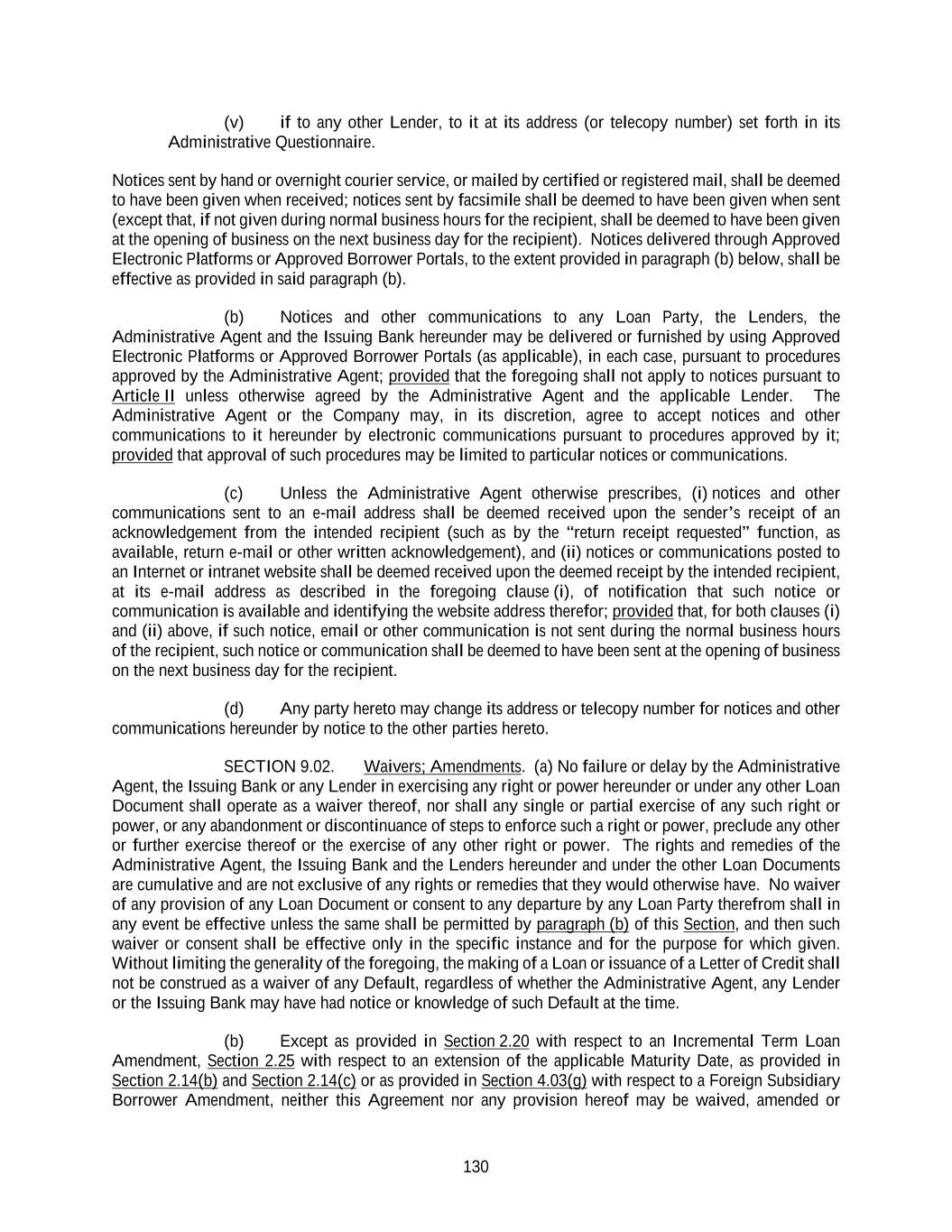 130 (v) if to any other Lender, to it at its address (or telecopy number) set forth in its Administrative Questionnaire. Notices sent by hand or overnight courier service, or mailed by certified or registered mail, shall be deemed to have been given when received; notices sent by facsimile shall be deemed to have been given when sent (except that, if not given during normal business hours for the recipient, shall be deemed to have been given at the opening of business on the next business day for the recipient). Notices delivered through Approved Electronic Platforms or Approved Borrower Portals, to the extent provided in paragraph (b) below, shall be effective as provided in said paragraph (b). (b) Notices and other communications to any Loan Party, the Lenders, the Administrative Agent and the Issuing Bank hereunder may be delivered or furnished by using Approved Electronic Platforms or Approved Borrower Portals (as applicable), in each case, pursuant to procedures approved by the Administrative Agent; provided that the foregoing shall not apply to notices pursuant to Article II unless otherwise agreed by the Administrative Agent and the applicable Lender. The Administrative Agent or the Company may, in its discretion, agree to accept notices and other communications to it hereunder by electronic communications pursuant to procedures approved by it; provided that approval of such procedures may be limited to particular notices or communications. (c) Unless the Administrative Agent otherwise prescribes, (i) notices and other communications sent to an e-mail address shall be deemed received upon the sender’s receipt of an acknowledgement from the intended recipient (such as by the “return receipt requested” function, as available, return e-mail or other written acknowledgement), and (ii) notices or communications posted to an Internet or intranet website shall be deemed received upon the deemed receipt by the intended recipient, at its e-mail address as described in the foregoing clause (i), of notification that such notice or communication is available and identifying the website address therefor; provided that, for both clauses (i) and (ii) above, if such notice, email or other communication is not sent during the normal business hours of the recipient, such notice or communication shall be deemed to have been sent at the opening of business on the next business day for the recipient. (d) Any party hereto may change its address or telecopy number for notices and other communications hereunder by notice to the other parties hereto. SECTION 9.02. Waivers; Amendments. (a) No failure or delay by the Administrative Agent, the Issuing Bank or any Lender in exercising any right or power hereunder or under any other Loan Document shall operate as a waiver thereof, nor shall any single or partial exercise of any such right or power, or any abandonment or discontinuance of steps to enforce such a right or power, preclude any other or further exercise thereof or the exercise of any other right or power. The rights and remedies of the Administrative Agent, the Issuing Bank and the Lenders hereunder and under the other Loan Documents are cumulative and are not exclusive of any rights or remedies that they would otherwise have. No waiver of any provision of any Loan Document or consent to any departure by any Loan Party therefrom shall in any event be effective unless the same shall be permitted by paragraph (b) of this Section, and then such waiver or consent shall be effective only in the specific instance and for the purpose for which given. Without limiting the generality of the foregoing, the making of a Loan or issuance of a Letter of Credit shall not be construed as a waiver of any Default, regardless of whether the Administrative Agent, any Lender or the Issuing Bank may have had notice or knowledge of such Default at the time. (b) Except as provided in Section 2.20 with respect to an Incremental Term Loan Amendment, Section 2.25 with respect to an extension of the applicable Maturity Date, as provided in Section 2.14(b) and Section 2.14(c) or as provided in Section 4.03(g) with respect to a Foreign Subsidiary Borrower Amendment, neither this Agreement nor any provision hereof may be waived, amended or