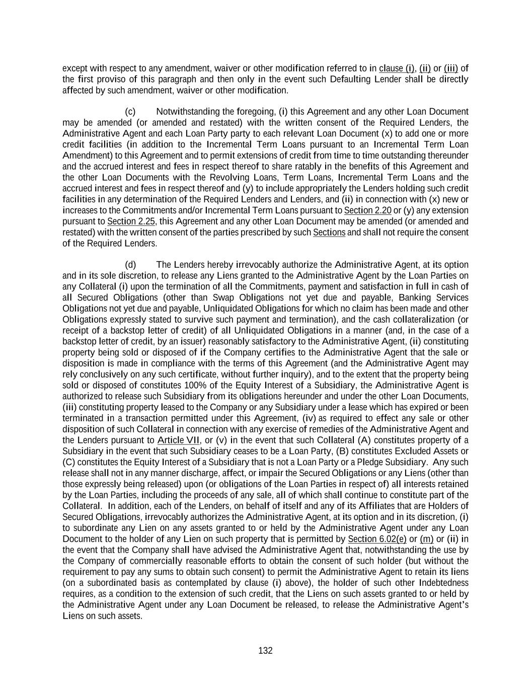 132 except with respect to any amendment, waiver or other modification referred to in clause (i), (ii) or (iii) of the first proviso of this paragraph and then only in the event such Defaulting Lender shall be directly affected by such amendment, waiver or other modification. (c) Notwithstanding the foregoing, (i) this Agreement and any other Loan Document may be amended (or amended and restated) with the written consent of the Required Lenders, the Administrative Agent and each Loan Party party to each relevant Loan Document (x) to add one or more credit facilities (in addition to the Incremental Term Loans pursuant to an Incremental Term Loan Amendment) to this Agreement and to permit extensions of credit from time to time outstanding thereunder and the accrued interest and fees in respect thereof to share ratably in the benefits of this Agreement and the other Loan Documents with the Revolving Loans, Term Loans, Incremental Term Loans and the accrued interest and fees in respect thereof and (y) to include appropriately the Lenders holding such credit facilities in any determination of the Required Lenders and Lenders, and (ii) in connection with (x) new or increases to the Commitments and/or Incremental Term Loans pursuant to Section 2.20 or (y) any extension pursuant to Section 2.25, this Agreement and any other Loan Document may be amended (or amended and restated) with the written consent of the parties prescribed by such Sections and shall not require the consent of the Required Lenders. (d) The Lenders hereby irrevocably authorize the Administrative Agent, at its option and in its sole discretion, to release any Liens granted to the Administrative Agent by the Loan Parties on any Collateral (i) upon the termination of all the Commitments, payment and satisfaction in full in cash of all Secured Obligations (other than Swap Obligations not yet due and payable, Banking Services Obligations not yet due and payable, Unliquidated Obligations for which no claim has been made and other Obligations expressly stated to survive such payment and termination), and the cash collateralization (or receipt of a backstop letter of credit) of all Unliquidated Obligations in a manner (and, in the case of a backstop letter of credit, by an issuer) reasonably satisfactory to the Administrative Agent, (ii) constituting property being sold or disposed of if the Company certifies to the Administrative Agent that the sale or disposition is made in compliance with the terms of this Agreement (and the Administrative Agent may rely conclusively on any such certificate, without further inquiry), and to the extent that the property being sold or disposed of constitutes 100% of the Equity Interest of a Subsidiary, the Administrative Agent is authorized to release such Subsidiary from its obligations hereunder and under the other Loan Documents, (iii) constituting property leased to the Company or any Subsidiary under a lease which has expired or been terminated in a transaction permitted under this Agreement, (iv) as required to effect any sale or other disposition of such Collateral in connection with any exercise of remedies of the Administrative Agent and the Lenders pursuant to Article VII, or (v) in the event that such Collateral (A) constitutes property of a Subsidiary in the event that such Subsidiary ceases to be a Loan Party, (B) constitutes Excluded Assets or (C) constitutes the Equity Interest of a Subsidiary that is not a Loan Party or a Pledge Subsidiary. Any such release shall not in any manner discharge, affect, or impair the Secured Obligations or any Liens (other than those expressly being released) upon (or obligations of the Loan Parties in respect of) all interests retained by the Loan Parties, including the proceeds of any sale, all of which shall continue to constitute part of the Collateral. In addition, each of the Lenders, on behalf of itself and any of its Affiliates that are Holders of Secured Obligations, irrevocably authorizes the Administrative Agent, at its option and in its discretion, (i) to subordinate any Lien on any assets granted to or held by the Administrative Agent under any Loan Document to the holder of any Lien on such property that is permitted by Section 6.02(e) or (m) or (ii) in the event that the Company shall have advised the Administrative Agent that, notwithstanding the use by the Company of commercially reasonable efforts to obtain the consent of such holder (but without the requirement to pay any sums to obtain such consent) to permit the Administrative Agent to retain its liens (on a subordinated basis as contemplated by clause (i) above), the holder of such other Indebtedness requires, as a condition to the extension of such credit, that the Liens on such assets granted to or held by the Administrative Agent under any Loan Document be released, to release the Administrative Agent’s Liens on such assets.