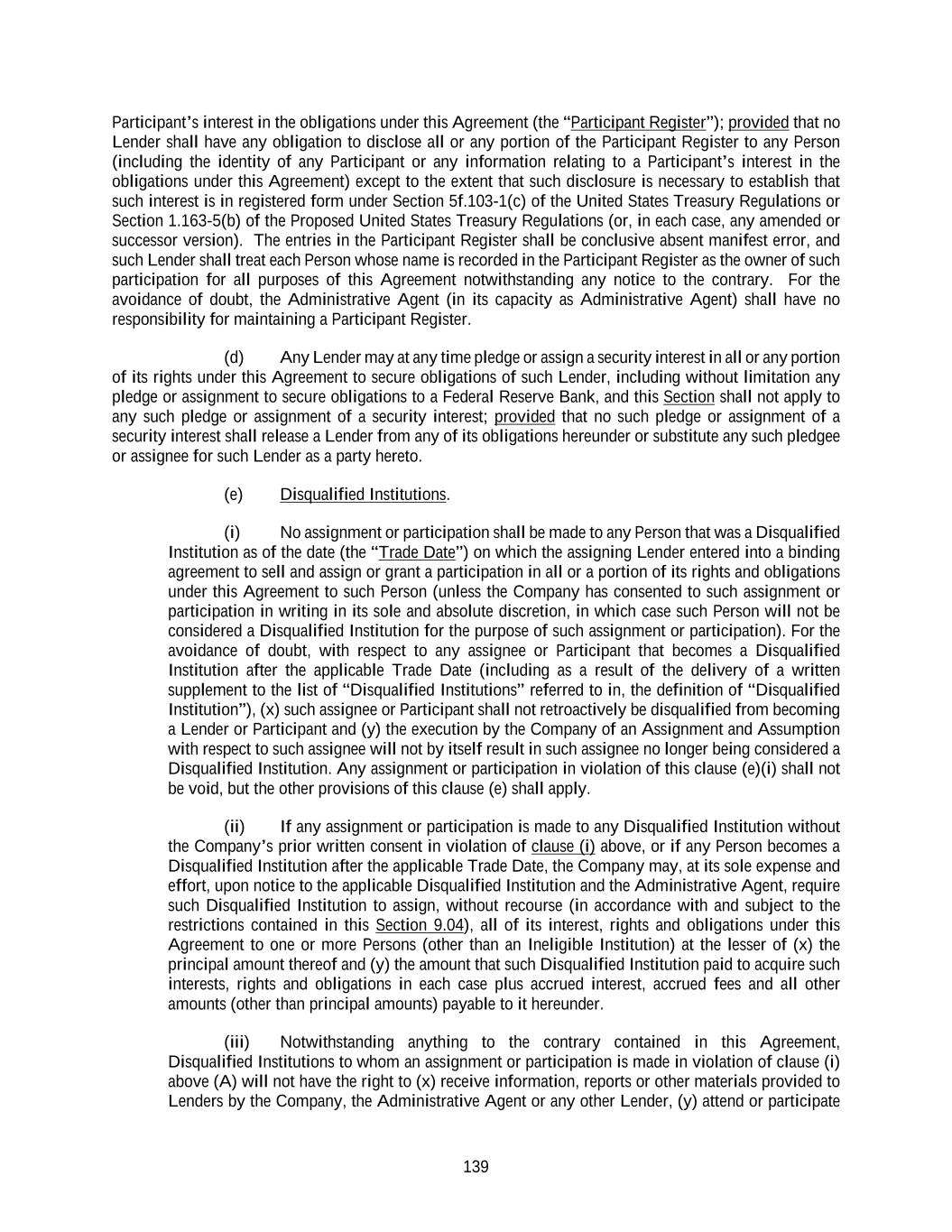 139 Participant’s interest in the obligations under this Agreement (the “Participant Register”); provided that no Lender shall have any obligation to disclose all or any portion of the Participant Register to any Person (including the identity of any Participant or any information relating to a Participant’s interest in the obligations under this Agreement) except to the extent that such disclosure is necessary to establish that such interest is in registered form under Section 5f.103-1(c) of the United States Treasury Regulations or Section 1.163-5(b) of the Proposed United States Treasury Regulations (or, in each case, any amended or successor version). The entries in the Participant Register shall be conclusive absent manifest error, and such Lender shall treat each Person whose name is recorded in the Participant Register as the owner of such participation for all purposes of this Agreement notwithstanding any notice to the contrary. For the avoidance of doubt, the Administrative Agent (in its capacity as Administrative Agent) shall have no responsibility for maintaining a Participant Register. (d) Any Lender may at any time pledge or assign a security interest in all or any portion of its rights under this Agreement to secure obligations of such Lender, including without limitation any pledge or assignment to secure obligations to a Federal Reserve Bank, and this Section shall not apply to any such pledge or assignment of a security interest; provided that no such pledge or assignment of a security interest shall release a Lender from any of its obligations hereunder or substitute any such pledgee or assignee for such Lender as a party hereto. (e) Disqualified Institutions. (i) No assignment or participation shall be made to any Person that was a Disqualified Institution as of the date (the “Trade Date”) on which the assigning Lender entered into a binding agreement to sell and assign or grant a participation in all or a portion of its rights and obligations under this Agreement to such Person (unless the Company has consented to such assignment or participation in writing in its sole and absolute discretion, in which case such Person will not be considered a Disqualified Institution for the purpose of such assignment or participation). For the avoidance of doubt, with respect to any assignee or Participant that becomes a Disqualified Institution after the applicable Trade Date (including as a result of the delivery of a written supplement to the list of “Disqualified Institutions” referred to in, the definition of “Disqualified Institution”), (x) such assignee or Participant shall not retroactively be disqualified from becoming a Lender or Participant and (y) the execution by the Company of an Assignment and Assumption with respect to such assignee will not by itself result in such assignee no longer being considered a Disqualified Institution. Any assignment or participation in violation of this clause (e)(i) shall not be void, but the other provisions of this clause (e) shall apply. (ii) If any assignment or participation is made to any Disqualified Institution without the Company’s prior written consent in violation of clause (i) above, or if any Person becomes a Disqualified Institution after the applicable Trade Date, the Company may, at its sole expense and effort, upon notice to the applicable Disqualified Institution and the Administrative Agent, require such Disqualified Institution to assign, without recourse (in accordance with and subject to the restrictions contained in this Section 9.04), all of its interest, rights and obligations under this Agreement to one or more Persons (other than an Ineligible Institution) at the lesser of (x) the principal amount thereof and (y) the amount that such Disqualified Institution paid to acquire such interests, rights and obligations in each case plus accrued interest, accrued fees and all other amounts (other than principal amounts) payable to it hereunder. (iii) Notwithstanding anything to the contrary contained in this Agreement, Disqualified Institutions to whom an assignment or participation is made in violation of clause (i) above (A) will not have the right to (x) receive information, reports or other materials provided to Lenders by the Company, the Administrative Agent or any other Lender, (y) attend or participate