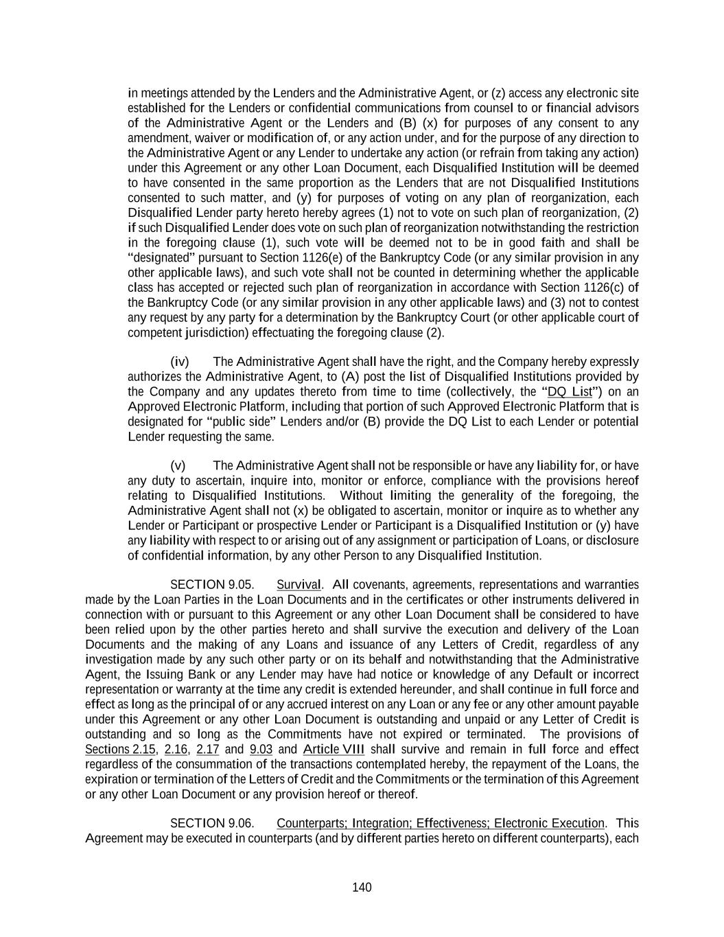 140 in meetings attended by the Lenders and the Administrative Agent, or (z) access any electronic site established for the Lenders or confidential communications from counsel to or financial advisors of the Administrative Agent or the Lenders and (B) (x) for purposes of any consent to any amendment, waiver or modification of, or any action under, and for the purpose of any direction to the Administrative Agent or any Lender to undertake any action (or refrain from taking any action) under this Agreement or any other Loan Document, each Disqualified Institution will be deemed to have consented in the same proportion as the Lenders that are not Disqualified Institutions consented to such matter, and (y) for purposes of voting on any plan of reorganization, each Disqualified Lender party hereto hereby agrees (1) not to vote on such plan of reorganization, (2) if such Disqualified Lender does vote on such plan of reorganization notwithstanding the restriction in the foregoing clause (1), such vote will be deemed not to be in good faith and shall be “designated” pursuant to Section 1126(e) of the Bankruptcy Code (or any similar provision in any other applicable laws), and such vote shall not be counted in determining whether the applicable class has accepted or rejected such plan of reorganization in accordance with Section 1126(c) of the Bankruptcy Code (or any similar provision in any other applicable laws) and (3) not to contest any request by any party for a determination by the Bankruptcy Court (or other applicable court of competent jurisdiction) effectuating the foregoing clause (2). (iv) The Administrative Agent shall have the right, and the Company hereby expressly authorizes the Administrative Agent, to (A) post the list of Disqualified Institutions provided by the Company and any updates thereto from time to time (collectively, the “DQ List”) on an Approved Electronic Platform, including that portion of such Approved Electronic Platform that is designated for “public side” Lenders and/or (B) provide the DQ List to each Lender or potential Lender requesting the same. (v) The Administrative Agent shall not be responsible or have any liability for, or have any duty to ascertain, inquire into, monitor or enforce, compliance with the provisions hereof relating to Disqualified Institutions. Without limiting the generality of the foregoing, the Administrative Agent shall not (x) be obligated to ascertain, monitor or inquire as to whether any Lender or Participant or prospective Lender or Participant is a Disqualified Institution or (y) have any liability with respect to or arising out of any assignment or participation of Loans, or disclosure of confidential information, by any other Person to any Disqualified Institution. SECTION 9.05. Survival. All covenants, agreements, representations and warranties made by the Loan Parties in the Loan Documents and in the certificates or other instruments delivered in connection with or pursuant to this Agreement or any other Loan Document shall be considered to have been relied upon by the other parties hereto and shall survive the execution and delivery of the Loan Documents and the making of any Loans and issuance of any Letters of Credit, regardless of any investigation made by any such other party or on its behalf and notwithstanding that the Administrative Agent, the Issuing Bank or any Lender may have had notice or knowledge of any Default or incorrect representation or warranty at the time any credit is extended hereunder, and shall continue in full force and effect as long as the principal of or any accrued interest on any Loan or any fee or any other amount payable under this Agreement or any other Loan Document is outstanding and unpaid or any Letter of Credit is outstanding and so long as the Commitments have not expired or terminated. The provisions of Sections 2.15, 2.16, 2.17 and 9.03 and Article VIII shall survive and remain in full force and effect regardless of the consummation of the transactions contemplated hereby, the repayment of the Loans, the expiration or termination of the Letters of Credit and the Commitments or the termination of this Agreement or any other Loan Document or any provision hereof or thereof. SECTION 9.06. Counterparts; Integration; Effectiveness; Electronic Execution. This Agreement may be executed in counterparts (and by different parties hereto on different counterparts), each