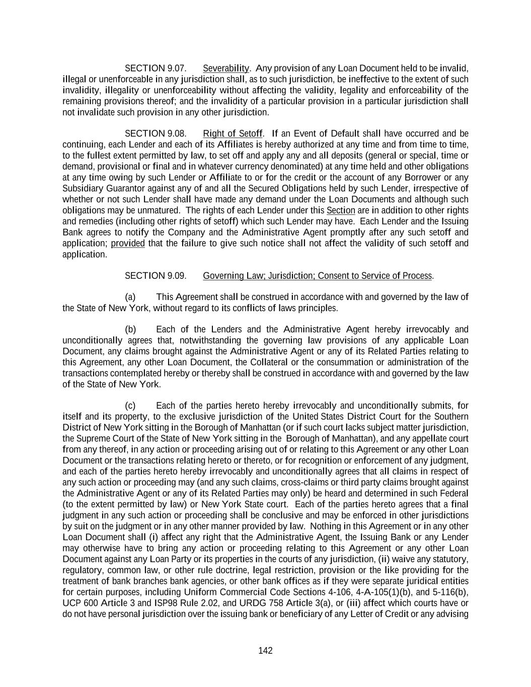 142 SECTION 9.07. Severability. Any provision of any Loan Document held to be invalid, illegal or unenforceable in any jurisdiction shall, as to such jurisdiction, be ineffective to the extent of such invalidity, illegality or unenforceability without affecting the validity, legality and enforceability of the remaining provisions thereof; and the invalidity of a particular provision in a particular jurisdiction shall not invalidate such provision in any other jurisdiction. SECTION 9.08. Right of Setoff. If an Event of Default shall have occurred and be continuing, each Lender and each of its Affiliates is hereby authorized at any time and from time to time, to the fullest extent permitted by law, to set off and apply any and all deposits (general or special, time or demand, provisional or final and in whatever currency denominated) at any time held and other obligations at any time owing by such Lender or Affiliate to or for the credit or the account of any Borrower or any Subsidiary Guarantor against any of and all the Secured Obligations held by such Lender, irrespective of whether or not such Lender shall have made any demand under the Loan Documents and although such obligations may be unmatured. The rights of each Lender under this Section are in addition to other rights and remedies (including other rights of setoff) which such Lender may have. Each Lender and the Issuing Bank agrees to notify the Company and the Administrative Agent promptly after any such setoff and application; provided that the failure to give such notice shall not affect the validity of such setoff and application. SECTION 9.09. Governing Law; Jurisdiction; Consent to Service of Process. (a) This Agreement shall be construed in accordance with and governed by the law of the State of New York, without regard to its conflicts of laws principles. (b) Each of the Lenders and the Administrative Agent hereby irrevocably and unconditionally agrees that, notwithstanding the governing law provisions of any applicable Loan Document, any claims brought against the Administrative Agent or any of its Related Parties relating to this Agreement, any other Loan Document, the Collateral or the consummation or administration of the transactions contemplated hereby or thereby shall be construed in accordance with and governed by the law of the State of New York. (c) Each of the parties hereto hereby irrevocably and unconditionally submits, for itself and its property, to the exclusive jurisdiction of the United States District Court for the Southern District of New York sitting in the Borough of Manhattan (or if such court lacks subject matter jurisdiction, the Supreme Court of the State of New York sitting in the Borough of Manhattan), and any appellate court from any thereof, in any action or proceeding arising out of or relating to this Agreement or any other Loan Document or the transactions relating hereto or thereto, or for recognition or enforcement of any judgment, and each of the parties hereto hereby irrevocably and unconditionally agrees that all claims in respect of any such action or proceeding may (and any such claims, cross-claims or third party claims brought against the Administrative Agent or any of its Related Parties may only) be heard and determined in such Federal (to the extent permitted by law) or New York State court. Each of the parties hereto agrees that a final judgment in any such action or proceeding shall be conclusive and may be enforced in other jurisdictions by suit on the judgment or in any other manner provided by law. Nothing in this Agreement or in any other Loan Document shall (i) affect any right that the Administrative Agent, the Issuing Bank or any Lender may otherwise have to bring any action or proceeding relating to this Agreement or any other Loan Document against any Loan Party or its properties in the courts of any jurisdiction, (ii) waive any statutory, regulatory, common law, or other rule doctrine, legal restriction, provision or the like providing for the treatment of bank branches bank agencies, or other bank offices as if they were separate juridical entities for certain purposes, including Uniform Commercial Code Sections 4-106, 4-A-105(1)(b), and 5-116(b), UCP 600 Article 3 and ISP98 Rule 2.02, and URDG 758 Article 3(a), or (iii) affect which courts have or do not have personal jurisdiction over the issuing bank or beneficiary of any Letter of Credit or any advising