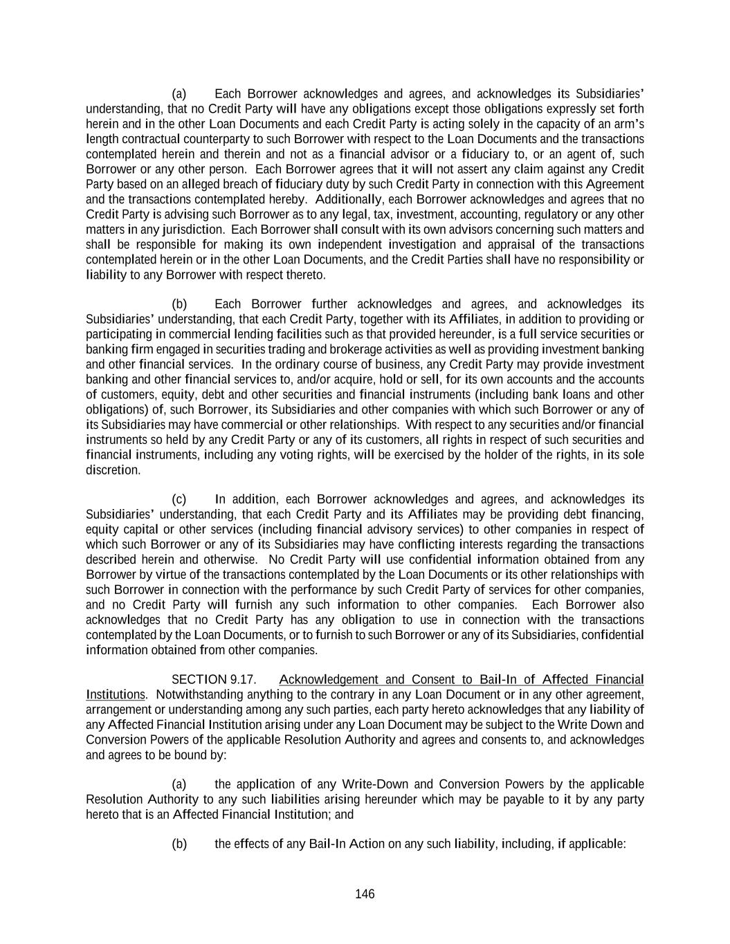 146 (a) Each Borrower acknowledges and agrees, and acknowledges its Subsidiaries’ understanding, that no Credit Party will have any obligations except those obligations expressly set forth herein and in the other Loan Documents and each Credit Party is acting solely in the capacity of an arm’s length contractual counterparty to such Borrower with respect to the Loan Documents and the transactions contemplated herein and therein and not as a financial advisor or a fiduciary to, or an agent of, such Borrower or any other person. Each Borrower agrees that it will not assert any claim against any Credit Party based on an alleged breach of fiduciary duty by such Credit Party in connection with this Agreement and the transactions contemplated hereby. Additionally, each Borrower acknowledges and agrees that no Credit Party is advising such Borrower as to any legal, tax, investment, accounting, regulatory or any other matters in any jurisdiction. Each Borrower shall consult with its own advisors concerning such matters and shall be responsible for making its own independent investigation and appraisal of the transactions contemplated herein or in the other Loan Documents, and the Credit Parties shall have no responsibility or liability to any Borrower with respect thereto. (b) Each Borrower further acknowledges and agrees, and acknowledges its Subsidiaries’ understanding, that each Credit Party, together with its Affiliates, in addition to providing or participating in commercial lending facilities such as that provided hereunder, is a full service securities or banking firm engaged in securities trading and brokerage activities as well as providing investment banking and other financial services. In the ordinary course of business, any Credit Party may provide investment banking and other financial services to, and/or acquire, hold or sell, for its own accounts and the accounts of customers, equity, debt and other securities and financial instruments (including bank loans and other obligations) of, such Borrower, its Subsidiaries and other companies with which such Borrower or any of its Subsidiaries may have commercial or other relationships. With respect to any securities and/or financial instruments so held by any Credit Party or any of its customers, all rights in respect of such securities and financial instruments, including any voting rights, will be exercised by the holder of the rights, in its sole discretion. (c) In addition, each Borrower acknowledges and agrees, and acknowledges its Subsidiaries’ understanding, that each Credit Party and its Affiliates may be providing debt financing, equity capital or other services (including financial advisory services) to other companies in respect of which such Borrower or any of its Subsidiaries may have conflicting interests regarding the transactions described herein and otherwise. No Credit Party will use confidential information obtained from any Borrower by virtue of the transactions contemplated by the Loan Documents or its other relationships with such Borrower in connection with the performance by such Credit Party of services for other companies, and no Credit Party will furnish any such information to other companies. Each Borrower also acknowledges that no Credit Party has any obligation to use in connection with the transactions contemplated by the Loan Documents, or to furnish to such Borrower or any of its Subsidiaries, confidential information obtained from other companies. SECTION 9.17. Acknowledgement and Consent to Bail-In of Affected Financial Institutions. Notwithstanding anything to the contrary in any Loan Document or in any other agreement, arrangement or understanding among any such parties, each party hereto acknowledges that any liability of any Affected Financial Institution arising under any Loan Document may be subject to the Write Down and Conversion Powers of the applicable Resolution Authority and agrees and consents to, and acknowledges and agrees to be bound by: (a) the application of any Write-Down and Conversion Powers by the applicable Resolution Authority to any such liabilities arising hereunder which may be payable to it by any party hereto that is an Affected Financial Institution; and (b) the effects of any Bail-In Action on any such liability, including, if applicable: