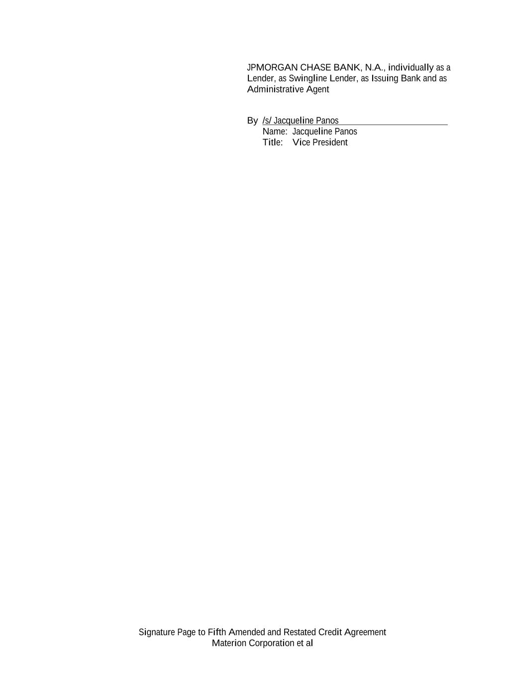 Signature Page to Fifth Amended and Restated Credit Agreement Materion Corporation et al JPMORGAN CHASE BANK, N.A., individually as a Lender, as Swingline Lender, as Issuing Bank and as Administrative Agent By /s/ Jacqueline Panos Name: Jacqueline Panos Title: Vice President