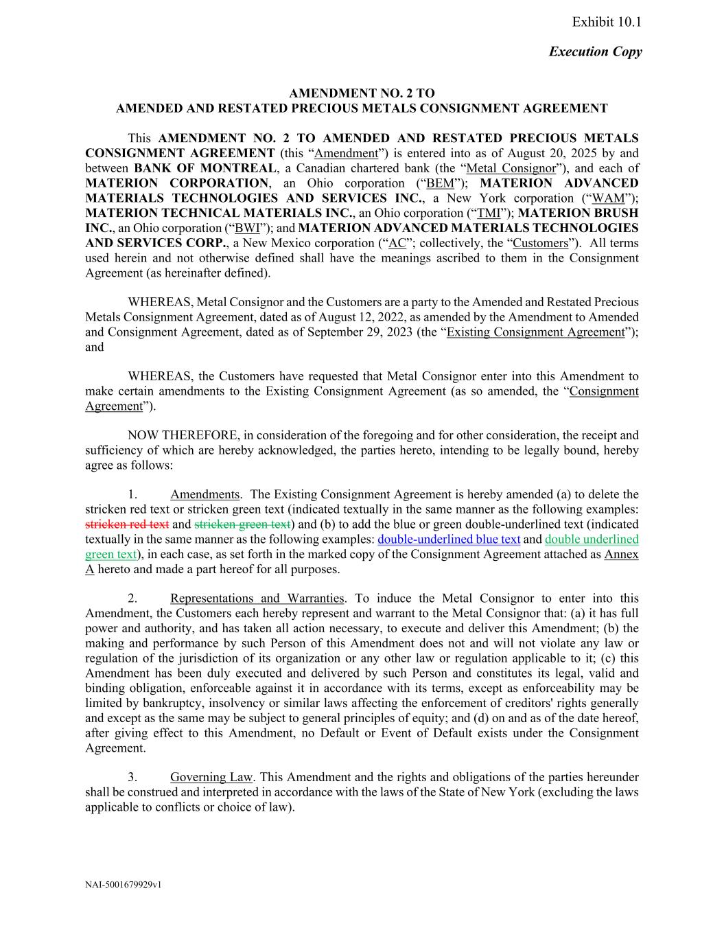 NAI-5001679929v1 AMENDMENT NO. 2 TO AMENDED AND RESTATED PRECIOUS METALS CONSIGNMENT AGREEMENT This AMENDMENT NO. 2 TO AMENDED AND RESTATED PRECIOUS METALS CONSIGNMENT AGREEMENT (this “Amendment”) is entered into as of August 20, 2025 by and between BANK OF MONTREAL, a Canadian chartered bank (the “Metal Consignor”), and each of MATERION CORPORATION, an Ohio corporation (“BEM”); MATERION ADVANCED MATERIALS TECHNOLOGIES AND SERVICES INC., a New York corporation (“WAM”); MATERION TECHNICAL MATERIALS INC., an Ohio corporation (“TMI”); MATERION BRUSH INC., an Ohio corporation (“BWI”); and MATERION ADVANCED MATERIALS TECHNOLOGIES AND SERVICES CORP., a New Mexico corporation (“AC”; collectively, the “Customers”). All terms used herein and not otherwise defined shall have the meanings ascribed to them in the Consignment Agreement (as hereinafter defined). WHEREAS, Metal Consignor and the Customers are a party to the Amended and Restated Precious Metals Consignment Agreement, dated as of August 12, 2022, as amended by the Amendment to Amended and Consignment Agreement, dated as of September 29, 2023 (the “Existing Consignment Agreement”); and WHEREAS, the Customers have requested that Metal Consignor enter into this Amendment to make certain amendments to the Existing Consignment Agreement (as so amended, the “Consignment Agreement”). NOW THEREFORE, in consideration of the foregoing and for other consideration, the receipt and sufficiency of which are hereby acknowledged, the parties hereto, intending to be legally bound, hereby agree as follows: 1. Amendments. The Existing Consignment Agreement is hereby amended (a) to delete the stricken red text or stricken green text (indicated textually in the same manner as the following examples: stricken red text and stricken green text) and (b) to add the blue or green double-underlined text (indicated textually in the same manner as the following examples: double-underlined blue text and double underlined green text), in each case, as set forth in the marked copy of the Consignment Agreement attached as Annex A hereto and made a part hereof for all purposes. 2. Representations and Warranties. To induce the Metal Consignor to enter into this Amendment, the Customers each hereby represent and warrant to the Metal Consignor that: (a) it has full power and authority, and has taken all action necessary, to execute and deliver this Amendment; (b) the making and performance by such Person of this Amendment does not and will not violate any law or regulation of the jurisdiction of its organization or any other law or regulation applicable to it; (c) this Amendment has been duly executed and delivered by such Person and constitutes its legal, valid and binding obligation, enforceable against it in accordance with its terms, except as enforceability may be limited by bankruptcy, insolvency or similar laws affecting the enforcement of creditors' rights generally and except as the same may be subject to general principles of equity; and (d) on and as of the date hereof, after giving effect to this Amendment, no Default or Event of Default exists under the Consignment Agreement. 3. Governing Law. This Amendment and the rights and obligations of the parties hereunder shall be construed and interpreted in accordance with the laws of the State of New York (excluding the laws applicable to conflicts or choice of law). Exhibit 10.1 Execution Copy