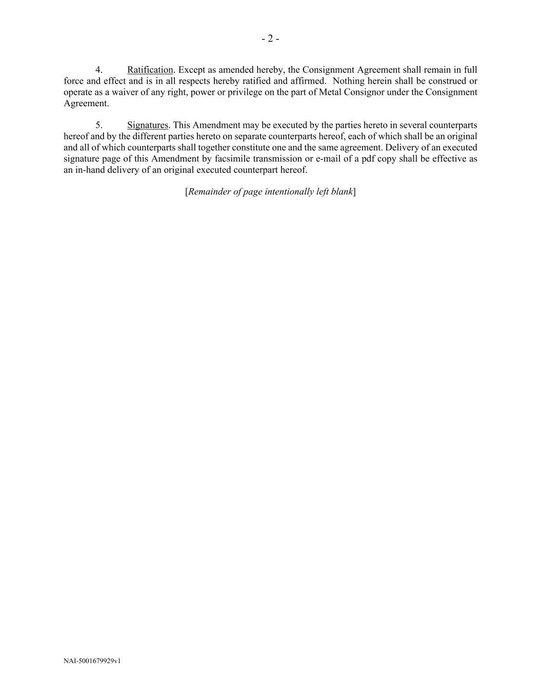 NAI-5001679929v1 - 2 - 4. Ratification. Except as amended hereby, the Consignment Agreement shall remain in full force and effect and is in all respects hereby ratified and affirmed. Nothing herein shall be construed or operate as a waiver of any right, power or privilege on the part of Metal Consignor under the Consignment Agreement. 5. Signatures. This Amendment may be executed by the parties hereto in several counterparts hereof and by the different parties hereto on separate counterparts hereof, each of which shall be an original and all of which counterparts shall together constitute one and the same agreement. Delivery of an executed signature page of this Amendment by facsimile transmission or e-mail of a pdf copy shall be effective as an in-hand delivery of an original executed counterpart hereof. [Remainder of page intentionally left blank]