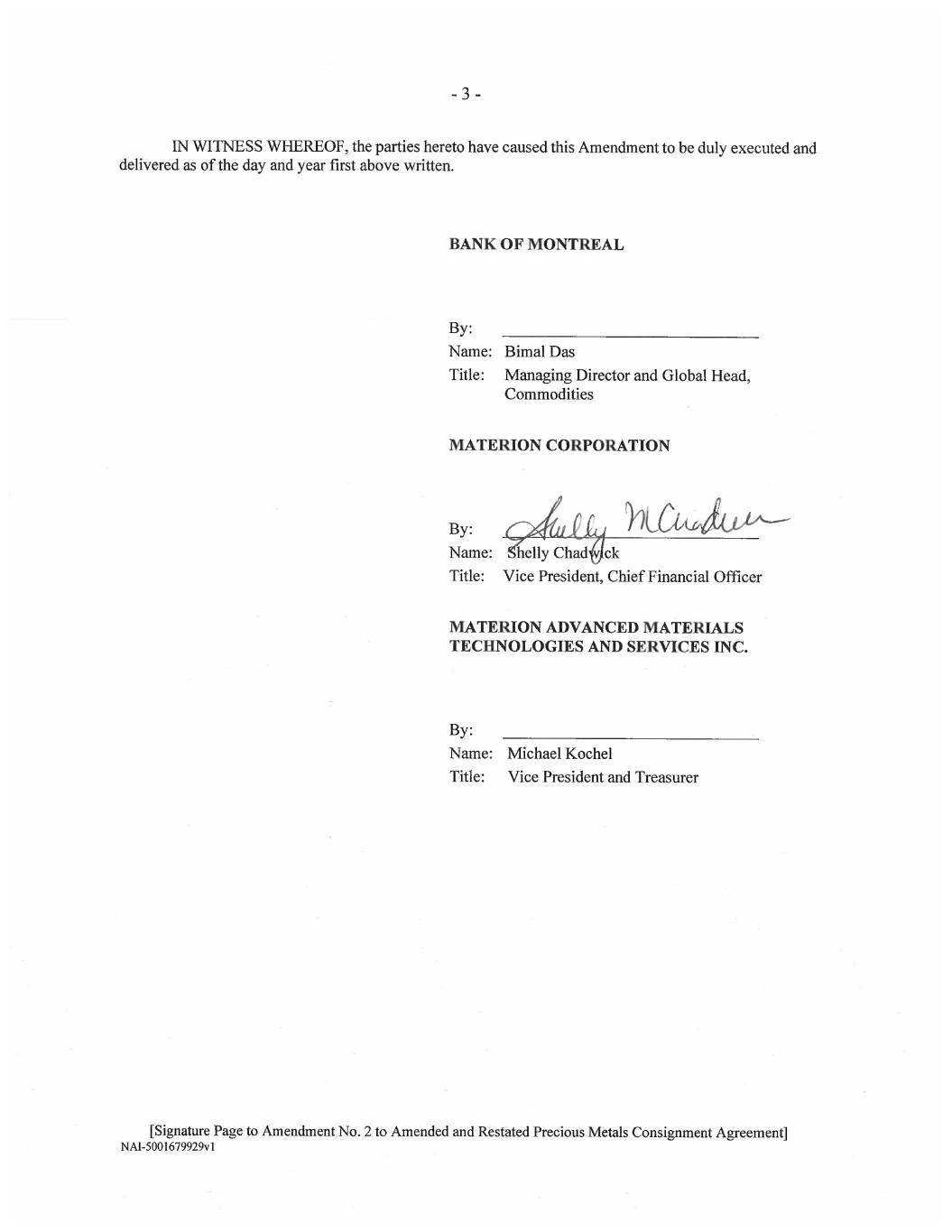 NAI-5001679929v1 - 3 - [Signature Page to Amendment No. 2 to Amended and Restated Precious Metals Consignment Agreement] IN WITNESS WHEREOF, the parties hereto have caused this Amendment to be duly executed and delivered as of the day and year first above written. BANK OF MONTREAL By: _______________________________ Name: Bimal Das Title: Managing Director and Global Head, Commodities MATERION CORPORATION By: _______________________________ Name: Shelly Chadwick Title: Vice President, Chief Financial Officer MATERION ADVANCED MATERIALS TECHNOLOGIES AND SERVICES INC. By: _______________________________ Name: Michael Kochel Title: Vice President and Treasurer