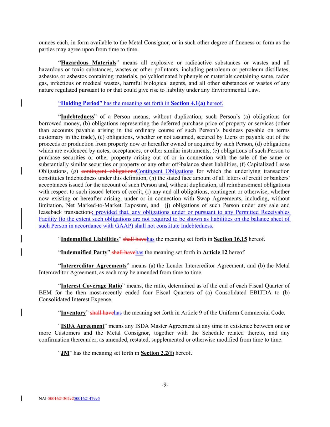 NAI-5001621302v25001621479v5 -9- ounces each, in form available to the Metal Consignor, or in such other degree of fineness or form as the parties may agree upon from time to time. “Hazardous Materials” means all explosive or radioactive substances or wastes and all hazardous or toxic substances, wastes or other pollutants, including petroleum or petroleum distillates, asbestos or asbestos containing materials, polychlorinated biphenyls or materials containing same, radon gas, infectious or medical wastes, harmful biological agents, and all other substances or wastes of any nature regulated pursuant to or that could give rise to liability under any Environmental Law. “Holding Period” has the meaning set forth in Section 4.1(a) hereof. “Indebtedness” of a Person means, without duplication, such Person’s (a) obligations for borrowed money, (b) obligations representing the deferred purchase price of property or services (other than accounts payable arising in the ordinary course of such Person’s business payable on terms customary in the trade), (c) obligations, whether or not assumed, secured by Liens or payable out of the proceeds or production from property now or hereafter owned or acquired by such Person, (d) obligations which are evidenced by notes, acceptances, or other similar instruments, (e) obligations of such Person to purchase securities or other property arising out of or in connection with the sale of the same or substantially similar securities or property or any other off-balance sheet liabilities, (f) Capitalized Lease Obligations, (g) contingent obligationsContingent Obligations for which the underlying transaction constitutes Indebtedness under this definition, (h) the stated face amount of all letters of credit or bankers’ acceptances issued for the account of such Person and, without duplication, all reimbursement obligations with respect to such issued letters of credit, (i) any and all obligations, contingent or otherwise, whether now existing or hereafter arising, under or in connection with Swap Agreements, including, without limitation, Net Marked-to-Market Exposure, and (j) obligations of such Person under any sale and leaseback transaction.; provided that, any obligations under or pursuant to any Permitted Receivables Facility (to the extent such obligations are not required to be shown as liabilities on the balance sheet of such Person in accordance with GAAP) shall not constitute Indebtedness. “Indemnified Liabilities” shall havehas the meaning set forth in Section 16.15 hereof. “Indemnified Party” shall havehas the meaning set forth in Article 12 hereof. “Intercreditor Agreements” means (a) the Lender Intercreditor Agreement, and (b) the Metal Intercreditor Agreement, as each may be amended from time to time. “Interest Coverage Ratio” means, the ratio, determined as of the end of each Fiscal Quarter of BEM for the then most-recently ended four Fiscal Quarters of (a) Consolidated EBITDA to (b) Consolidated Interest Expense. “Inventory” shall havehas the meaning set forth in Article 9 of the Uniform Commercial Code. “ISDA Agreement” means any ISDA Master Agreement at any time in existence between one or more Customers and the Metal Consignor, together with the Schedule related thereto, and any confirmation thereunder, as amended, restated, supplemented or otherwise modified from time to time. “JM” has the meaning set forth in Section 2.2(f) hereof.