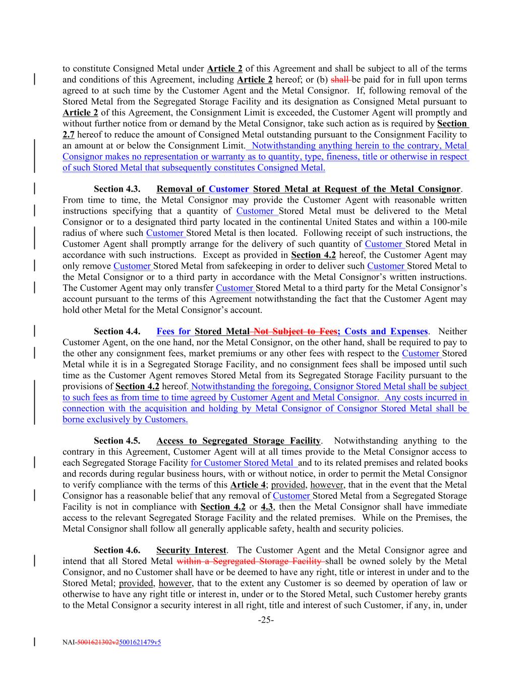NAI-5001621302v25001621479v5 -25- to constitute Consigned Metal under Article 2 of this Agreement and shall be subject to all of the terms and conditions of this Agreement, including Article 2 hereof; or (b) shall be paid for in full upon terms agreed to at such time by the Customer Agent and the Metal Consignor. If, following removal of the Stored Metal from the Segregated Storage Facility and its designation as Consigned Metal pursuant to Article 2 of this Agreement, the Consignment Limit is exceeded, the Customer Agent will promptly and without further notice from or demand by the Metal Consignor, take such action as is required by Section 2.7 hereof to reduce the amount of Consigned Metal outstanding pursuant to the Consignment Facility to an amount at or below the Consignment Limit. Notwithstanding anything herein to the contrary, Metal Consignor makes no representation or warranty as to quantity, type, fineness, title or otherwise in respect of such Stored Metal that subsequently constitutes Consigned Metal. Section 4.3. Removal of Customer Stored Metal at Request of the Metal Consignor. From time to time, the Metal Consignor may provide the Customer Agent with reasonable written instructions specifying that a quantity of Customer Stored Metal must be delivered to the Metal Consignor or to a designated third party located in the continental United States and within a 100-mile radius of where such Customer Stored Metal is then located. Following receipt of such instructions, the Customer Agent shall promptly arrange for the delivery of such quantity of Customer Stored Metal in accordance with such instructions. Except as provided in Section 4.2 hereof, the Customer Agent may only remove Customer Stored Metal from safekeeping in order to deliver such Customer Stored Metal to the Metal Consignor or to a third party in accordance with the Metal Consignor’s written instructions. The Customer Agent may only transfer Customer Stored Metal to a third party for the Metal Consignor’s account pursuant to the terms of this Agreement notwithstanding the fact that the Customer Agent may hold other Metal for the Metal Consignor’s account. Section 4.4. Fees for Stored Metal Not Subject to Fees; Costs and Expenses. Neither Customer Agent, on the one hand, nor the Metal Consignor, on the other hand, shall be required to pay to the other any consignment fees, market premiums or any other fees with respect to the Customer Stored Metal while it is in a Segregated Storage Facility, and no consignment fees shall be imposed until such time as the Customer Agent removes Stored Metal from its Segregated Storage Facility pursuant to the provisions of Section 4.2 hereof. Notwithstanding the foregoing, Consignor Stored Metal shall be subject to such fees as from time to time agreed by Customer Agent and Metal Consignor. Any costs incurred in connection with the acquisition and holding by Metal Consignor of Consignor Stored Metal shall be borne exclusively by Customers. Section 4.5. Access to Segregated Storage Facility. Notwithstanding anything to the contrary in this Agreement, Customer Agent will at all times provide to the Metal Consignor access to each Segregated Storage Facility for Customer Stored Metal and to its related premises and related books and records during regular business hours, with or without notice, in order to permit the Metal Consignor to verify compliance with the terms of this Article 4; provided, however, that in the event that the Metal Consignor has a reasonable belief that any removal of Customer Stored Metal from a Segregated Storage Facility is not in compliance with Section 4.2 or 4.3, then the Metal Consignor shall have immediate access to the relevant Segregated Storage Facility and the related premises. While on the Premises, the Metal Consignor shall follow all generally applicable safety, health and security policies. Section 4.6. Security Interest. The Customer Agent and the Metal Consignor agree and intend that all Stored Metal within a Segregated Storage Facility shall be owned solely by the Metal Consignor, and no Customer shall have or be deemed to have any right, title or interest in under and to the Stored Metal; provided, however, that to the extent any Customer is so deemed by operation of law or otherwise to have any right title or interest in, under or to the Stored Metal, such Customer hereby grants to the Metal Consignor a security interest in all right, title and interest of such Customer, if any, in, under