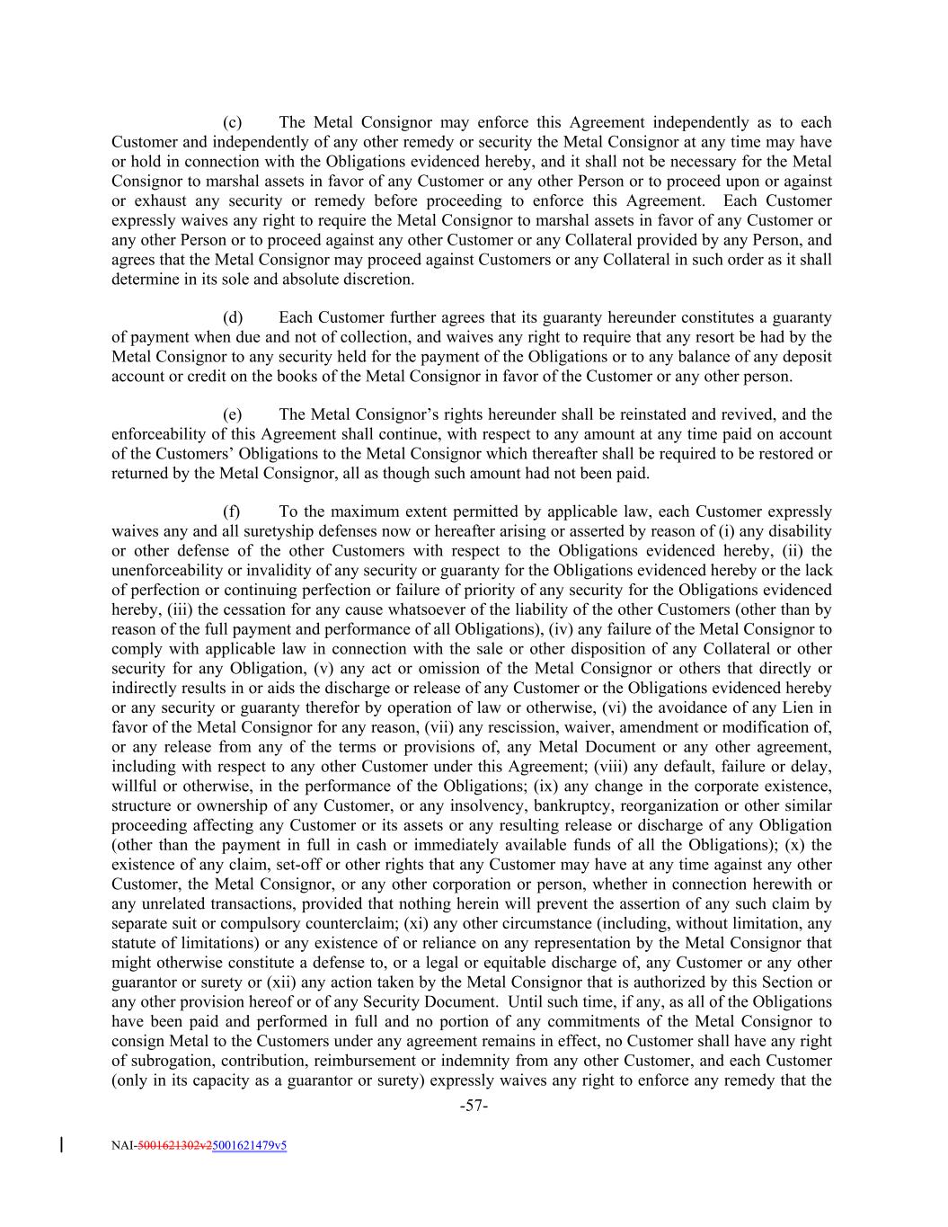 NAI-5001621302v25001621479v5 -57- (c) The Metal Consignor may enforce this Agreement independently as to each Customer and independently of any other remedy or security the Metal Consignor at any time may have or hold in connection with the Obligations evidenced hereby, and it shall not be necessary for the Metal Consignor to marshal assets in favor of any Customer or any other Person or to proceed upon or against or exhaust any security or remedy before proceeding to enforce this Agreement. Each Customer expressly waives any right to require the Metal Consignor to marshal assets in favor of any Customer or any other Person or to proceed against any other Customer or any Collateral provided by any Person, and agrees that the Metal Consignor may proceed against Customers or any Collateral in such order as it shall determine in its sole and absolute discretion. (d) Each Customer further agrees that its guaranty hereunder constitutes a guaranty of payment when due and not of collection, and waives any right to require that any resort be had by the Metal Consignor to any security held for the payment of the Obligations or to any balance of any deposit account or credit on the books of the Metal Consignor in favor of the Customer or any other person. (e) The Metal Consignor’s rights hereunder shall be reinstated and revived, and the enforceability of this Agreement shall continue, with respect to any amount at any time paid on account of the Customers’ Obligations to the Metal Consignor which thereafter shall be required to be restored or returned by the Metal Consignor, all as though such amount had not been paid. (f) To the maximum extent permitted by applicable law, each Customer expressly waives any and all suretyship defenses now or hereafter arising or asserted by reason of (i) any disability or other defense of the other Customers with respect to the Obligations evidenced hereby, (ii) the unenforceability or invalidity of any security or guaranty for the Obligations evidenced hereby or the lack of perfection or continuing perfection or failure of priority of any security for the Obligations evidenced hereby, (iii) the cessation for any cause whatsoever of the liability of the other Customers (other than by reason of the full payment and performance of all Obligations), (iv) any failure of the Metal Consignor to comply with applicable law in connection with the sale or other disposition of any Collateral or other security for any Obligation, (v) any act or omission of the Metal Consignor or others that directly or indirectly results in or aids the discharge or release of any Customer or the Obligations evidenced hereby or any security or guaranty therefor by operation of law or otherwise, (vi) the avoidance of any Lien in favor of the Metal Consignor for any reason, (vii) any rescission, waiver, amendment or modification of, or any release from any of the terms or provisions of, any Metal Document or any other agreement, including with respect to any other Customer under this Agreement; (viii) any default, failure or delay, willful or otherwise, in the performance of the Obligations; (ix) any change in the corporate existence, structure or ownership of any Customer, or any insolvency, bankruptcy, reorganization or other similar proceeding affecting any Customer or its assets or any resulting release or discharge of any Obligation (other than the payment in full in cash or immediately available funds of all the Obligations); (x) the existence of any claim, set-off or other rights that any Customer may have at any time against any other Customer, the Metal Consignor, or any other corporation or person, whether in connection herewith or any unrelated transactions, provided that nothing herein will prevent the assertion of any such claim by separate suit or compulsory counterclaim; (xi) any other circumstance (including, without limitation, any statute of limitations) or any existence of or reliance on any representation by the Metal Consignor that might otherwise constitute a defense to, or a legal or equitable discharge of, any Customer or any other guarantor or surety or (xii) any action taken by the Metal Consignor that is authorized by this Section or any other provision hereof or of any Security Document. Until such time, if any, as all of the Obligations have been paid and performed in full and no portion of any commitments of the Metal Consignor to consign Metal to the Customers under any agreement remains in effect, no Customer shall have any right of subrogation, contribution, reimbursement or indemnity from any other Customer, and each Customer (only in its capacity as a guarantor or surety) expressly waives any right to enforce any remedy that the