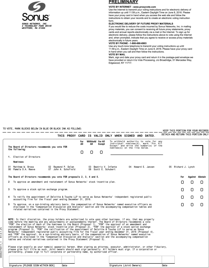 PRELIMINARY VOTE BY INTERNET - www.proxyvote.com Use the Internet to transmit your voting instructions and for electronic delivery of information up until 11:59 p.m., Eastern Daylight Time on June 8, 2016. Please have your proxy card in hand when you access the web site and follow the instructions to obtain your records and to create an electronic voting instruction form. ELECTRONIC DELIVERY OF FUTURE PROXY MATERIALS If you would like to reduce the costs incurred by Sonus Networks, Inc. in mailing proxy materials, you can consent to receiving all future proxy statements, proxy cards and annual reports electronically via e-mail or the Internet. To sign up for electronic delivery, please follow the instructions above to vote using the Internet and, when prompted, indicate that you agree to receive or access proxy materials electronically in future years. VOTE BY PHONE - 1-800-690-6903 Use any touch-tone telephone to transmit your voting instructions up until 11:59 p.m., Eastern Daylight Time on June 8, 2016. Please have your proxy card in hand when you call and then follow the instructions. VOTE BY MAIL Mark, sign and date your proxy card and return it in the postage-paid envelope we have provided or return it to Vote Processing, c/o Broadridge, 51 Mercedes Way, Edgewood, NY 11717. SONUS NETWORKS, INC. 4 TECHNOLOGY PARK DRIVE WESTFORD, MA 01886 TO VOTE, MARK BLOCKS BELOW IN BLUE OR BLACK INK AS FOLLOWS: KEEP THIS PORTION FOR YOUR RECORDS DETACH AND RETURN THIS PORTION ONLY THIS PROXY CARD IS VALID ONLY WHEN SIGNED AND DATED. For Withhold For All Except To withhold authority to vote for any individual nominee(s), mark “For All Except” and write the number(s) of the AllAll The Board of Directors recommends you vote FOR the following: nominee(s) on the line below. 0 0 0 1. Election of Directors Nominees 01 Matthew W. Bross 06 Pamela D.A. Reeve 02 Raymond P. Dolan 07 John A. Schofield 03 Beatriz V. Infante 08 Scott E. Schubert 04 Howard E. Janzen 05 Richard J. Lynch The Board of Directors recommends you vote FOR proposals 2, 3, 4 and 5. For 0 0 0 0 Against 0 0 0 0 Abstain 0 0 0 0 2 To approve an amendment and restatement of Sonus Networks' stock incentive plan. 3 To approve a stock option exchange program. 4 To ratify the appointment of Deloitte & Touche LLP to serve as Sonus Networks' independent registered public accounting firm for the fiscal year ending December 31, 2016. To approve, on a non-binding advisory basis, the compensation of Sonus Networks' named executive officers as disclosed in the "Compensation Discussion and Analysis" section and the accompanying compensation tables and related narratives contained in the Proxy Statement. 5 NOTE: In their discretion, the proxy holders are authorized to vote upon other business, if any, that may properly come before the meeting and any adjournments or postponements thereof. The Board of Directors recommends a vote "FOR" the election of each of the nominees to the Board (Proposal 1), "FOR" the approval of an amendment and restatement of Sonus Networks' stock incentive plan (Proposal 2), "FOR" the approval of a stock option exchange program (Proposal 3), "FOR" the ratification of the appointment of Deloitte & Touche LLP to serve as Sonus Networks' independent registered public accounting firm for the fiscal year ending December 31, 2016 (Proposal 4), and "FOR" the approval, on a non-binding advisory basis, of the compensation of Sonus Networks' named executive officers as disclosed in the "Compensation Discussion and Analysis" section and the accompanying compensation tables and related narratives contained in the Proxy Statement (Proposal 5). Please sign exactly as your name(s) appear(s) hereon. When signing as attorney, executor, administrator, or other fiduciary, please give full title as such. Joint owners should each sign personally. All holders must sign. If a corporation or partnership, please sign in full corporate or partnership name, by authorized officer. Signature [PLEASE SIGN WITHIN BOX] Date Signature (Joint Owners) Date 0000279311_1 R1.0.1.25
