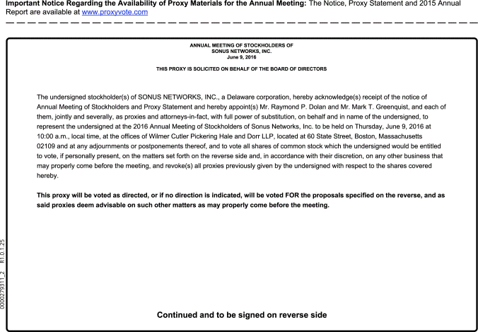 Important Notice Regarding the Availability of Proxy Materials for the Annual Meeting: The Notice, Proxy Statement and 2015 Annual Report are available at www.proxyvote.com . ANNUAL MEETING OF STOCKHOLDERS OF SONUS NETWORKS, INC. June 9, 2016 THIS PROXY IS SOLICITED ON BEHALF OF THE BOARD OF DIRECTORS The undersigned stockholder(s) of SONUS NETWORKS, INC., a Delaware corporation, hereby acknowledge(s) receipt of the notice of Annual Meeting of Stockholders and Proxy Statement and hereby appoint(s) Mr. Raymond P. Dolan and Mr. Mark T. Greenquist, and each of them, jointly and severally, as proxies and attorneys-in-fact, with full power of substitution, on behalf and in name of the undersigned, to represent the undersigned at the 2016 Annual Meeting of Stockholders of Sonus Networks, Inc. to be held on Thursday, June 9, 2016 at 10:00 a.m., local time, at the offices of Wilmer Cutler Pickering Hale and Dorr LLP, located at 60 State Street, Boston, Massachusetts 02109 and at any adjournments or postponements thereof, and to vote all shares of common stock which the undersigned would be entitled to vote, if personally present, on the matters set forth on the reverse side and, in accordance with their discretion, on any other business that may properly come before the meeting, and revoke(s) all proxies previously given by the undersigned with respect to the shares covered hereby. This proxy will be voted as directed, or if no direction is indicated, will be voted FOR the proposals specified on the reverse, and as said proxies deem advisable on such other matters as may properly come before the meeting. Continued and to be signed on reverse side 0000279311_2 R1.0.1.25