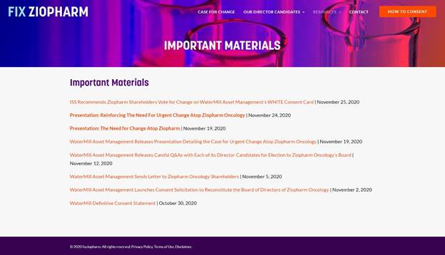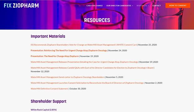 Shareholders who agree that meaningful change is needed atop Ziopharm should vote on the WHITE consent card for all five of WaterMill’s proposals, including the addition of Robert Postma to the Board alongside Mr. Vieser and Mr. Weis. Learn more about our case for change and how to consent at www.FixZiopharm.com.