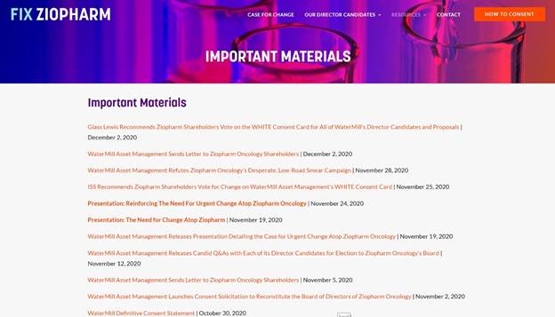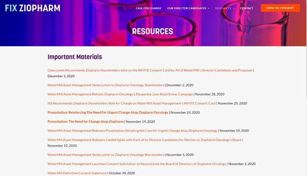 We urge shareholders who agree that meaningful change is needed atop Ziopharm to immediately vote on the WHITE consent card for all five of WaterMill’s proposals. Learn more about our case for change and how to consent at www.FixZiopharm.com.