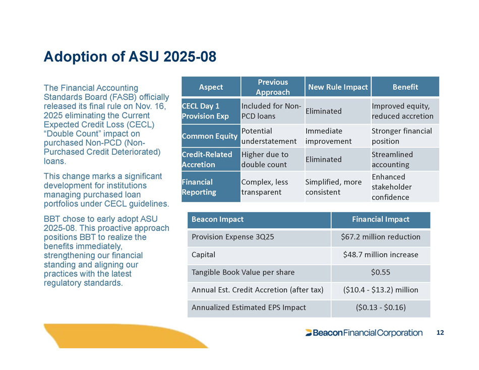 Adoption of ASU 2025 - 08 12 The Financial Accounting Standards Board (FASB) officially released its final rule on Nov. 16, 2025 eliminating the Current Expected Credit Loss (CECL) “Double Count” impact on purchased Non - PCD (Non - Purchased Credit Deteriorated) loans. This change marks a significant development for institutions managing purchased loan portfolios under CECL guidelines. BBT chose to early adopt ASU 2025 - 08. This proactive approach positions BBT to realize the benefits immediately, strengthening our financial standing and aligning our practices with the latest regulatory standards. Benefit New Rule Impact Previous Approach Aspect Improved equity, reduced accretion Eliminated Included for Non - PCD loans CECL Day 1 Provision Exp Stronger financial position Immediate improvement Potential understatement Common Equity Streamlined accounting Eliminated Higher due to double count Credit - Related Accretion Enhanced stakeholder confidence Simplified, more consistent Complex, less transparent Financial Reporting Financial Impact Beacon Impact $67.2 million reduction Provision Expense 3Q25 $48.7 million increase Capital $0.55 Tangible Book Value per share ($10.4 - $13.2) million Annual Est. Credit Accretion (after tax) ($0.13 - $0.16) Annualized Estimated EPS Impact