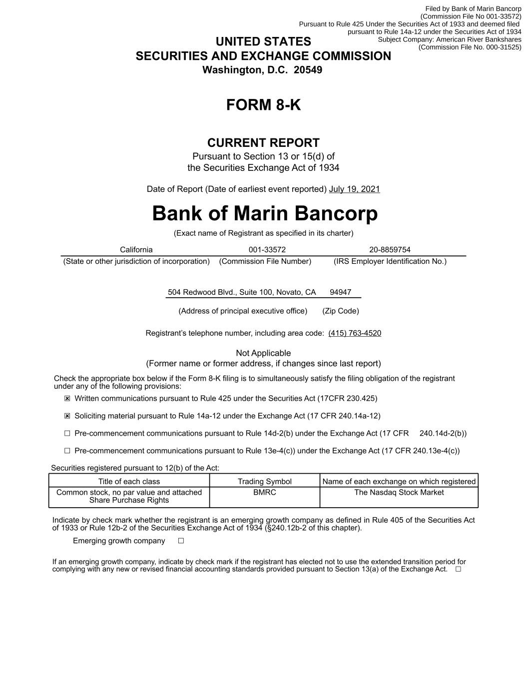 UNITED STATES SECURITIES AND EXCHANGE COMMISSION Washington, D.C. 20549 FORM 8-K CURRENT REPORT Pursuant to Section 13 or 15(d) of the Securities Exchange Act of 1934 Date of Report (Date of earliest event reported) July 19, 2021 Bank of Marin Bancorp (Exact name of Registrant as specified in its charter) California 001-33572 20-8859754 (State or other jurisdiction of incorporation) (Commission File Number) (IRS Employer Identification No.) 504 Redwood Blvd., Suite 100, Novato, CA 94947 (Address of principal executive office) (Zip Code) Registrant’s telephone number, including area code: (415) 763-4520 Not Applicable (Former name or former address, if changes since last report) Check the appropriate box below if the Form 8-K filing is to simultaneously satisfy the filing obligation of the registrant under any of the following provisions: ☒ Written communications pursuant to Rule 425 under the Securities Act (17CFR 230.425) ☒ Soliciting material pursuant to Rule 14a-12 under the Exchange Act (17 CFR 240.14a-12) ☐ Pre-commencement communications pursuant to Rule 14d-2(b) under the Exchange Act (17 CFR 240.14d-2(b)) ☐ Pre-commencement communications pursuant to Rule 13e-4(c)) under the Exchange Act (17 CFR 240.13e-4(c)) Securities registered pursuant to 12(b) of the Act: Title of each class Trading Symbol Name of each exchange on which registered Common stock, no par value and attached Share Purchase Rights BMRC The Nasdaq Stock Market Indicate by check mark whether the registrant is an emerging growth company as defined in Rule 405 of the Securities Act of 1933 or Rule 12b-2 of the Securities Exchange Act of 1934 (§240.12b-2 of this chapter). Emerging growth company ☐ If an emerging growth company, indicate by check mark if the registrant has elected not to use the extended transition period for complying with any new or revised financial accounting standards provided pursuant to Section 13(a) of the Exchange Act. ☐