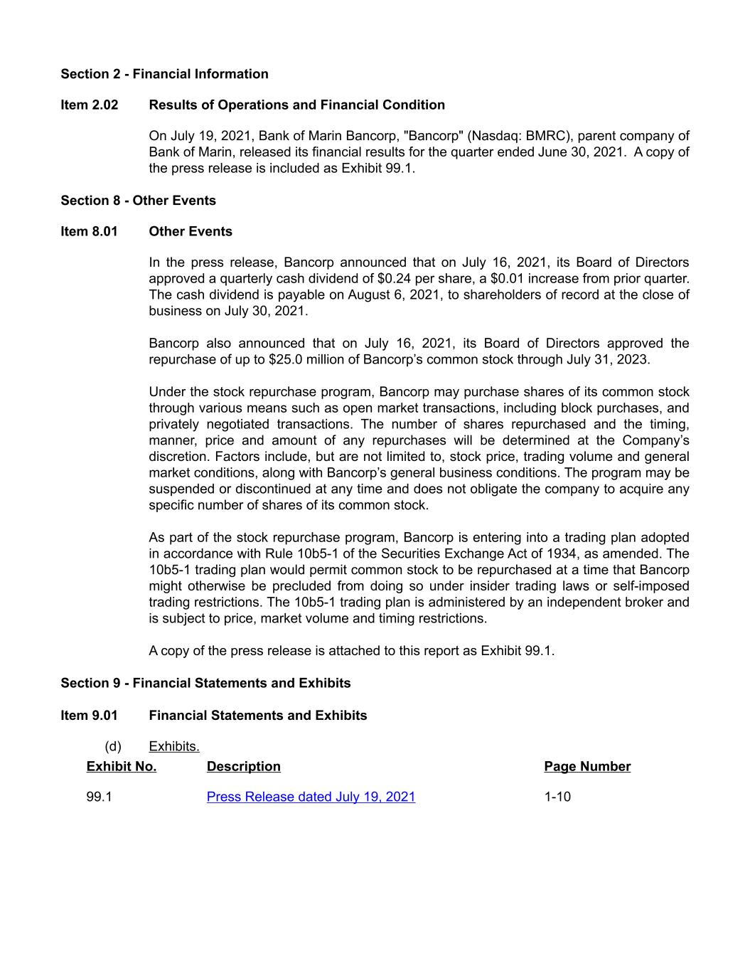 Section 2 - Financial Information Item 2.02 Results of Operations and Financial Condition On July 19, 2021, Bank of Marin Bancorp, "Bancorp" (Nasdaq: BMRC), parent company of Bank of Marin, released its financial results for the quarter ended June 30, 2021. A copy of the press release is included as Exhibit 99.1. Section 8 - Other Events Item 8.01 Other Events In the press release, Bancorp announced that on July 16, 2021, its Board of Directors approved a quarterly cash dividend of $0.24 per share, a $0.01 increase from prior quarter. The cash dividend is payable on August 6, 2021, to shareholders of record at the close of business on July 30, 2021. Bancorp also announced that on July 16, 2021, its Board of Directors approved the repurchase of up to $25.0 million of Bancorp’s common stock through July 31, 2023. Under the stock repurchase program, Bancorp may purchase shares of its common stock through various means such as open market transactions, including block purchases, and privately negotiated transactions. The number of shares repurchased and the timing, manner, price and amount of any repurchases will be determined at the Company’s discretion. Factors include, but are not limited to, stock price, trading volume and general market conditions, along with Bancorp’s general business conditions. The program may be suspended or discontinued at any time and does not obligate the company to acquire any specific number of shares of its common stock. As part of the stock repurchase program, Bancorp is entering into a trading plan adopted in accordance with Rule 10b5-1 of the Securities Exchange Act of 1934, as amended. The 10b5-1 trading plan would permit common stock to be repurchased at a time that Bancorp might otherwise be precluded from doing so under insider trading laws or self-imposed trading restrictions. The 10b5-1 trading plan is administered by an independent broker and is subject to price, market volume and timing restrictions. A copy of the press release is attached to this report as Exhibit 99.1. Section 9 - Financial Statements and Exhibits Item 9.01 Financial Statements and Exhibits (d) Exhibits. Exhibit No. Description Page Number 99.1 Press Release dated July 19, 2021 1-10