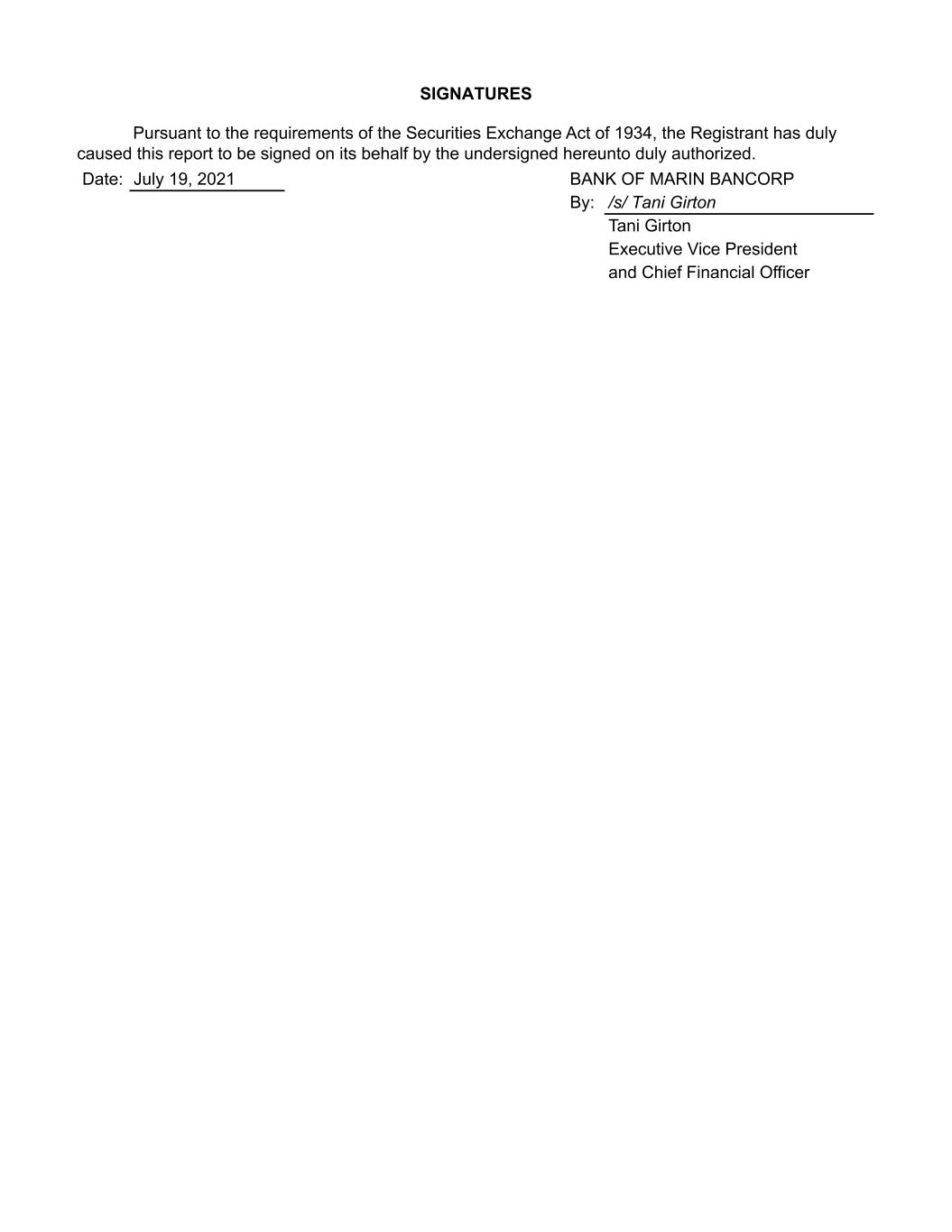 SIGNATURES Pursuant to the requirements of the Securities Exchange Act of 1934, the Registrant has duly caused this report to be signed on its behalf by the undersigned hereunto duly authorized. Date: July 19, 2021 BANK OF MARIN BANCORP By: /s/ Tani Girton Tani Girton Executive Vice President and Chief Financial Officer