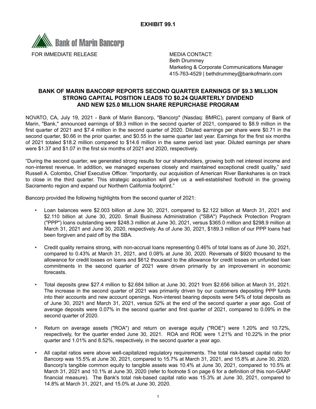 EXHIBIT 99.1 FOR IMMEDIATE RELEASE MEDIA CONTACT: Beth Drummey Marketing & Corporate Communications Manager 415-763-4529 | bethdrummey@bankofmarin.com BANK OF MARIN BANCORP REPORTS SECOND QUARTER EARNINGS OF $9.3 MILLION STRONG CAPITAL POSITION LEADS TO $0.24 QUARTERLY DIVIDEND AND NEW $25.0 MILLION SHARE REPURCHASE PROGRAM NOVATO, CA, July 19, 2021 - Bank of Marin Bancorp, "Bancorp" (Nasdaq: BMRC), parent company of Bank of Marin, "Bank," announced earnings of $9.3 million in the second quarter of 2021, compared to $8.9 million in the first quarter of 2021 and $7.4 million in the second quarter of 2020. Diluted earnings per share were $0.71 in the second quarter, $0.66 in the prior quarter, and $0.55 in the same quarter last year. Earnings for the first six months of 2021 totaled $18.2 million compared to $14.6 million in the same period last year. Diluted earnings per share were $1.37 and $1.07 in the first six months of 2021 and 2020, respectively. “During the second quarter, we generated strong results for our shareholders, growing both net interest income and non-interest revenue. In addition, we managed expenses closely and maintained exceptional credit quality,” said Russell A. Colombo, Chief Executive Officer. “Importantly, our acquisition of American River Bankshares is on track to close in the third quarter. This strategic acquisition will give us a well-established foothold in the growing Sacramento region and expand our Northern California footprint.” Bancorp provided the following highlights from the second quarter of 2021: • Loan balances were $2.003 billion at June 30, 2021, compared to $2.122 billion at March 31, 2021 and $2.110 billion at June 30, 2020. Small Business Administration ("SBA") Paycheck Protection Program ("PPP") loans outstanding were $248.3 million at June 30, 2021, versus $365.0 million and $298.9 million at March 31, 2021 and June 30, 2020, respectively. As of June 30, 2021, $189.3 million of our PPP loans had been forgiven and paid off by the SBA. • Credit quality remains strong, with non-accrual loans representing 0.46% of total loans as of June 30, 2021, compared to 0.43% at March 31, 2021, and 0.08% at June 30, 2020. Reversals of $920 thousand to the allowance for credit losses on loans and $612 thousand to the allowance for credit losses on unfunded loan commitments in the second quarter of 2021 were driven primarily by an improvement in economic forecasts. • Total deposits grew $27.4 million to $2.684 billion at June 30, 2021 from $2.656 billion at March 31, 2021. The increase in the second quarter of 2021 was primarily driven by our customers depositing PPP funds into their accounts and new account openings. Non-interest bearing deposits were 54% of total deposits as of June 30, 2021 and March 31, 2021, versus 52% at the end of the second quarter a year ago. Cost of average deposits were 0.07% in the second quarter and first quarter of 2021, compared to 0.09% in the second quarter of 2020. • Return on average assets ("ROA") and return on average equity ("ROE") were 1.20% and 10.72%, respectively, for the quarter ended June 30, 2021. ROA and ROE were 1.21% and 10.22% in the prior quarter and 1.01% and 8.52%, respectively, in the second quarter a year ago. • All capital ratios were above well-capitalized regulatory requirements. The total risk-based capital ratio for Bancorp was 15.5% at June 30, 2021, compared to 15.7% at March 31, 2021, and 15.8% at June 30, 2020. Bancorp's tangible common equity to tangible assets was 10.4% at June 30, 2021, compared to 10.5% at March 31, 2021 and 10.1% at June 30, 2020 (refer to footnote 5 on page 6 for a definition of this non-GAAP financial measure). The Bank's total risk-based capital ratio was 15.3% at June 30, 2021, compared to 14.8% at March 31, 2021, and 15.0% at June 30, 2020. 1