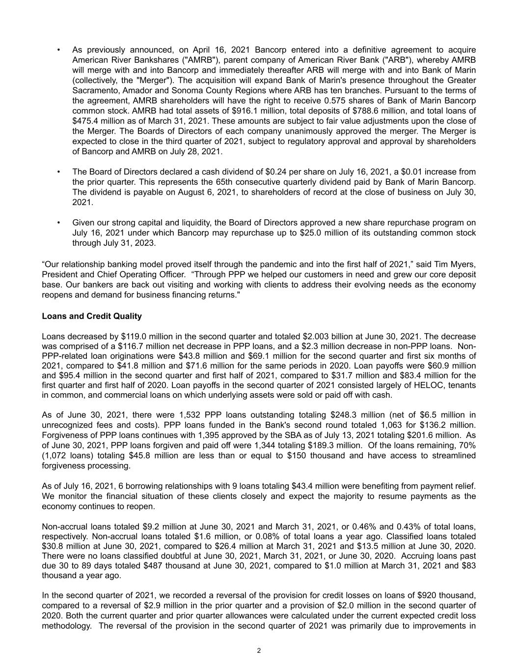 • As previously announced, on April 16, 2021 Bancorp entered into a definitive agreement to acquire American River Bankshares ("AMRB"), parent company of American River Bank ("ARB"), whereby AMRB will merge with and into Bancorp and immediately thereafter ARB will merge with and into Bank of Marin (collectively, the "Merger"). The acquisition will expand Bank of Marin's presence throughout the Greater Sacramento, Amador and Sonoma County Regions where ARB has ten branches. Pursuant to the terms of the agreement, AMRB shareholders will have the right to receive 0.575 shares of Bank of Marin Bancorp common stock. AMRB had total assets of $916.1 million, total deposits of $788.6 million, and total loans of $475.4 million as of March 31, 2021. These amounts are subject to fair value adjustments upon the close of the Merger. The Boards of Directors of each company unanimously approved the merger. The Merger is expected to close in the third quarter of 2021, subject to regulatory approval and approval by shareholders of Bancorp and AMRB on July 28, 2021. • The Board of Directors declared a cash dividend of $0.24 per share on July 16, 2021, a $0.01 increase from the prior quarter. This represents the 65th consecutive quarterly dividend paid by Bank of Marin Bancorp. The dividend is payable on August 6, 2021, to shareholders of record at the close of business on July 30, 2021. • Given our strong capital and liquidity, the Board of Directors approved a new share repurchase program on July 16, 2021 under which Bancorp may repurchase up to $25.0 million of its outstanding common stock through July 31, 2023. “Our relationship banking model proved itself through the pandemic and into the first half of 2021,” said Tim Myers, President and Chief Operating Officer. “Through PPP we helped our customers in need and grew our core deposit base. Our bankers are back out visiting and working with clients to address their evolving needs as the economy reopens and demand for business financing returns." Loans and Credit Quality Loans decreased by $119.0 million in the second quarter and totaled $2.003 billion at June 30, 2021. The decrease was comprised of a $116.7 million net decrease in PPP loans, and a $2.3 million decrease in non-PPP loans. Non- PPP-related loan originations were $43.8 million and $69.1 million for the second quarter and first six months of 2021, compared to $41.8 million and $71.6 million for the same periods in 2020. Loan payoffs were $60.9 million and $95.4 million in the second quarter and first half of 2021, compared to $31.7 million and $83.4 million for the first quarter and first half of 2020. Loan payoffs in the second quarter of 2021 consisted largely of HELOC, tenants in common, and commercial loans on which underlying assets were sold or paid off with cash. As of June 30, 2021, there were 1,532 PPP loans outstanding totaling $248.3 million (net of $6.5 million in unrecognized fees and costs). PPP loans funded in the Bank's second round totaled 1,063 for $136.2 million. Forgiveness of PPP loans continues with 1,395 approved by the SBA as of July 13, 2021 totaling $201.6 million. As of June 30, 2021, PPP loans forgiven and paid off were 1,344 totaling $189.3 million. Of the loans remaining, 70% (1,072 loans) totaling $45.8 million are less than or equal to $150 thousand and have access to streamlined forgiveness processing. As of July 16, 2021, 6 borrowing relationships with 9 loans totaling $43.4 million were benefiting from payment relief. We monitor the financial situation of these clients closely and expect the majority to resume payments as the economy continues to reopen. Non-accrual loans totaled $9.2 million at June 30, 2021 and March 31, 2021, or 0.46% and 0.43% of total loans, respectively. Non-accrual loans totaled $1.6 million, or 0.08% of total loans a year ago. Classified loans totaled $30.8 million at June 30, 2021, compared to $26.4 million at March 31, 2021 and $13.5 million at June 30, 2020. There were no loans classified doubtful at June 30, 2021, March 31, 2021, or June 30, 2020. Accruing loans past due 30 to 89 days totaled $487 thousand at June 30, 2021, compared to $1.0 million at March 31, 2021 and $83 thousand a year ago. In the second quarter of 2021, we recorded a reversal of the provision for credit losses on loans of $920 thousand, compared to a reversal of $2.9 million in the prior quarter and a provision of $2.0 million in the second quarter of 2020. Both the current quarter and prior quarter allowances were calculated under the current expected credit loss methodology. The reversal of the provision in the second quarter of 2021 was primarily due to improvements in 2
