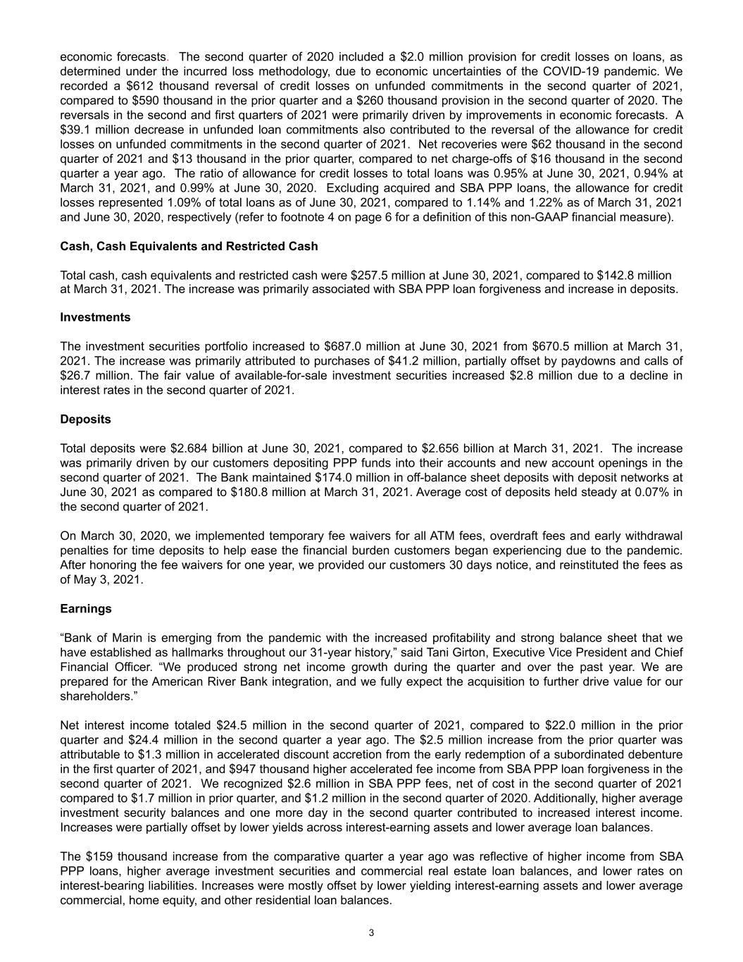 economic forecasts. The second quarter of 2020 included a $2.0 million provision for credit losses on loans, as determined under the incurred loss methodology, due to economic uncertainties of the COVID-19 pandemic. We recorded a $612 thousand reversal of credit losses on unfunded commitments in the second quarter of 2021, compared to $590 thousand in the prior quarter and a $260 thousand provision in the second quarter of 2020. The reversals in the second and first quarters of 2021 were primarily driven by improvements in economic forecasts. A $39.1 million decrease in unfunded loan commitments also contributed to the reversal of the allowance for credit losses on unfunded commitments in the second quarter of 2021. Net recoveries were $62 thousand in the second quarter of 2021 and $13 thousand in the prior quarter, compared to net charge-offs of $16 thousand in the second quarter a year ago. The ratio of allowance for credit losses to total loans was 0.95% at June 30, 2021, 0.94% at March 31, 2021, and 0.99% at June 30, 2020. Excluding acquired and SBA PPP loans, the allowance for credit losses represented 1.09% of total loans as of June 30, 2021, compared to 1.14% and 1.22% as of March 31, 2021 and June 30, 2020, respectively (refer to footnote 4 on page 6 for a definition of this non-GAAP financial measure). Cash, Cash Equivalents and Restricted Cash Total cash, cash equivalents and restricted cash were $257.5 million at June 30, 2021, compared to $142.8 million at March 31, 2021. The increase was primarily associated with SBA PPP loan forgiveness and increase in deposits. Investments The investment securities portfolio increased to $687.0 million at June 30, 2021 from $670.5 million at March 31, 2021. The increase was primarily attributed to purchases of $41.2 million, partially offset by paydowns and calls of $26.7 million. The fair value of available-for-sale investment securities increased $2.8 million due to a decline in interest rates in the second quarter of 2021. Deposits Total deposits were $2.684 billion at June 30, 2021, compared to $2.656 billion at March 31, 2021. The increase was primarily driven by our customers depositing PPP funds into their accounts and new account openings in the second quarter of 2021. The Bank maintained $174.0 million in off-balance sheet deposits with deposit networks at June 30, 2021 as compared to $180.8 million at March 31, 2021. Average cost of deposits held steady at 0.07% in the second quarter of 2021. On March 30, 2020, we implemented temporary fee waivers for all ATM fees, overdraft fees and early withdrawal penalties for time deposits to help ease the financial burden customers began experiencing due to the pandemic. After honoring the fee waivers for one year, we provided our customers 30 days notice, and reinstituted the fees as of May 3, 2021. Earnings “Bank of Marin is emerging from the pandemic with the increased profitability and strong balance sheet that we have established as hallmarks throughout our 31-year history,” said Tani Girton, Executive Vice President and Chief Financial Officer. “We produced strong net income growth during the quarter and over the past year. We are prepared for the American River Bank integration, and we fully expect the acquisition to further drive value for our shareholders.” Net interest income totaled $24.5 million in the second quarter of 2021, compared to $22.0 million in the prior quarter and $24.4 million in the second quarter a year ago. The $2.5 million increase from the prior quarter was attributable to $1.3 million in accelerated discount accretion from the early redemption of a subordinated debenture in the first quarter of 2021, and $947 thousand higher accelerated fee income from SBA PPP loan forgiveness in the second quarter of 2021. We recognized $2.6 million in SBA PPP fees, net of cost in the second quarter of 2021 compared to $1.7 million in prior quarter, and $1.2 million in the second quarter of 2020. Additionally, higher average investment security balances and one more day in the second quarter contributed to increased interest income. Increases were partially offset by lower yields across interest-earning assets and lower average loan balances. The $159 thousand increase from the comparative quarter a year ago was reflective of higher income from SBA PPP loans, higher average investment securities and commercial real estate loan balances, and lower rates on interest-bearing liabilities. Increases were mostly offset by lower yielding interest-earning assets and lower average commercial, home equity, and other residential loan balances. 3