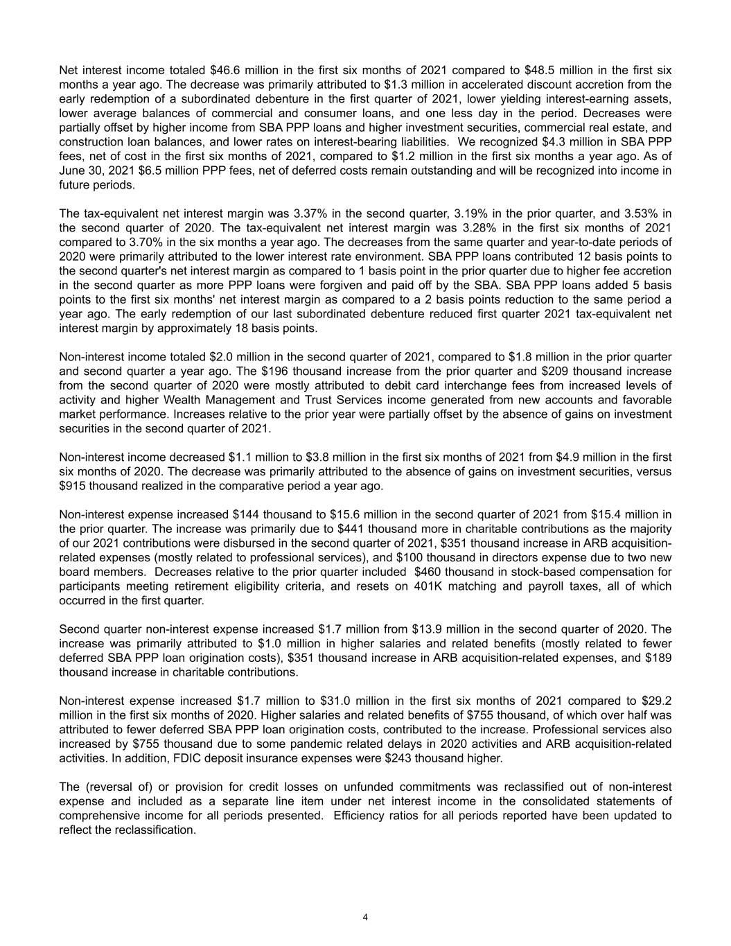 Net interest income totaled $46.6 million in the first six months of 2021 compared to $48.5 million in the first six months a year ago. The decrease was primarily attributed to $1.3 million in accelerated discount accretion from the early redemption of a subordinated debenture in the first quarter of 2021, lower yielding interest-earning assets, lower average balances of commercial and consumer loans, and one less day in the period. Decreases were partially offset by higher income from SBA PPP loans and higher investment securities, commercial real estate, and construction loan balances, and lower rates on interest-bearing liabilities. We recognized $4.3 million in SBA PPP fees, net of cost in the first six months of 2021, compared to $1.2 million in the first six months a year ago. As of June 30, 2021 $6.5 million PPP fees, net of deferred costs remain outstanding and will be recognized into income in future periods. The tax-equivalent net interest margin was 3.37% in the second quarter, 3.19% in the prior quarter, and 3.53% in the second quarter of 2020. The tax-equivalent net interest margin was 3.28% in the first six months of 2021 compared to 3.70% in the six months a year ago. The decreases from the same quarter and year-to-date periods of 2020 were primarily attributed to the lower interest rate environment. SBA PPP loans contributed 12 basis points to the second quarter's net interest margin as compared to 1 basis point in the prior quarter due to higher fee accretion in the second quarter as more PPP loans were forgiven and paid off by the SBA. SBA PPP loans added 5 basis points to the first six months' net interest margin as compared to a 2 basis points reduction to the same period a year ago. The early redemption of our last subordinated debenture reduced first quarter 2021 tax-equivalent net interest margin by approximately 18 basis points. Non-interest income totaled $2.0 million in the second quarter of 2021, compared to $1.8 million in the prior quarter and second quarter a year ago. The $196 thousand increase from the prior quarter and $209 thousand increase from the second quarter of 2020 were mostly attributed to debit card interchange fees from increased levels of activity and higher Wealth Management and Trust Services income generated from new accounts and favorable market performance. Increases relative to the prior year were partially offset by the absence of gains on investment securities in the second quarter of 2021. Non-interest income decreased $1.1 million to $3.8 million in the first six months of 2021 from $4.9 million in the first six months of 2020. The decrease was primarily attributed to the absence of gains on investment securities, versus $915 thousand realized in the comparative period a year ago. Non-interest expense increased $144 thousand to $15.6 million in the second quarter of 2021 from $15.4 million in the prior quarter. The increase was primarily due to $441 thousand more in charitable contributions as the majority of our 2021 contributions were disbursed in the second quarter of 2021, $351 thousand increase in ARB acquisition- related expenses (mostly related to professional services), and $100 thousand in directors expense due to two new board members. Decreases relative to the prior quarter included $460 thousand in stock-based compensation for participants meeting retirement eligibility criteria, and resets on 401K matching and payroll taxes, all of which occurred in the first quarter. Second quarter non-interest expense increased $1.7 million from $13.9 million in the second quarter of 2020. The increase was primarily attributed to $1.0 million in higher salaries and related benefits (mostly related to fewer deferred SBA PPP loan origination costs), $351 thousand increase in ARB acquisition-related expenses, and $189 thousand increase in charitable contributions. Non-interest expense increased $1.7 million to $31.0 million in the first six months of 2021 compared to $29.2 million in the first six months of 2020. Higher salaries and related benefits of $755 thousand, of which over half was attributed to fewer deferred SBA PPP loan origination costs, contributed to the increase. Professional services also increased by $755 thousand due to some pandemic related delays in 2020 activities and ARB acquisition-related activities. In addition, FDIC deposit insurance expenses were $243 thousand higher. The (reversal of) or provision for credit losses on unfunded commitments was reclassified out of non-interest expense and included as a separate line item under net interest income in the consolidated statements of comprehensive income for all periods presented. Efficiency ratios for all periods reported have been updated to reflect the reclassification. 4