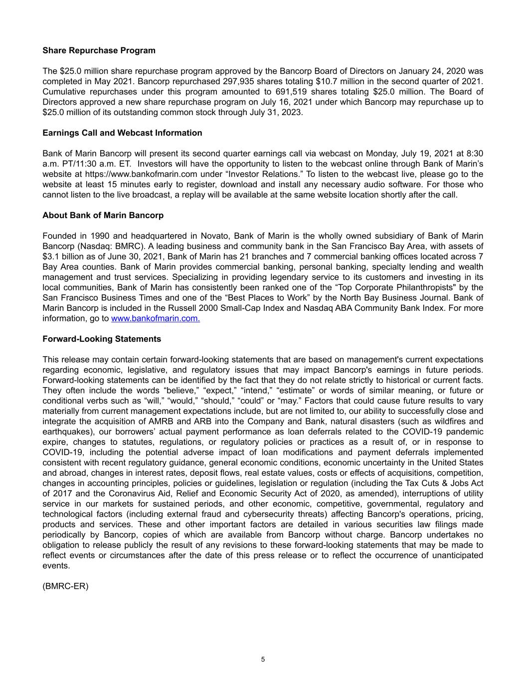Share Repurchase Program The $25.0 million share repurchase program approved by the Bancorp Board of Directors on January 24, 2020 was completed in May 2021. Bancorp repurchased 297,935 shares totaling $10.7 million in the second quarter of 2021. Cumulative repurchases under this program amounted to 691,519 shares totaling $25.0 million. The Board of Directors approved a new share repurchase program on July 16, 2021 under which Bancorp may repurchase up to $25.0 million of its outstanding common stock through July 31, 2023. Earnings Call and Webcast Information Bank of Marin Bancorp will present its second quarter earnings call via webcast on Monday, July 19, 2021 at 8:30 a.m. PT/11:30 a.m. ET. Investors will have the opportunity to listen to the webcast online through Bank of Marin’s website at https://www.bankofmarin.com under “Investor Relations.” To listen to the webcast live, please go to the website at least 15 minutes early to register, download and install any necessary audio software. For those who cannot listen to the live broadcast, a replay will be available at the same website location shortly after the call. About Bank of Marin Bancorp Founded in 1990 and headquartered in Novato, Bank of Marin is the wholly owned subsidiary of Bank of Marin Bancorp (Nasdaq: BMRC). A leading business and community bank in the San Francisco Bay Area, with assets of $3.1 billion as of June 30, 2021, Bank of Marin has 21 branches and 7 commercial banking offices located across 7 Bay Area counties. Bank of Marin provides commercial banking, personal banking, specialty lending and wealth management and trust services. Specializing in providing legendary service to its customers and investing in its local communities, Bank of Marin has consistently been ranked one of the “Top Corporate Philanthropists" by the San Francisco Business Times and one of the “Best Places to Work” by the North Bay Business Journal. Bank of Marin Bancorp is included in the Russell 2000 Small-Cap Index and Nasdaq ABA Community Bank Index. For more information, go to www.bankofmarin.com. Forward-Looking Statements This release may contain certain forward-looking statements that are based on management's current expectations regarding economic, legislative, and regulatory issues that may impact Bancorp's earnings in future periods. Forward-looking statements can be identified by the fact that they do not relate strictly to historical or current facts. They often include the words “believe,” “expect,” “intend,” “estimate” or words of similar meaning, or future or conditional verbs such as “will,” “would,” “should,” “could” or “may.” Factors that could cause future results to vary materially from current management expectations include, but are not limited to, our ability to successfully close and integrate the acquisition of AMRB and ARB into the Company and Bank, natural disasters (such as wildfires and earthquakes), our borrowers’ actual payment performance as loan deferrals related to the COVID-19 pandemic expire, changes to statutes, regulations, or regulatory policies or practices as a result of, or in response to COVID-19, including the potential adverse impact of loan modifications and payment deferrals implemented consistent with recent regulatory guidance, general economic conditions, economic uncertainty in the United States and abroad, changes in interest rates, deposit flows, real estate values, costs or effects of acquisitions, competition, changes in accounting principles, policies or guidelines, legislation or regulation (including the Tax Cuts & Jobs Act of 2017 and the Coronavirus Aid, Relief and Economic Security Act of 2020, as amended), interruptions of utility service in our markets for sustained periods, and other economic, competitive, governmental, regulatory and technological factors (including external fraud and cybersecurity threats) affecting Bancorp's operations, pricing, products and services. These and other important factors are detailed in various securities law filings made periodically by Bancorp, copies of which are available from Bancorp without charge. Bancorp undertakes no obligation to release publicly the result of any revisions to these forward-looking statements that may be made to reflect events or circumstances after the date of this press release or to reflect the occurrence of unanticipated events. (BMRC-ER) 5