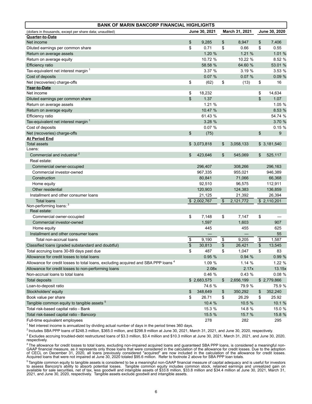 BANK OF MARIN BANCORP FINANCIAL HIGHLIGHTS (dollars in thousands, except per share data; unaudited) June 30, 2021 March 31, 2021 June 30, 2020 Quarter-to-Date Net income $ 9,285 $ 8,947 $ 7,406 Diluted earnings per common share $ 0.71 $ 0.66 $ 0.55 Return on average assets 1.20 % 1.21 % 1.01 % Return on average equity 10.72 % 10.22 % 8.52 % Efficiency ratio 58.58 % 64.60 % 53.01 % Tax-equivalent net interest margin 1 3.37 % 3.19 % 3.53 % Cost of deposits 0.07 % 0.07 % 0.09 % Net (recoveries) charge-offs $ (62) $ (13) $ 16 Year-to-Date Net income $ 18,232 $ 14,634 Diluted earnings per common share $ 1.37 $ 1.07 Return on average assets 1.21 % 1.05 % Return on average equity 10.47 % 8.53 % Efficiency ratio 61.43 % 54.74 % Tax-equivalent net interest margin 1 3.28 % 3.70 % Cost of deposits 0.07 % 0.15 % Net (recoveries) charge-offs $ (75) $ 9 At Period End Total assets $ 3,073,818 $ 3,058,133 $ 3,181,540 Loans: Commercial and industrial 2 $ 423,646 $ 545,069 $ 525,117 Real estate: Commercial owner-occupied 296,407 308,266 296,163 Commercial investor-owned 967,335 955,021 946,389 Construction 80,841 71,066 66,368 Home equity 92,510 96,575 112,911 Other residential 120,903 124,383 136,859 Installment and other consumer loans 21,125 21,392 26,394 Total loans $ 2,002,767 $ 2,121,772 $ 2,110,201 Non-performing loans: 3 Real estate: Commercial owner-occupied $ 7,148 $ 7,147 $ — Commercial investor-owned 1,597 1,603 907 Home equity 445 455 625 Installment and other consumer loans — — 55 Total non-accrual loans $ 9,190 $ 9,205 $ 1,587 Classified loans (graded substandard and doubtful) $ 30,813 $ 26,421 $ 13,545 Total accruing loans 30-89 days past due $ 487 $ 1,047 $ 83 Allowance for credit losses to total loans 0.95 % 0.94 % 0.99 % Allowance for credit losses to total loans, excluding acquired and SBA PPP loans 4 1.09 % 1.14 % 1.22 % Allowance for credit losses to non-performing loans 2.08x 2.17x 13.15x Non-accrual loans to total loans 0.46 % 0.43 % 0.08 % Total deposits $ 2,683,575 $ 2,656,199 $ 2,779,866 Loan-to-deposit ratio 74.6 % 79.9 % 75.9 % Stockholders' equity $ 348,649 $ 350,292 $ 352,240 Book value per share $ 26.71 $ 26.29 $ 25.92 Tangible common equity to tangible assets 5 10.4 % 10.5 % 10.1 % Total risk-based capital ratio - Bank 15.3 % 14.8 % 15.0 % Total risk-based capital ratio - Bancorp 15.5 % 15.7 % 15.8 % Full-time equivalent employees 278 282 295 1 Net interest income is annualized by dividing actual number of days in the period times 360 days. 2 Includes SBA PPP loans of $248.3 million, $365.0 million, and $298.9 million at June 30, 2021, March 31, 2021, and June 30, 2020, respectively. 3 Excludes accruing troubled-debt restructured loans of $3.3 million, $3.4 million and $10.3 million at June 30, 2021, March 31, 2021, and June 30, 2020, respectively. 4 The allowance for credit losses to total loans, excluding non-impaired acquired loans and guaranteed SBA PPP loans, is considered a meaningful non- GAAP financial measure, as it represents only those loans that were considered in the calculation of the allowance for credit losses. Due to the adoption of CECL on December 31, 2020, all loans previously considered "acquired" are now included in the calculation of the allowance for credit losses. Acquired loans that were not impaired at June 30, 2020 totaled $95.6 million. Refer to footnote 2 above for SBA PPP loan totals. 5 Tangible common equity to tangible assets is considered to be a meaningful non-GAAP financial measure of capital adequacy and is useful for investors to assess Bancorp's ability to absorb potential losses. Tangible common equity includes common stock, retained earnings and unrealized gain on available for sale securities, net of tax, less goodwill and intangible assets of $33.6 million, $33.8 million and $34.4 million at June 30, 2021, March 31, 2021, and June 30, 2020, respectively. Tangible assets exclude goodwill and intangible assets. 6