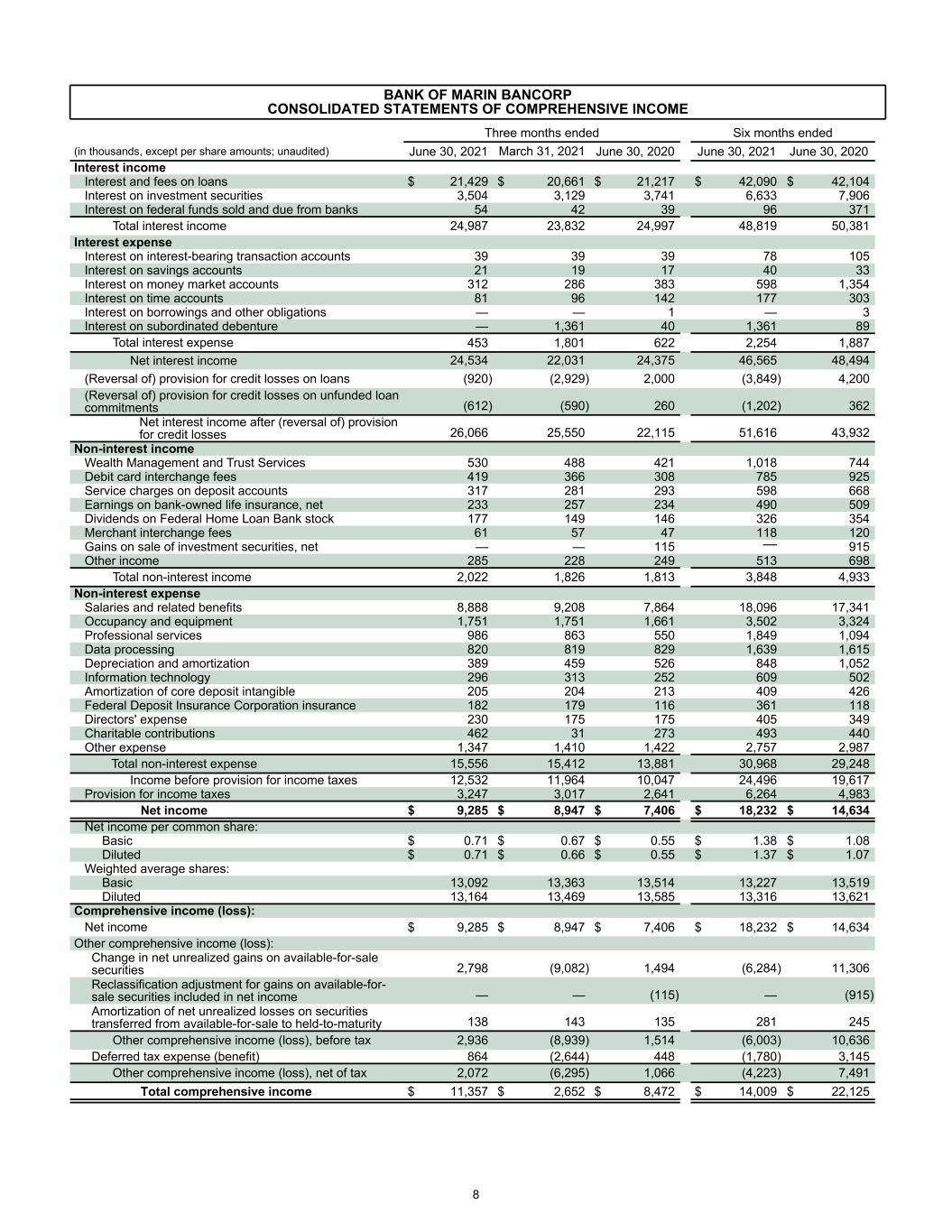 BANK OF MARIN BANCORP CONSOLIDATED STATEMENTS OF COMPREHENSIVE INCOME Three months ended Six months ended (in thousands, except per share amounts; unaudited) June 30, 2021 March 31, 2021 June 30, 2020 June 30, 2021 June 30, 2020 Interest income Interest and fees on loans $ 21,429 $ 20,661 $ 21,217 $ 42,090 $ 42,104 Interest on investment securities 3,504 3,129 3,741 6,633 7,906 Interest on federal funds sold and due from banks 54 42 39 96 371 Total interest income 24,987 23,832 24,997 48,819 50,381 Interest expense Interest on interest-bearing transaction accounts 39 39 39 78 105 Interest on savings accounts 21 19 17 40 33 Interest on money market accounts 312 286 383 598 1,354 Interest on time accounts 81 96 142 177 303 Interest on borrowings and other obligations — — 1 — 3 Interest on subordinated debenture — 1,361 40 1,361 89 Total interest expense 453 1,801 622 2,254 1,887 Net interest income 24,534 22,031 24,375 46,565 48,494 (Reversal of) provision for credit losses on loans (920) (2,929) 2,000 (3,849) 4,200 (Reversal of) provision for credit losses on unfunded loan commitments (612) (590) 260 (1,202) 362 Net interest income after (reversal of) provision for credit losses 26,066 25,550 22,115 51,616 43,932 Non-interest income Wealth Management and Trust Services 530 488 421 1,018 744 Debit card interchange fees 419 366 308 785 925 Service charges on deposit accounts 317 281 293 598 668 Earnings on bank-owned life insurance, net 233 257 234 490 509 Dividends on Federal Home Loan Bank stock 177 149 146 326 354 Merchant interchange fees 61 57 47 118 120 Gains on sale of investment securities, net — — 115 — 915 Other income 285 228 249 513 698 Total non-interest income 2,022 1,826 1,813 3,848 4,933 Non-interest expense Salaries and related benefits 8,888 9,208 7,864 18,096 17,341 Occupancy and equipment 1,751 1,751 1,661 3,502 3,324 Professional services 986 863 550 1,849 1,094 Data processing 820 819 829 1,639 1,615 Depreciation and amortization 389 459 526 848 1,052 Information technology 296 313 252 609 502 Amortization of core deposit intangible 205 204 213 409 426 Federal Deposit Insurance Corporation insurance 182 179 116 361 118 Directors' expense 230 175 175 405 349 Charitable contributions 462 31 273 493 440 Other expense 1,347 1,410 1,422 2,757 2,987 Total non-interest expense 15,556 15,412 13,881 30,968 29,248 Income before provision for income taxes 12,532 11,964 10,047 24,496 19,617 Provision for income taxes 3,247 3,017 2,641 6,264 4,983 Net income $ 9,285 $ 8,947 $ 7,406 $ 18,232 $ 14,634 Net income per common share: Basic $ 0.71 $ 0.67 $ 0.55 $ 1.38 $ 1.08 Diluted $ 0.71 $ 0.66 $ 0.55 $ 1.37 $ 1.07 Weighted average shares: Basic 13,092 13,363 13,514 13,227 13,519 Diluted 13,164 13,469 13,585 13,316 13,621 Comprehensive income (loss): Net income $ 9,285 $ 8,947 $ 7,406 $ 18,232 $ 14,634 Other comprehensive income (loss): Change in net unrealized gains on available-for-sale securities 2,798 (9,082) 1,494 (6,284) 11,306 Reclassification adjustment for gains on available-for- sale securities included in net income — — (115) — (915) Amortization of net unrealized losses on securities transferred from available-for-sale to held-to-maturity 138 143 135 281 245 Other comprehensive income (loss), before tax 2,936 (8,939) 1,514 (6,003) 10,636 Deferred tax expense (benefit) 864 (2,644) 448 (1,780) 3,145 Other comprehensive income (loss), net of tax 2,072 (6,295) 1,066 (4,223) 7,491 Total comprehensive income $ 11,357 $ 2,652 $ 8,472 $ 14,009 $ 22,125 8