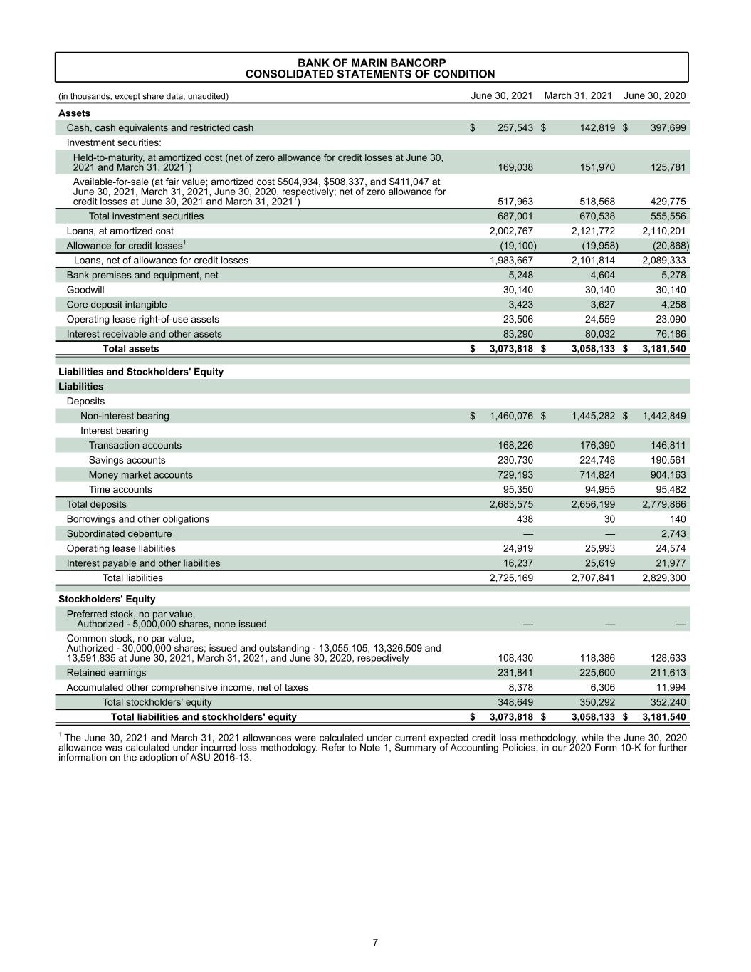 BANK OF MARIN BANCORP CONSOLIDATED STATEMENTS OF CONDITION (in thousands, except share data; unaudited) June 30, 2021 March 31, 2021 June 30, 2020 Assets Cash, cash equivalents and restricted cash $ 257,543 $ 142,819 $ 397,699 Investment securities: Held-to-maturity, at amortized cost (net of zero allowance for credit losses at June 30, 2021 and March 31, 20211) 169,038 151,970 125,781 Available-for-sale (at fair value; amortized cost $504,934, $508,337, and $411,047 at June 30, 2021, March 31, 2021, June 30, 2020, respectively; net of zero allowance for credit losses at June 30, 2021 and March 31, 20211) 517,963 518,568 429,775 Total investment securities 687,001 670,538 555,556 Loans, at amortized cost 2,002,767 2,121,772 2,110,201 Allowance for credit losses1 (19,100) (19,958) (20,868) Loans, net of allowance for credit losses 1,983,667 2,101,814 2,089,333 Bank premises and equipment, net 5,248 4,604 5,278 Goodwill 30,140 30,140 30,140 Core deposit intangible 3,423 3,627 4,258 Operating lease right-of-use assets 23,506 24,559 23,090 Interest receivable and other assets 83,290 80,032 76,186 Total assets $ 3,073,818 $ 3,058,133 $ 3,181,540 Liabilities and Stockholders' Equity Liabilities Deposits Non-interest bearing $ 1,460,076 $ 1,445,282 $ 1,442,849 Interest bearing Transaction accounts 168,226 176,390 146,811 Savings accounts 230,730 224,748 190,561 Money market accounts 729,193 714,824 904,163 Time accounts 95,350 94,955 95,482 Total deposits 2,683,575 2,656,199 2,779,866 Borrowings and other obligations 438 30 140 Subordinated debenture — — 2,743 Operating lease liabilities 24,919 25,993 24,574 Interest payable and other liabilities 16,237 25,619 21,977 Total liabilities 2,725,169 2,707,841 2,829,300 Stockholders' Equity Preferred stock, no par value, Authorized - 5,000,000 shares, none issued — — — Common stock, no par value, Authorized - 30,000,000 shares; issued and outstanding - 13,055,105, 13,326,509 and 13,591,835 at June 30, 2021, March 31, 2021, and June 30, 2020, respectively 108,430 118,386 128,633 Retained earnings 231,841 225,600 211,613 Accumulated other comprehensive income, net of taxes 8,378 6,306 11,994 Total stockholders' equity 348,649 350,292 352,240 Total liabilities and stockholders' equity $ 3,073,818 $ 3,058,133 $ 3,181,540 1 The June 30, 2021 and March 31, 2021 allowances were calculated under current expected credit loss methodology, while the June 30, 2020 allowance was calculated under incurred loss methodology. Refer to Note 1, Summary of Accounting Policies, in our 2020 Form 10-K for further information on the adoption of ASU 2016-13. 7