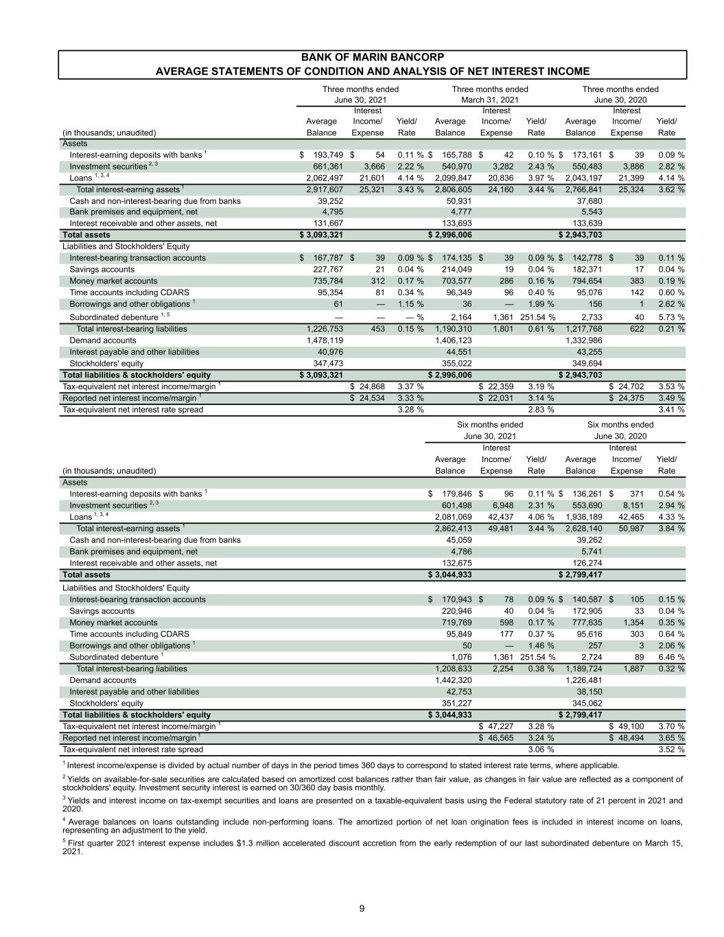 BANK OF MARIN BANCORP AVERAGE STATEMENTS OF CONDITION AND ANALYSIS OF NET INTEREST INCOME Three months ended Three months ended Three months ended June 30, 2021 March 31, 2021 June 30, 2020 Interest Interest Interest Average Income/ Yield/ Average Income/ Yield/ Average Income/ Yield/ (in thousands; unaudited) Balance Expense Rate Balance Expense Rate Balance Expense Rate Assets Interest-earning deposits with banks 1 $ 193,749 $ 54 0.11 % $ 165,788 $ 42 0.10 % $ 173,161 $ 39 0.09 % Investment securities 2, 3 661,361 3,666 2.22 % 540,970 3,282 2.43 % 550,483 3,886 2.82 % Loans 1, 3, 4 2,062,497 21,601 4.14 % 2,099,847 20,836 3.97 % 2,043,197 21,399 4.14 % Total interest-earning assets 1 2,917,607 25,321 3.43 % 2,806,605 24,160 3.44 % 2,766,841 25,324 3.62 % Cash and non-interest-bearing due from banks 39,252 50,931 37,680 Bank premises and equipment, net 4,795 4,777 5,543 Interest receivable and other assets, net 131,667 133,693 133,639 Total assets $ 3,093,321 $ 2,996,006 $ 2,943,703 Liabilities and Stockholders' Equity Interest-bearing transaction accounts $ 167,787 $ 39 0.09 % $ 174,135 $ 39 0.09 % $ 142,778 $ 39 0.11 % Savings accounts 227,767 21 0.04 % 214,049 19 0.04 % 182,371 17 0.04 % Money market accounts 735,784 312 0.17 % 703,577 286 0.16 % 794,654 383 0.19 % Time accounts including CDARS 95,354 81 0.34 % 96,349 96 0.40 % 95,076 142 0.60 % Borrowings and other obligations 1 61 — 1.15 % 36 — 1.99 % 156 1 2.62 % Subordinated debenture 1, 5 — — — % 2,164 1,361 251.54 % 2,733 40 5.73 % Total interest-bearing liabilities 1,226,753 453 0.15 % 1,190,310 1,801 0.61 % 1,217,768 622 0.21 % Demand accounts 1,478,119 1,406,123 1,332,986 Interest payable and other liabilities 40,976 44,551 43,255 Stockholders' equity 347,473 355,022 349,694 Total liabilities & stockholders' equity $ 3,093,321 $ 2,996,006 $ 2,943,703 Tax-equivalent net interest income/margin 1 $ 24,868 3.37 % $ 22,359 3.19 % $ 24,702 3.53 % Reported net interest income/margin 1 $ 24,534 3.33 % $ 22,031 3.14 % $ 24,375 3.49 % Tax-equivalent net interest rate spread 3.28 % 2.83 % 3.41 % Six months ended Six months ended June 30, 2021 June 30, 2020 Interest Interest Average Income/ Yield/ Average Income/ Yield/ (in thousands; unaudited) Balance Expense Rate Balance Expense Rate Assets Interest-earning deposits with banks 1 $ 179,846 $ 96 0.11 % $ 136,261 $ 371 0.54 % Investment securities 2, 3 601,498 6,948 2.31 % 553,690 8,151 2.94 % Loans 1, 3, 4 2,081,069 42,437 4.06 % 1,938,189 42,465 4.33 % Total interest-earning assets 1 2,862,413 49,481 3.44 % 2,628,140 50,987 3.84 % Cash and non-interest-bearing due from banks 45,059 39,262 Bank premises and equipment, net 4,786 5,741 Interest receivable and other assets, net 132,675 126,274 Total assets $ 3,044,933 $ 2,799,417 Liabilities and Stockholders' Equity Interest-bearing transaction accounts $ 170,943 $ 78 0.09 % $ 140,587 $ 105 0.15 % Savings accounts 220,946 40 0.04 % 172,905 33 0.04 % Money market accounts 719,769 598 0.17 % 777,635 1,354 0.35 % Time accounts including CDARS 95,849 177 0.37 % 95,616 303 0.64 % Borrowings and other obligations 1 50 — 1.46 % 257 3 2.06 % Subordinated debenture 1 1,076 1,361 251.54 % 2,724 89 6.46 % Total interest-bearing liabilities 1,208,633 2,254 0.38 % 1,189,724 1,887 0.32 % Demand accounts 1,442,320 1,226,481 Interest payable and other liabilities 42,753 38,150 Stockholders' equity 351,227 345,062 Total liabilities & stockholders' equity $ 3,044,933 $ 2,799,417 Tax-equivalent net interest income/margin 1 $ 47,227 3.28 % $ 49,100 3.70 % Reported net interest income/margin 1 $ 46,565 3.24 % $ 48,494 3.65 % Tax-equivalent net interest rate spread 3.06 % 3.52 % 1 Interest income/expense is divided by actual number of days in the period times 360 days to correspond to stated interest rate terms, where applicable. 2 Yields on available-for-sale securities are calculated based on amortized cost balances rather than fair value, as changes in fair value are reflected as a component of stockholders' equity. Investment security interest is earned on 30/360 day basis monthly. 3 Yields and interest income on tax-exempt securities and loans are presented on a taxable-equivalent basis using the Federal statutory rate of 21 percent in 2021 and 2020. 4 Average balances on loans outstanding include non-performing loans. The amortized portion of net loan origination fees is included in interest income on loans, representing an adjustment to the yield. 5 First quarter 2021 interest expense includes $1.3 million accelerated discount accretion from the early redemption of our last subordinated debenture on March 15, 2021. 9