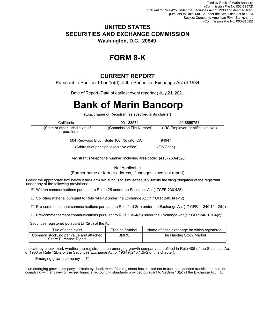 UNITED STATES SECURITIES AND EXCHANGE COMMISSION Washington, D.C. 20549 FORM 8-K CURRENT REPORT Pursuant to Section 13 or 15(d) of the Securities Exchange Act of 1934 Date of Report (Date of earliest event reported) July 21, 2021 Bank of Marin Bancorp (Exact name of Registrant as specified in its charter) California 001-33572 20-8859754 (State or other jurisdiction of incorporation) (Commission File Number) (IRS Employer Identification No.) 504 Redwood Blvd., Suite 100, Novato, CA 94947 (Address of principal executive office) (Zip Code) Registrant’s telephone number, including area code: (415) 763-4520 Not Applicable (Former name or former address, if changes since last report) Check the appropriate box below if the Form 8-K filing is to simultaneously satisfy the filing obligation of the registrant under any of the following provisions: ☒ Written communications pursuant to Rule 425 under the Securities Act (17CFR 230.425) ☐ Soliciting material pursuant to Rule 14a-12 under the Exchange Act (17 CFR 240.14a-12) ☐ Pre-commencement communications pursuant to Rule 14d-2(b) under the Exchange Act (17 CFR 240.14d-2(b)) ☐ Pre-commencement communications pursuant to Rule 13e-4(c)) under the Exchange Act (17 CFR 240.13e-4(c)) Securities registered pursuant to 12(b) of the Act: Title of each class Trading Symbol Name of each exchange on which registered Common stock, no par value and attached Share Purchase Rights BMRC The Nasdaq Stock Market Indicate by check mark whether the registrant is an emerging growth company as defined in Rule 405 of the Securities Act of 1933 or Rule 12b-2 of the Securities Exchange Act of 1934 (§240.12b-2 of this chapter). Emerging growth company ☐ If an emerging growth company, indicate by check mark if the registrant has elected not to use the extended transition period for complying with any new or revised financial accounting standards provided pursuant to Section 13(a) of the Exchange Act. ☐