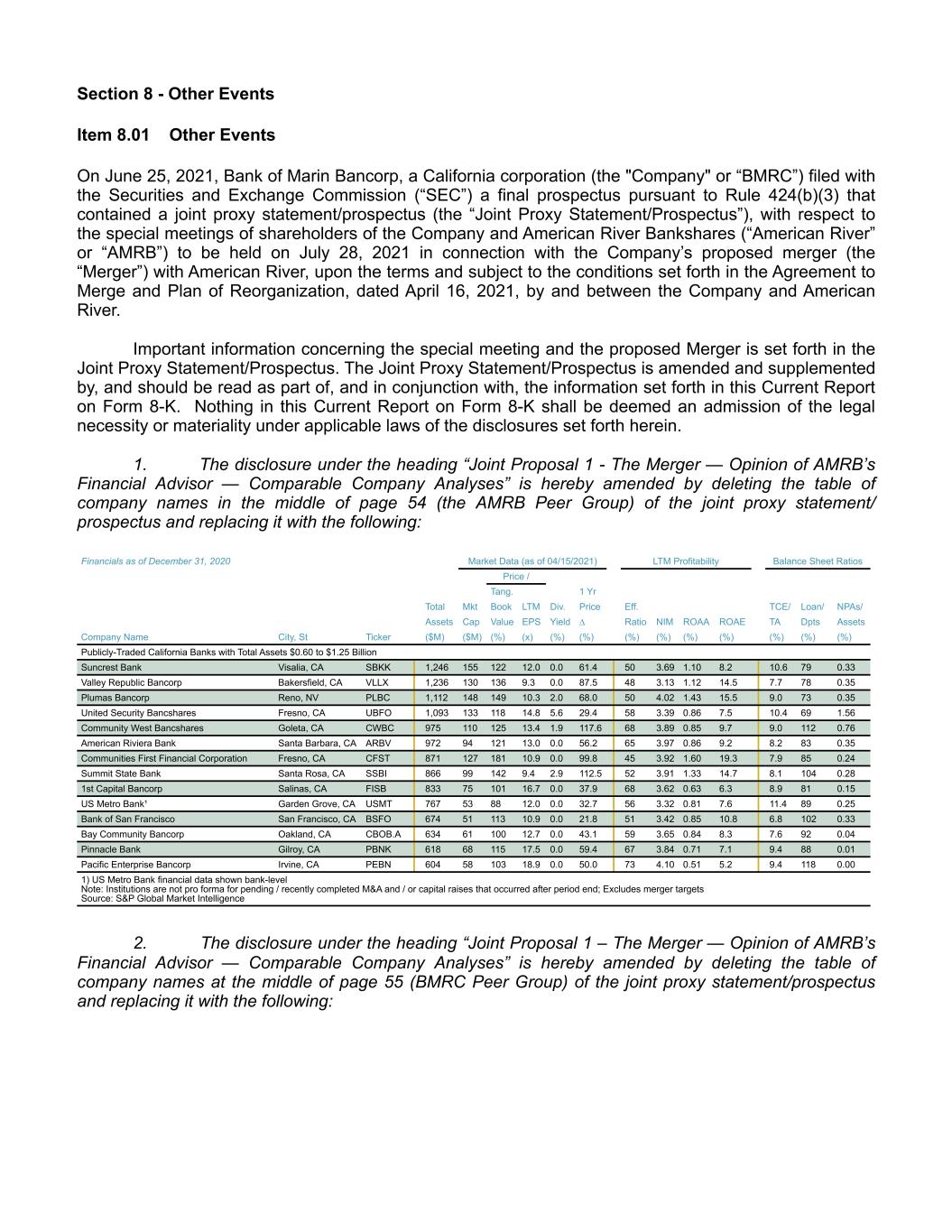Section 8 - Other Events Item 8.01 Other Events On June 25, 2021, Bank of Marin Bancorp, a California corporation (the "Company" or “BMRC”) filed with the Securities and Exchange Commission (“SEC”) a final prospectus pursuant to Rule 424(b)(3) that contained a joint proxy statement/prospectus (the “Joint Proxy Statement/Prospectus”), with respect to the special meetings of shareholders of the Company and American River Bankshares (“American River” or “AMRB”) to be held on July 28, 2021 in connection with the Company’s proposed merger (the “Merger”) with American River, upon the terms and subject to the conditions set forth in the Agreement to Merge and Plan of Reorganization, dated April 16, 2021, by and between the Company and American River. Important information concerning the special meeting and the proposed Merger is set forth in the Joint Proxy Statement/Prospectus. The Joint Proxy Statement/Prospectus is amended and supplemented by, and should be read as part of, and in conjunction with, the information set forth in this Current Report on Form 8-K. Nothing in this Current Report on Form 8-K shall be deemed an admission of the legal necessity or materiality under applicable laws of the disclosures set forth herein. 1. The disclosure under the heading “Joint Proposal 1 - The Merger — Opinion of AMRB’s Financial Advisor — Comparable Company Analyses” is hereby amended by deleting the table of company names in the middle of page 54 (the AMRB Peer Group) of the joint proxy statement/ prospectus and replacing it with the following: Financials as of December 31, 2020 Market Data (as of 04/15/2021) LTM Profitability Balance Sheet Ratios Price / Tang. 1 Yr Total Mkt Book LTM Div. Price Eff. TCE/ Loan/ NPAs/ Assets Cap Value EPS Yield ∆ Ratio NIM ROAA ROAE TA Dpts Assets Company Name City, St Ticker ($M) ($M) (%) (x) (%) (%) (%) (%) (%) (%) (%) (%) (%) Publicly-Traded California Banks with Total Assets $0.60 to $1.25 Billion Suncrest Bank Visalia, CA SBKK 1,246 155 122 12.0 0.0 61.4 50 3.69 1.10 8.2 10.6 79 0.33 Valley Republic Bancorp Bakersfield, CA VLLX 1,236 130 136 9.3 0.0 87.5 48 3.13 1.12 14.5 7.7 78 0.35 Plumas Bancorp Reno, NV PLBC 1,112 148 149 10.3 2.0 68.0 50 4.02 1.43 15.5 9.0 73 0.35 United Security Bancshares Fresno, CA UBFO 1,093 133 118 14.8 5.6 29.4 58 3.39 0.86 7.5 10.4 69 1.56 Community West Bancshares Goleta, CA CWBC 975 110 125 13.4 1.9 117.6 68 3.89 0.85 9.7 9.0 112 0.76 American Riviera Bank Santa Barbara, CA ARBV 972 94 121 13.0 0.0 56.2 65 3.97 0.86 9.2 8.2 83 0.35 Communities First Financial Corporation Fresno, CA CFST 871 127 181 10.9 0.0 99.8 45 3.92 1.60 19.3 7.9 85 0.24 Summit State Bank Santa Rosa, CA SSBI 866 99 142 9.4 2.9 112.5 52 3.91 1.33 14.7 8.1 104 0.28 1st Capital Bancorp Salinas, CA FISB 833 75 101 16.7 0.0 37.9 68 3.62 0.63 6.3 8.9 81 0.15 US Metro Bank¹ Garden Grove, CA USMT 767 53 88 12.0 0.0 32.7 56 3.32 0.81 7.6 11.4 89 0.25 Bank of San Francisco San Francisco, CA BSFO 674 51 113 10.9 0.0 21.8 51 3.42 0.85 10.8 6.8 102 0.33 Bay Community Bancorp Oakland, CA CBOB.A 634 61 100 12.7 0.0 43.1 59 3.65 0.84 8.3 7.6 92 0.04 Pinnacle Bank Gilroy, CA PBNK 618 68 115 17.5 0.0 59.4 67 3.84 0.71 7.1 9.4 88 0.01 Pacific Enterprise Bancorp Irvine, CA PEBN 604 58 103 18.9 0.0 50.0 73 4.10 0.51 5.2 9.4 118 0.00 1) US Metro Bank financial data shown bank-level Note: Institutions are not pro forma for pending / recently completed M&A and / or capital raises that occurred after period end; Excludes merger targets Source: S&P Global Market Intelligence 2. The disclosure under the heading “Joint Proposal 1 – The Merger — Opinion of AMRB’s Financial Advisor — Comparable Company Analyses” is hereby amended by deleting the table of company names at the middle of page 55 (BMRC Peer Group) of the joint proxy statement/prospectus and replacing it with the following: