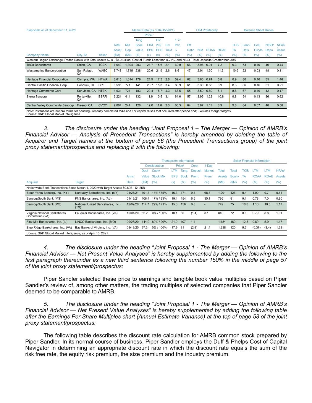 Financials as of December 31, 2020 Market Data (as of 04/15/2021) LTM Profitability Balance Sheet Ratios Price / Tang. Est. 1 Yr Total Mkt Book LTM 202 1 Div. Pric e Eff. TCE/ Loan/ Cost of NIBD/ NPAs /Asset s Cap Value EPS EPS Yield ∆ Ratio NIM ROAA ROAE TA Dpts Funds Depo sits Asset sCompany Name City, St Ticker ($M) ($M) (%) (x) (x) (%) (%) (%) (%) (%) (%) (%) (%) (%) (%) (%) Western Region Exchange-Traded Banks with Total Assets $2.0 - $8.0 Billion, Cost of Funds Less than 0.25%, and NIBD / Total Deposits Greater than 30% TriCo Bancshares Chico, CA TCBK 7,640 1,394 203 21.7 15.6 2.1 60.0 56 3.96 0.91 7.2 9.3 73 0.10 40 0.44 Westamerica Bancorporation San Rafael, CA WABC 6,748 1,715 238 20.6 21.9 2.6 8.6 47 2.91 1.30 11.3 10.9 22 0.03 48 0.11 Heritage Financial Corporation Olympia, WA HFWA 6,615 1,014 179 21.9 17.3 2.8 52.4 62 3.60 0.74 5.8 8.9 80 0.16 35 1.46 Central Pacific Financial Corp. Honolulu, HI CPF 6,595 771 141 20.7 15.8 3.4 88.9 61 3.30 0.58 6.9 8.3 86 0.16 31 0.21 Heritage Commerce Corp San Jose, CA HTBK 4,634 721 183 20.4 18.7 4.3 68.5 55 3.50 0.80 6.1 8.8 67 0.19 42 0.17 Sierra Bancorp Porterville, CA BSRR 3,221 414 132 11.6 10.5 3.1 64.6 57 3.95 1.22 10.8 9.8 94 0.13 36 0.62 Central Valley Community Bancorp Fresno, CA CVCY 2,004 244 128 12.0 11.8 2.3 60.3 64 3.87 1.11 8.9 9.8 64 0.07 48 0.56 Note: Institutions are not pro forma for pending / recently completed M&A and / or capital raises that occurred after period end; Excludes merger targets Source: S&P Global Market Intelligence 3. The disclosure under the heading “Joint Proposal 1 – The Merger — Opinion of AMRB’s Financial Advisor — Analysis of Precedent Transactions” is hereby amended by deleting the table of Acquiror and Target names at the bottom of page 56 (the Precedent Transactions group) of the joint proxy statement/prospectus and replacing it with the following: Transaction Information Seller Financial Information Consideration Price/ Core 1-Day Deal Cash/ LTM Tang. Deposit Market Total Total TCE/ LTM LTM NPAs/ Annc. Value Stock Mix EPS Book Prem. Prem. Assets Equity TA ROAA ROAE Assets Acquiror Target Date ($M) (%) (x) (%) (%) (%) ($M) ($M) (%) (%) (%) (%) Nationwide Bank Transactions Since March 1, 2020 with Target Assets $0.60B - $1.25B Stock Yards Bancorp, Inc. (KY) Kentucky Bancshares, Inc. (KY) 01/27/21 191.3 15% / 85% 16.3 171 9.5 68.8 1,201 125 9.4 1.00 9.7 0.51 BancorpSouth Bank (MS) FNS Bancshares, Inc. (AL) 01/13/21 108.4 17% / 83% 19.4 154 6.5 35.1 786 81 9.1 0.78 7.0 0.80 BancorpSouth Bank (MS) National United Bancshares, Inc. (TX) 12/02/20 114.7 29% / 71% 15.8 156 6.8 - 749 75 10.0 1.10 10.5 1.17 Virginia National Bankshares Corporation (VA) Fauquier Bankshares, Inc. (VA) 10/01/20 62.2 0% / 100% 10.1 85 (1.4) 8.1 840 72 8.6 0.79 8.8 1.31 First Mid Bancshares, Inc. (IL) LINCO Bancshares, Inc. (MO) 09/28/20 144.9 80% / 20% 21.0 107 1.4 - 1,184 169 12.8 0.89 5.9 1.17 Blue Ridge Bankshares, Inc. (VA) Bay Banks of Virginia, Inc. (VA) 08/13/20 97.3 0% / 100% 17.9 81 (2.8) 21.4 1,238 120 9.6 (0.37) (3.4) 1.38 Source: S&P Global Market Intelligence; as of April 15, 2021 4. The disclosure under the heading “Joint Proposal 1 - The Merger — Opinion of AMRB’s Financial Advisor — Net Present Value Analyses” is hereby supplemented by adding the following to the first paragraph thereunder as a new third sentence following the number 150% in the middle of page 57 of the joint proxy statement/prospectus: Piper Sandler selected these price to earnings and tangible book value multiples based on Piper Sandler’s review of, among other matters, the trading multiples of selected companies that Piper Sandler deemed to be comparable to AMRB. 5. The disclosure under the heading “Joint Proposal 1 - The Merger — Opinion of AMRB’s Financial Advisor — Net Present Value Analyses” is hereby supplemented by adding the following table after the Earnings Per Share Multiples chart (Annual Estimate Variance) at the top of page 58 of the joint proxy statement/prospectus: The following table describes the discount rate calculation for AMRB common stock prepared by Piper Sandler. In its normal course of business, Piper Sandler employs the Duff & Phelps Cost of Capital Navigator in determining an appropriate discount rate in which the discount rate equals the sum of the risk free rate, the equity risk premium, the size premium and the industry premium.