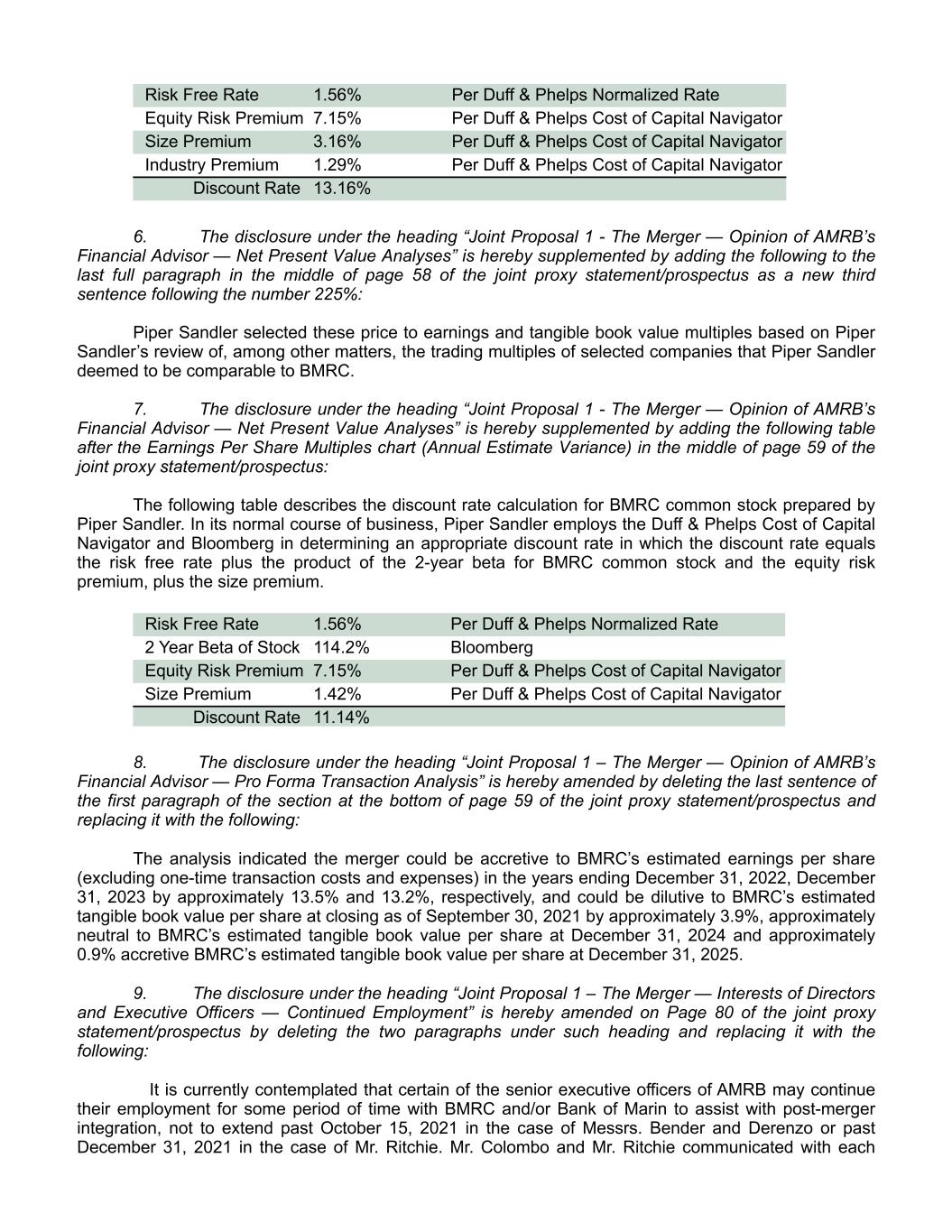 Risk Free Rate 1.56% Per Duff & Phelps Normalized Rate Equity Risk Premium 7.15% Per Duff & Phelps Cost of Capital Navigator Size Premium 3.16% Per Duff & Phelps Cost of Capital Navigator Industry Premium 1.29% Per Duff & Phelps Cost of Capital Navigator Discount Rate 13.16% 6. The disclosure under the heading “Joint Proposal 1 - The Merger — Opinion of AMRB’s Financial Advisor — Net Present Value Analyses” is hereby supplemented by adding the following to the last full paragraph in the middle of page 58 of the joint proxy statement/prospectus as a new third sentence following the number 225%: Piper Sandler selected these price to earnings and tangible book value multiples based on Piper Sandler’s review of, among other matters, the trading multiples of selected companies that Piper Sandler deemed to be comparable to BMRC. 7. The disclosure under the heading “Joint Proposal 1 - The Merger — Opinion of AMRB’s Financial Advisor — Net Present Value Analyses” is hereby supplemented by adding the following table after the Earnings Per Share Multiples chart (Annual Estimate Variance) in the middle of page 59 of the joint proxy statement/prospectus: The following table describes the discount rate calculation for BMRC common stock prepared by Piper Sandler. In its normal course of business, Piper Sandler employs the Duff & Phelps Cost of Capital Navigator and Bloomberg in determining an appropriate discount rate in which the discount rate equals the risk free rate plus the product of the 2-year beta for BMRC common stock and the equity risk premium, plus the size premium. Risk Free Rate 1.56% Per Duff & Phelps Normalized Rate 2 Year Beta of Stock 114.2% Bloomberg Equity Risk Premium 7.15% Per Duff & Phelps Cost of Capital Navigator Size Premium 1.42% Per Duff & Phelps Cost of Capital Navigator Discount Rate 11.14% 8. The disclosure under the heading “Joint Proposal 1 – The Merger — Opinion of AMRB’s Financial Advisor — Pro Forma Transaction Analysis” is hereby amended by deleting the last sentence of the first paragraph of the section at the bottom of page 59 of the joint proxy statement/prospectus and replacing it with the following: The analysis indicated the merger could be accretive to BMRC’s estimated earnings per share (excluding one-time transaction costs and expenses) in the years ending December 31, 2022, December 31, 2023 by approximately 13.5% and 13.2%, respectively, and could be dilutive to BMRC’s estimated tangible book value per share at closing as of September 30, 2021 by approximately 3.9%, approximately neutral to BMRC’s estimated tangible book value per share at December 31, 2024 and approximately 0.9% accretive BMRC’s estimated tangible book value per share at December 31, 2025. 9. The disclosure under the heading “Joint Proposal 1 – The Merger — Interests of Directors and Executive Officers — Continued Employment” is hereby amended on Page 80 of the joint proxy statement/prospectus by deleting the two paragraphs under such heading and replacing it with the following: It is currently contemplated that certain of the senior executive officers of AMRB may continue their employment for some period of time with BMRC and/or Bank of Marin to assist with post-merger integration, not to extend past October 15, 2021 in the case of Messrs. Bender and Derenzo or past December 31, 2021 in the case of Mr. Ritchie. Mr. Colombo and Mr. Ritchie communicated with each