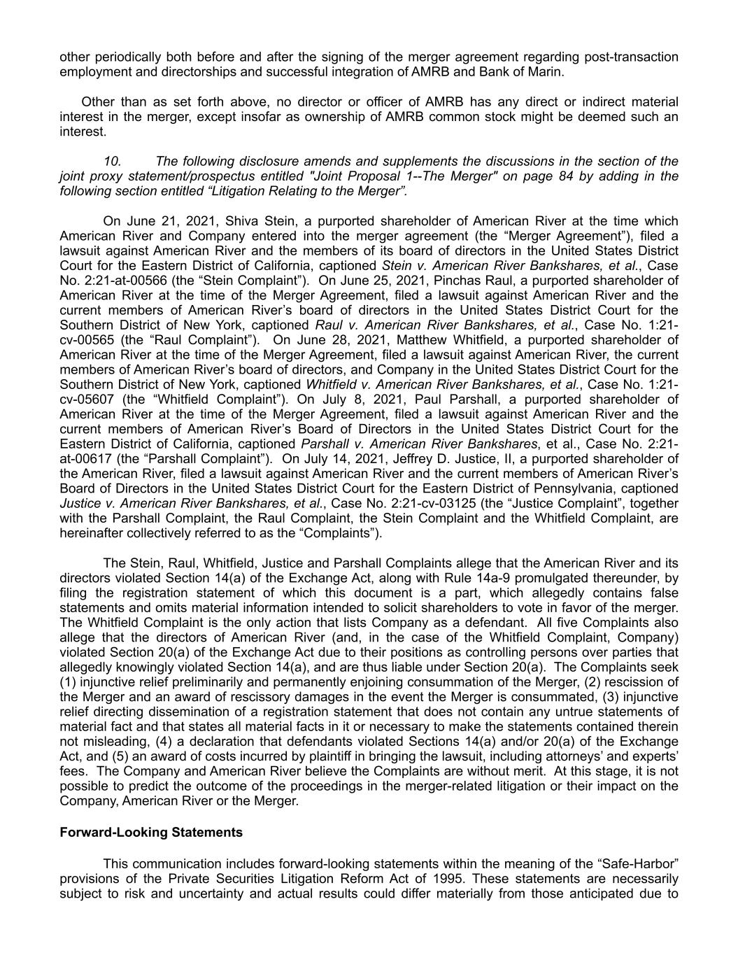 other periodically both before and after the signing of the merger agreement regarding post-transaction employment and directorships and successful integration of AMRB and Bank of Marin. Other than as set forth above, no director or officer of AMRB has any direct or indirect material interest in the merger, except insofar as ownership of AMRB common stock might be deemed such an interest. 10. The following disclosure amends and supplements the discussions in the section of the joint proxy statement/prospectus entitled "Joint Proposal 1--The Merger" on page 84 by adding in the following section entitled “Litigation Relating to the Merger”. On June 21, 2021, Shiva Stein, a purported shareholder of American River at the time which American River and Company entered into the merger agreement (the “Merger Agreement”), filed a lawsuit against American River and the members of its board of directors in the United States District Court for the Eastern District of California, captioned Stein v. American River Bankshares, et al., Case No. 2:21-at-00566 (the “Stein Complaint”). On June 25, 2021, Pinchas Raul, a purported shareholder of American River at the time of the Merger Agreement, filed a lawsuit against American River and the current members of American River’s board of directors in the United States District Court for the Southern District of New York, captioned Raul v. American River Bankshares, et al., Case No. 1:21- cv-00565 (the “Raul Complaint”). On June 28, 2021, Matthew Whitfield, a purported shareholder of American River at the time of the Merger Agreement, filed a lawsuit against American River, the current members of American River’s board of directors, and Company in the United States District Court for the Southern District of New York, captioned Whitfield v. American River Bankshares, et al., Case No. 1:21- cv-05607 (the “Whitfield Complaint”). On July 8, 2021, Paul Parshall, a purported shareholder of American River at the time of the Merger Agreement, filed a lawsuit against American River and the current members of American River’s Board of Directors in the United States District Court for the Eastern District of California, captioned Parshall v. American River Bankshares, et al., Case No. 2:21- at-00617 (the “Parshall Complaint”). On July 14, 2021, Jeffrey D. Justice, II, a purported shareholder of the American River, filed a lawsuit against American River and the current members of American River’s Board of Directors in the United States District Court for the Eastern District of Pennsylvania, captioned Justice v. American River Bankshares, et al., Case No. 2:21-cv-03125 (the “Justice Complaint”, together with the Parshall Complaint, the Raul Complaint, the Stein Complaint and the Whitfield Complaint, are hereinafter collectively referred to as the “Complaints”). The Stein, Raul, Whitfield, Justice and Parshall Complaints allege that the American River and its directors violated Section 14(a) of the Exchange Act, along with Rule 14a-9 promulgated thereunder, by filing the registration statement of which this document is a part, which allegedly contains false statements and omits material information intended to solicit shareholders to vote in favor of the merger. The Whitfield Complaint is the only action that lists Company as a defendant. All five Complaints also allege that the directors of American River (and, in the case of the Whitfield Complaint, Company) violated Section 20(a) of the Exchange Act due to their positions as controlling persons over parties that allegedly knowingly violated Section 14(a), and are thus liable under Section 20(a). The Complaints seek (1) injunctive relief preliminarily and permanently enjoining consummation of the Merger, (2) rescission of the Merger and an award of rescissory damages in the event the Merger is consummated, (3) injunctive relief directing dissemination of a registration statement that does not contain any untrue statements of material fact and that states all material facts in it or necessary to make the statements contained therein not misleading, (4) a declaration that defendants violated Sections 14(a) and/or 20(a) of the Exchange Act, and (5) an award of costs incurred by plaintiff in bringing the lawsuit, including attorneys’ and experts’ fees. The Company and American River believe the Complaints are without merit. At this stage, it is not possible to predict the outcome of the proceedings in the merger-related litigation or their impact on the Company, American River or the Merger. Forward-Looking Statements This communication includes forward-looking statements within the meaning of the “Safe-Harbor” provisions of the Private Securities Litigation Reform Act of 1995. These statements are necessarily subject to risk and uncertainty and actual results could differ materially from those anticipated due to