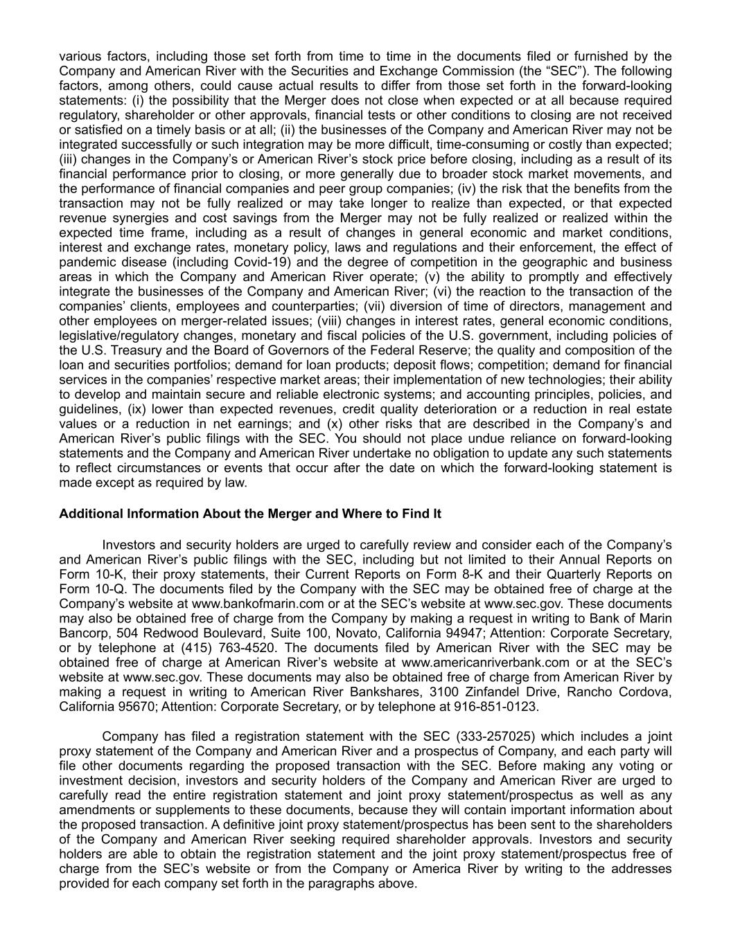 various factors, including those set forth from time to time in the documents filed or furnished by the Company and American River with the Securities and Exchange Commission (the “SEC”). The following factors, among others, could cause actual results to differ from those set forth in the forward-looking statements: (i) the possibility that the Merger does not close when expected or at all because required regulatory, shareholder or other approvals, financial tests or other conditions to closing are not received or satisfied on a timely basis or at all; (ii) the businesses of the Company and American River may not be integrated successfully or such integration may be more difficult, time-consuming or costly than expected; (iii) changes in the Company’s or American River’s stock price before closing, including as a result of its financial performance prior to closing, or more generally due to broader stock market movements, and the performance of financial companies and peer group companies; (iv) the risk that the benefits from the transaction may not be fully realized or may take longer to realize than expected, or that expected revenue synergies and cost savings from the Merger may not be fully realized or realized within the expected time frame, including as a result of changes in general economic and market conditions, interest and exchange rates, monetary policy, laws and regulations and their enforcement, the effect of pandemic disease (including Covid-19) and the degree of competition in the geographic and business areas in which the Company and American River operate; (v) the ability to promptly and effectively integrate the businesses of the Company and American River; (vi) the reaction to the transaction of the companies’ clients, employees and counterparties; (vii) diversion of time of directors, management and other employees on merger-related issues; (viii) changes in interest rates, general economic conditions, legislative/regulatory changes, monetary and fiscal policies of the U.S. government, including policies of the U.S. Treasury and the Board of Governors of the Federal Reserve; the quality and composition of the loan and securities portfolios; demand for loan products; deposit flows; competition; demand for financial services in the companies’ respective market areas; their implementation of new technologies; their ability to develop and maintain secure and reliable electronic systems; and accounting principles, policies, and guidelines, (ix) lower than expected revenues, credit quality deterioration or a reduction in real estate values or a reduction in net earnings; and (x) other risks that are described in the Company’s and American River’s public filings with the SEC. You should not place undue reliance on forward-looking statements and the Company and American River undertake no obligation to update any such statements to reflect circumstances or events that occur after the date on which the forward-looking statement is made except as required by law. Additional Information About the Merger and Where to Find It Investors and security holders are urged to carefully review and consider each of the Company’s and American River’s public filings with the SEC, including but not limited to their Annual Reports on Form 10-K, their proxy statements, their Current Reports on Form 8-K and their Quarterly Reports on Form 10-Q. The documents filed by the Company with the SEC may be obtained free of charge at the Company’s website at www.bankofmarin.com or at the SEC’s website at www.sec.gov. These documents may also be obtained free of charge from the Company by making a request in writing to Bank of Marin Bancorp, 504 Redwood Boulevard, Suite 100, Novato, California 94947; Attention: Corporate Secretary, or by telephone at (415) 763-4520. The documents filed by American River with the SEC may be obtained free of charge at American River’s website at www.americanriverbank.com or at the SEC’s website at www.sec.gov. These documents may also be obtained free of charge from American River by making a request in writing to American River Bankshares, 3100 Zinfandel Drive, Rancho Cordova, California 95670; Attention: Corporate Secretary, or by telephone at 916-851-0123. Company has filed a registration statement with the SEC (333-257025) which includes a joint proxy statement of the Company and American River and a prospectus of Company, and each party will file other documents regarding the proposed transaction with the SEC. Before making any voting or investment decision, investors and security holders of the Company and American River are urged to carefully read the entire registration statement and joint proxy statement/prospectus as well as any amendments or supplements to these documents, because they will contain important information about the proposed transaction. A definitive joint proxy statement/prospectus has been sent to the shareholders of the Company and American River seeking required shareholder approvals. Investors and security holders are able to obtain the registration statement and the joint proxy statement/prospectus free of charge from the SEC’s website or from the Company or America River by writing to the addresses provided for each company set forth in the paragraphs above.
