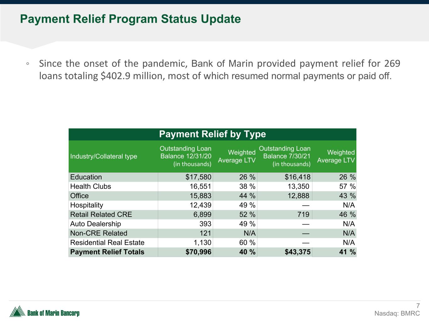 7 Nasdaq: BMRC Payment Relief Program Status Update ◦ Since the onset of the pandemic, Bank of Marin provided payment relief for 269 loans totaling $402.9 million, most of which resumed normal payments or paid off. Payment Relief by Type Industry/Collateral type Outstanding Loan Balance 12/31/20 (in thousands) Weighted Average LTV Outstanding Loan Balance 7/30/21 (in thousands) Weighted Average LTV Education $17,580 26 % $16,418 26 % Health Clubs 16,551 38 % 13,350 57 % Office 15,883 44 % 12,888 43 % Hospitality 12,439 49 % — N/A Retail Related CRE 6,899 52 % 719 46 % Auto Dealership 393 49 % — N/A Non-CRE Related 121 N/A — N/A Residential Real Estate 1,130 60 % — N/A Payment Relief Totals $70,996 40 % $43,375 41 %