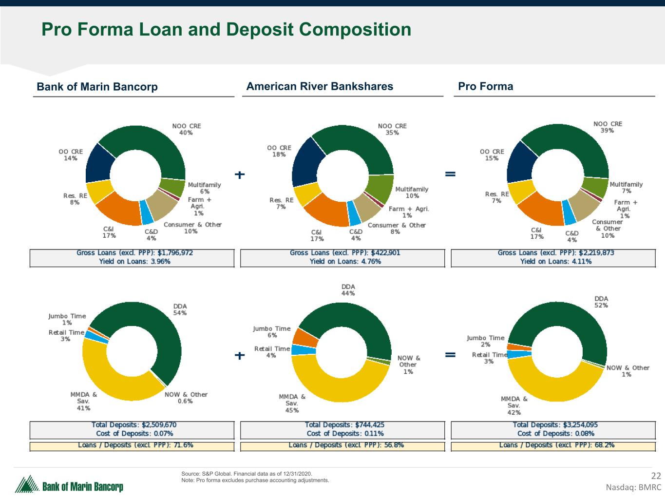 Transaction Assumptions 20 Nasdaq: BMRC 7 89 52 51 153 51 4 39 67 77 77 77 Earnings • ~$3.4 million, or 0.50% of AMRB’s non-time deposits • Amortized sum-of-the-year digits over 10 years Cost Savings Transaction Expenses Fair Market Value Adjustments Core Deposit Intangibles • Consensus earnings estimates for both companies • ~$6.1 million, or 35.0% of AMRB’s standalone noninterest expense base • 25% phase-in during 2021, 90% phase-in during 2022, and 100% thereafter • $9.5 million after-tax or 7.1% of aggregate deal value • Total gross credit mark of $6.6 million, or 1.56% of AMRB’s loan portfolio (excl. PPP) – $0.3 million, or 4.7% of total gross credit mark associated with purchase credit deteriorated (“PCD”) loans, recorded into ACL (5.00% of estimated PCD loans) – $6.3 million, or 95.3% of gross loan credit mark associated with non-PCD loans, recorded as a discount to loan value; amortized into earnings over 4 years (1.52% of non-PCD loans) • Provision expense of $6.3 million to be taken immediately after close, included in pro forma tangible book value • Positive loan interest rate mark of $5.2 million or 1.25% of AMRB’s loan portfolio (excl. PPP); amortized from earnings straight-line over 4 years • AOCI netted for fair market value reduction of $1.5 million pretax; amortized into earnings straight line over 4 years • Fixed asset write-up $1.3 million on AMRB’s Healdsburg branch; 50% depreciated straight-line over 25 years